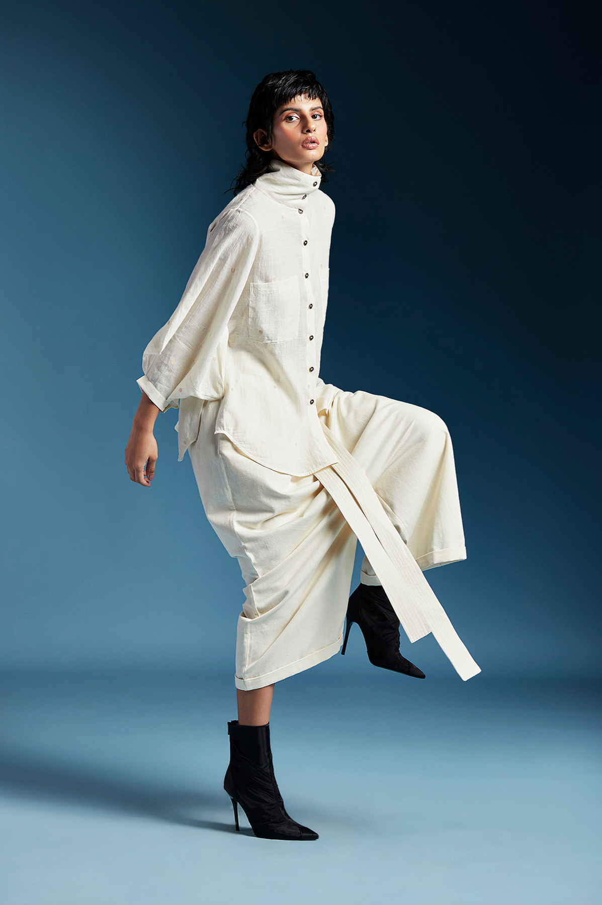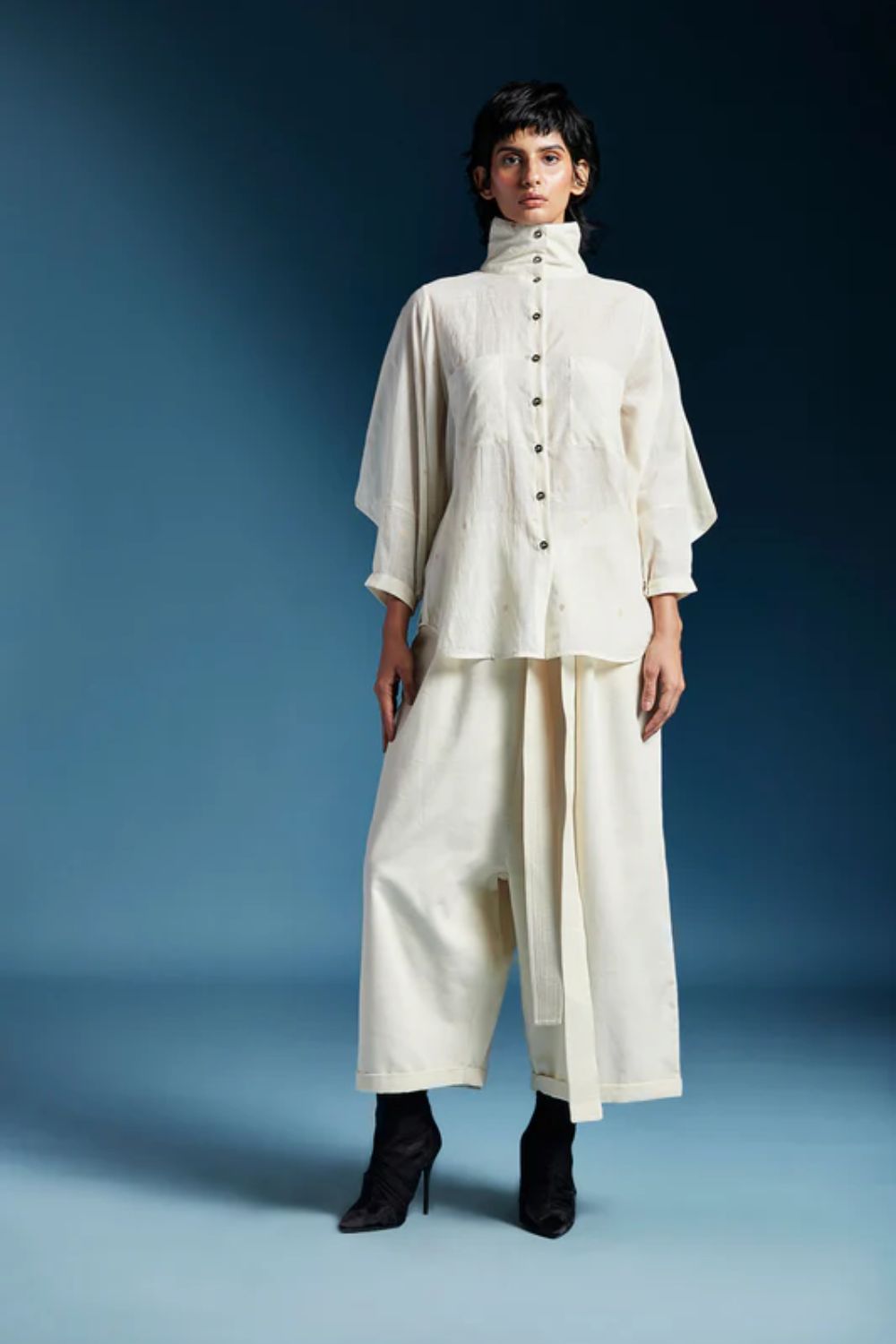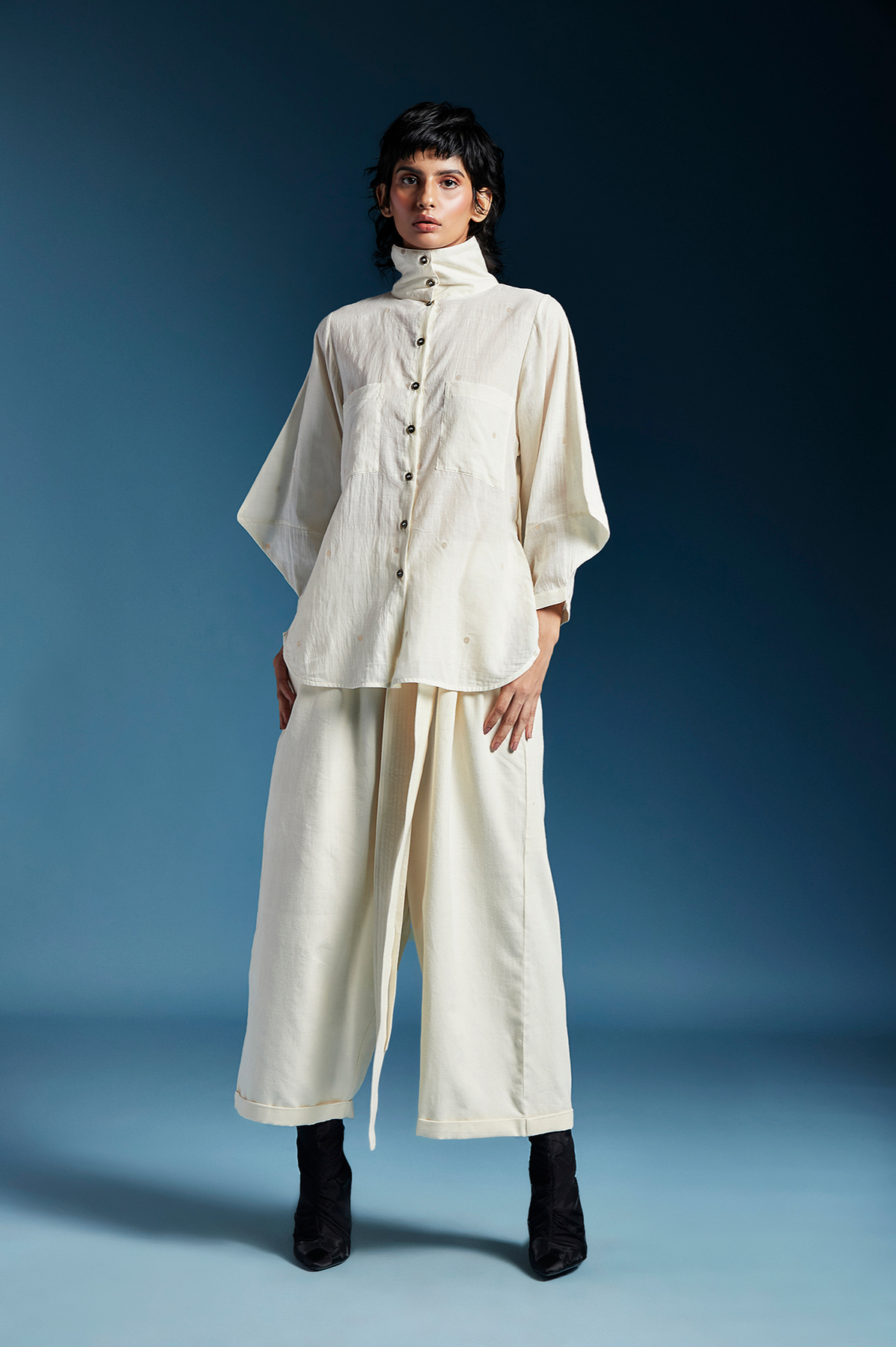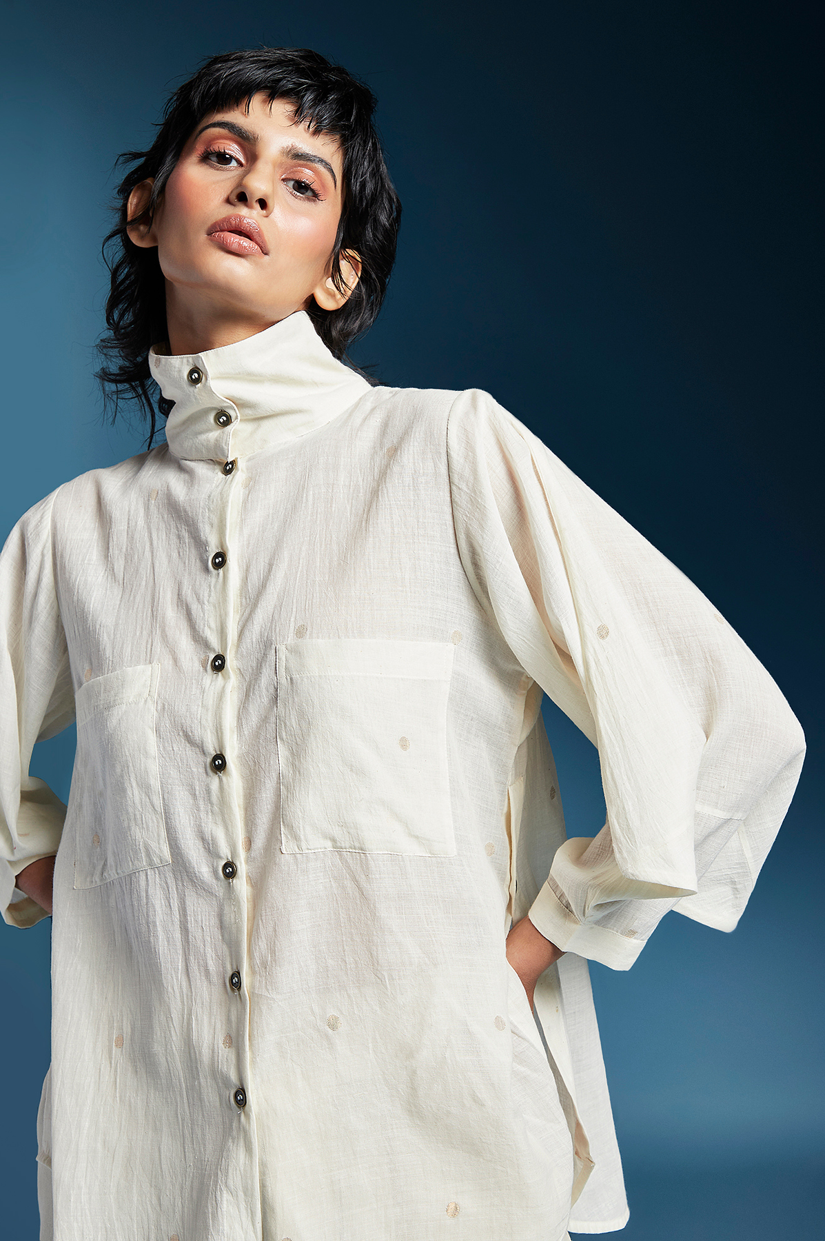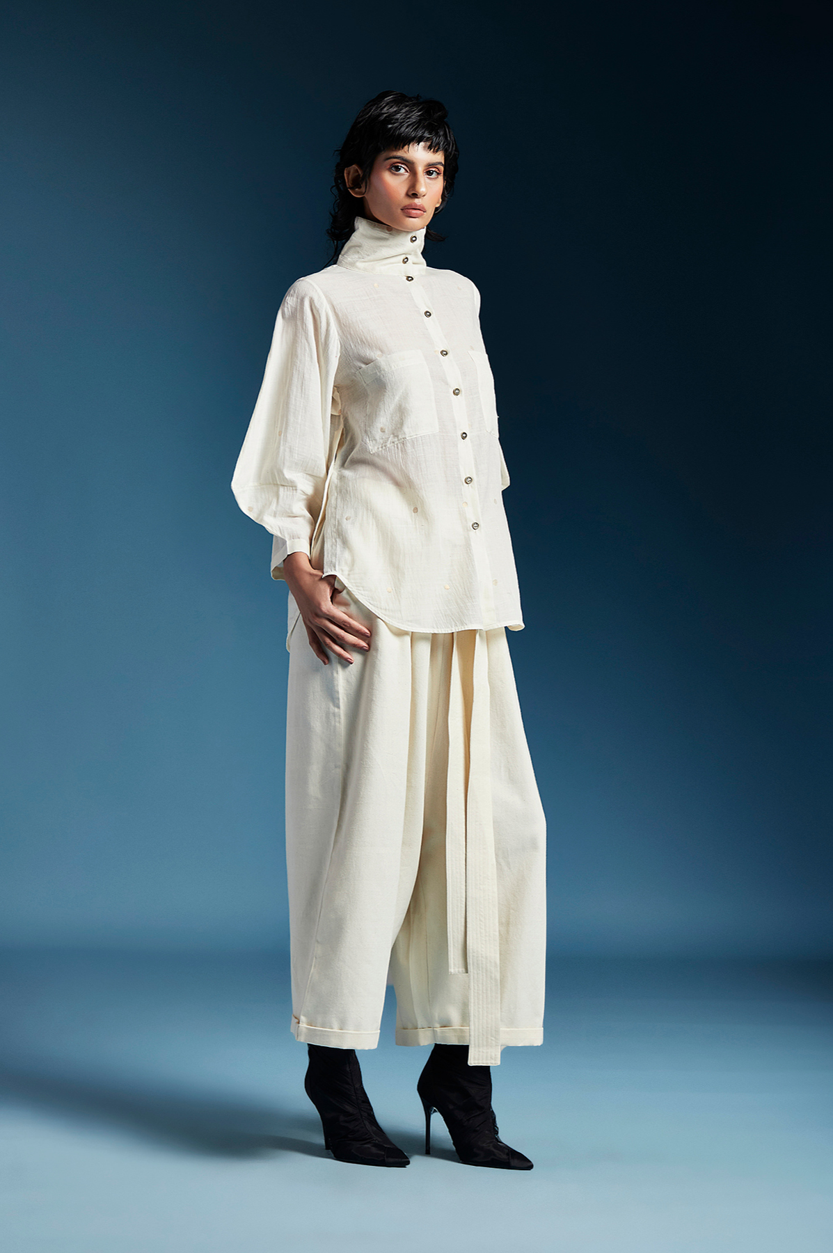 SHIRT WITH HIGH COLLAR, CURVED HEM, BACK FLAP, FRONT, SIDE & BACK BUTTONS, LANTERN SLEEVES & THIN CUFF