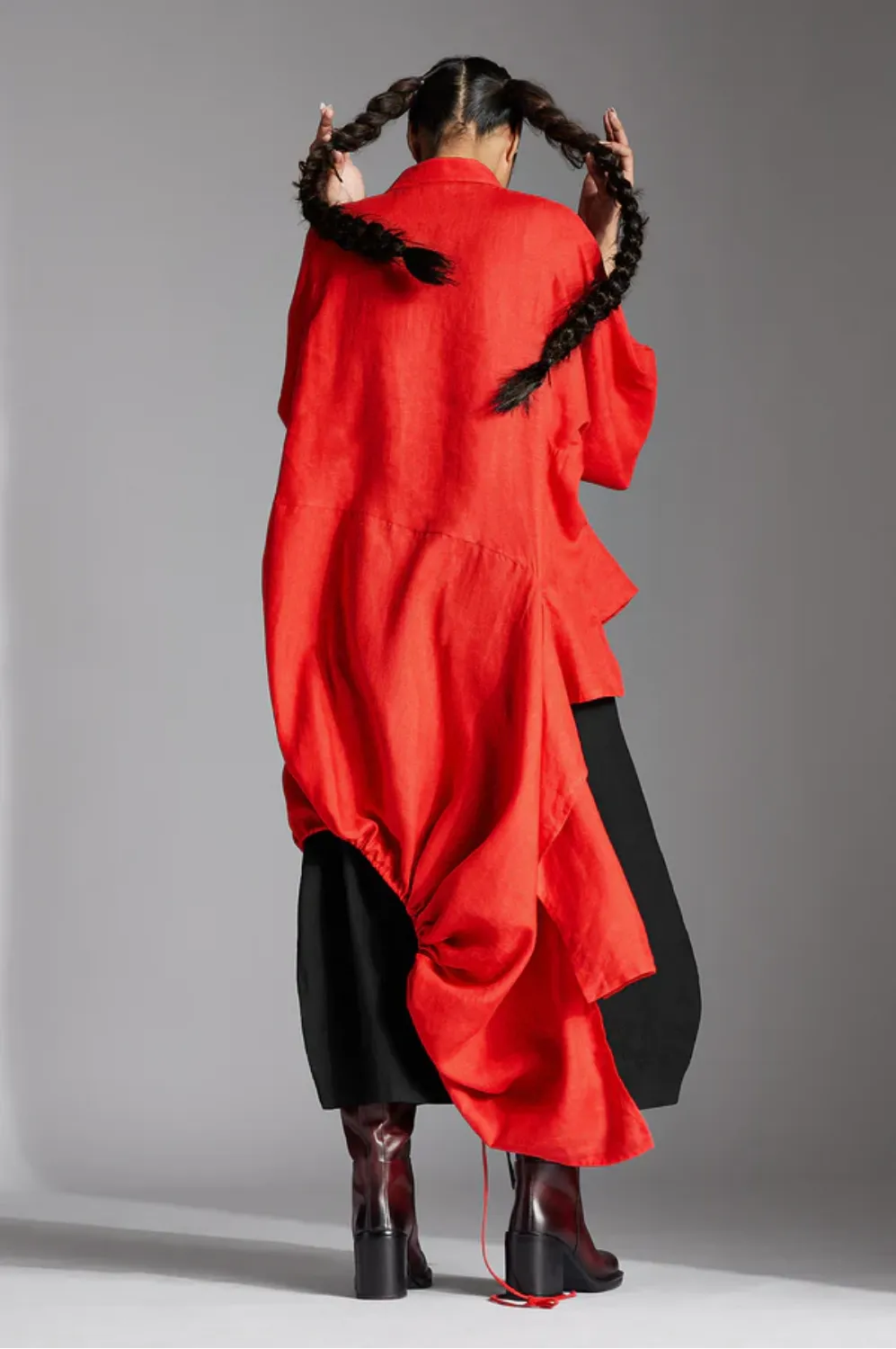 The Orien shirt features a shirt collar, insible extended button placket on the front, box sleeves and a hanging panel with drawstring at the back.