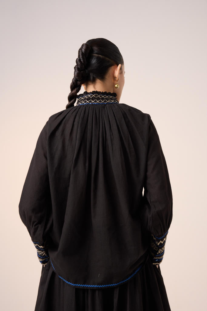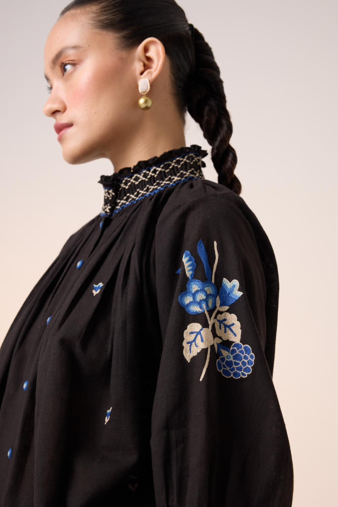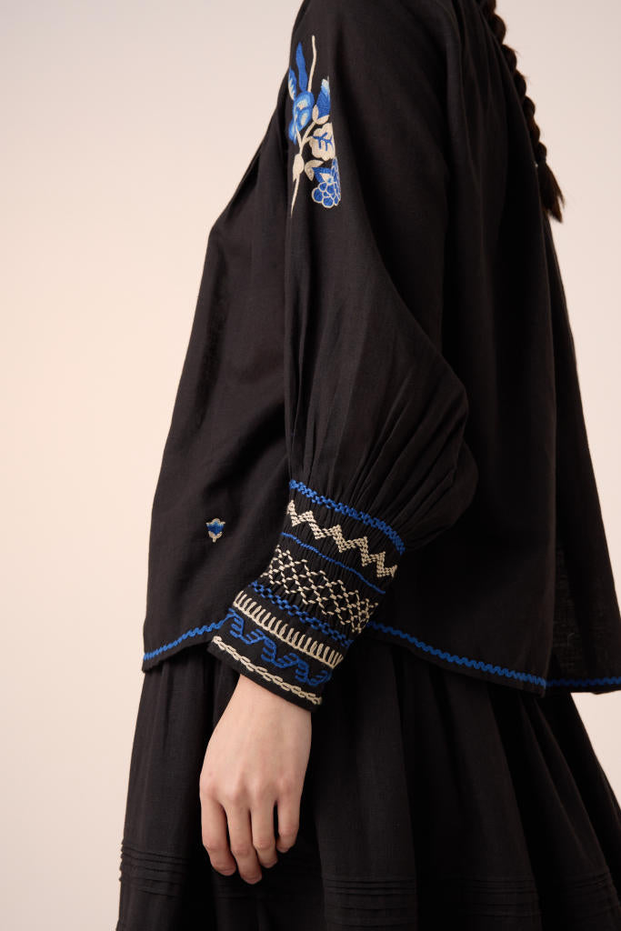 The Farmer Top is made from 100% pure cotton fabric in black. It features hand-smocking details on the neck and embroidery in the front with the bishop sleeves along with front button details.