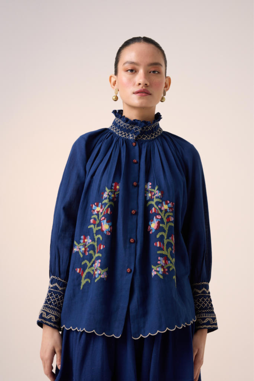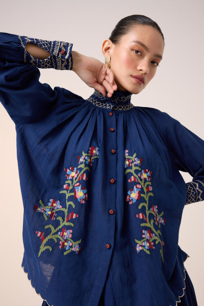 Details: Pixel Embroidery, smocking details on the cuff & neck, front button fastening