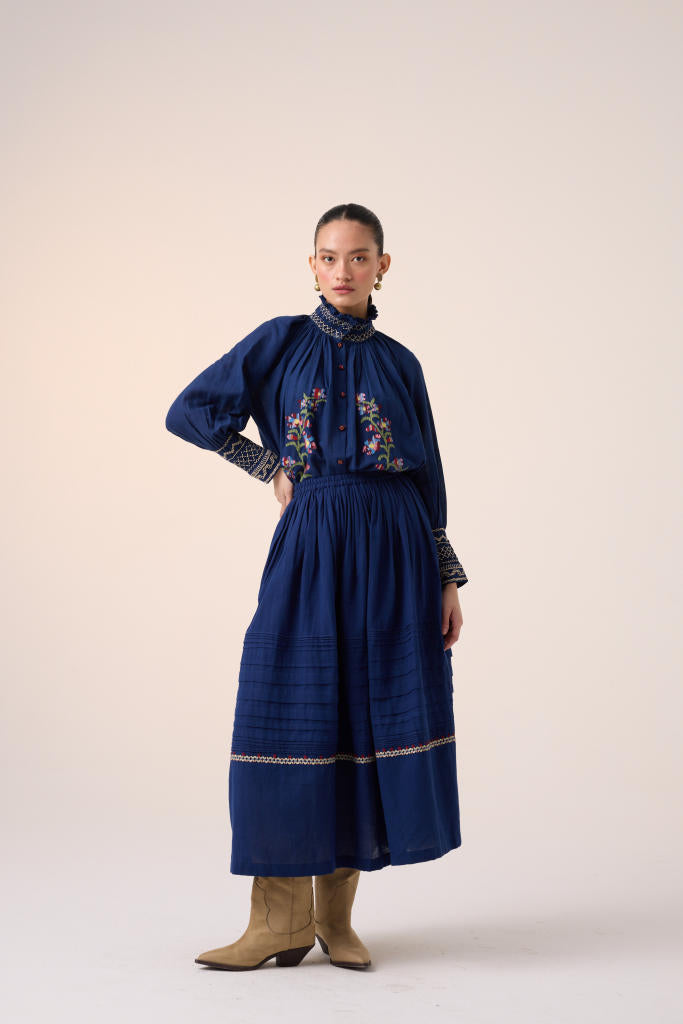 The Farmer Top is made from 100% pure cotton fabric with pixel embroidery. It features hand-smocking details on the neck and the bishop sleeves along with front button details.
