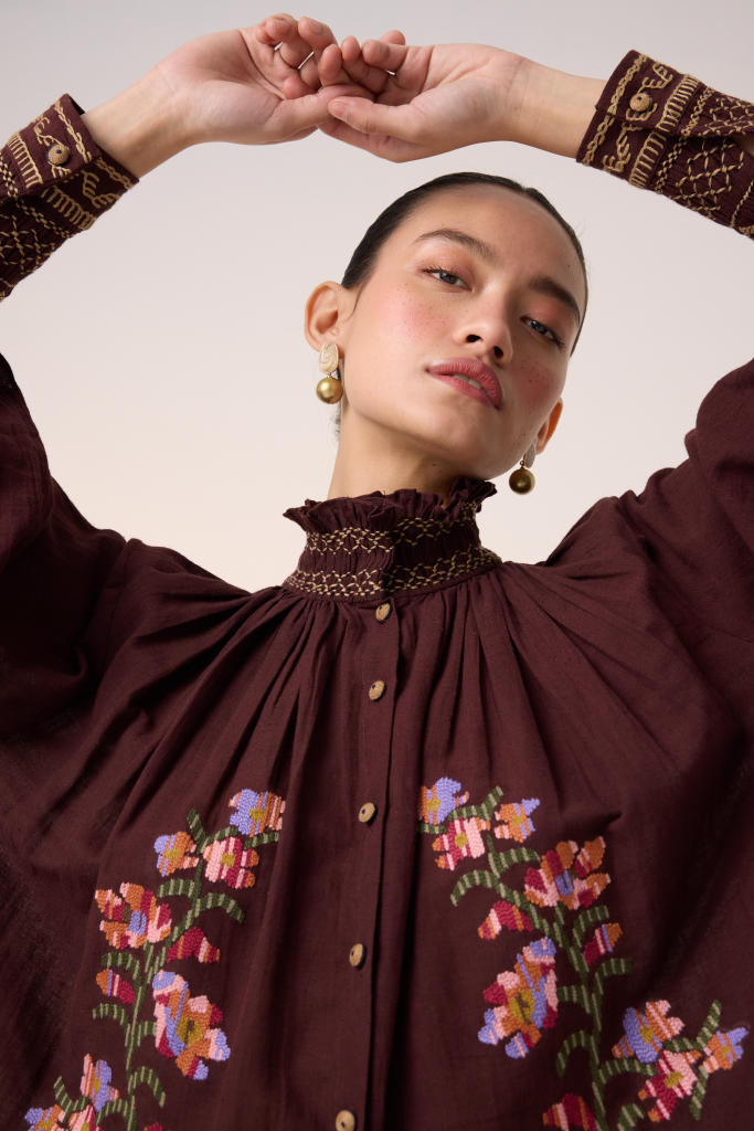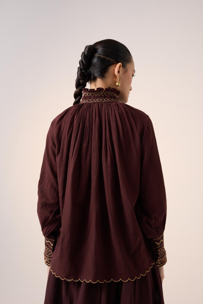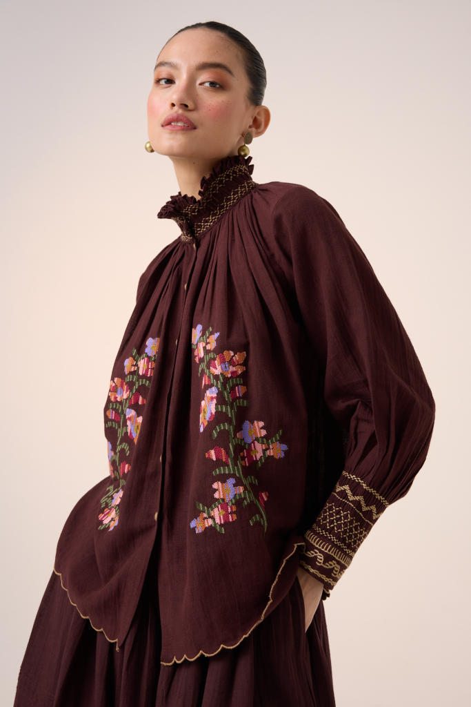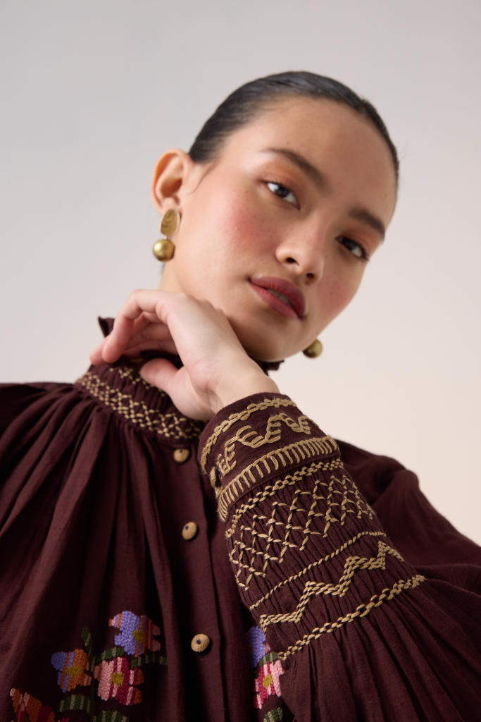 The Farmer Top is made from 100% pure cotton fabric in maroon pixel embroidery. It features hand-smocking details on the neck and pixel embroidery in the front with the bishop sleeves along with front button details.