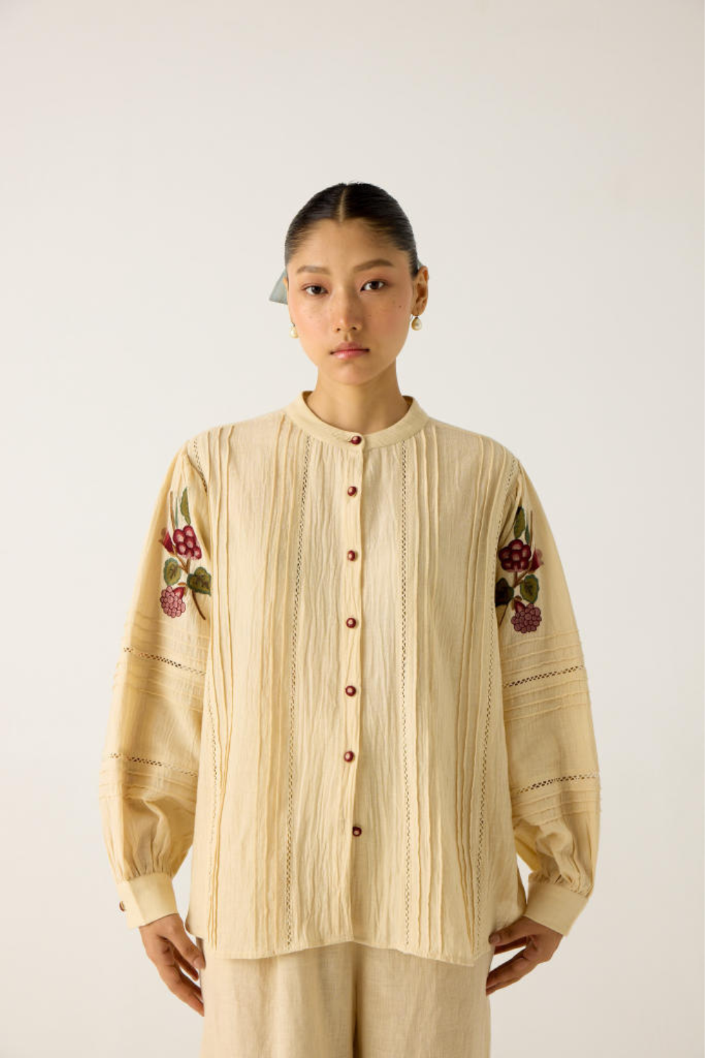 Details: Front button fastening, Lace inserts, Embroidered sleeves