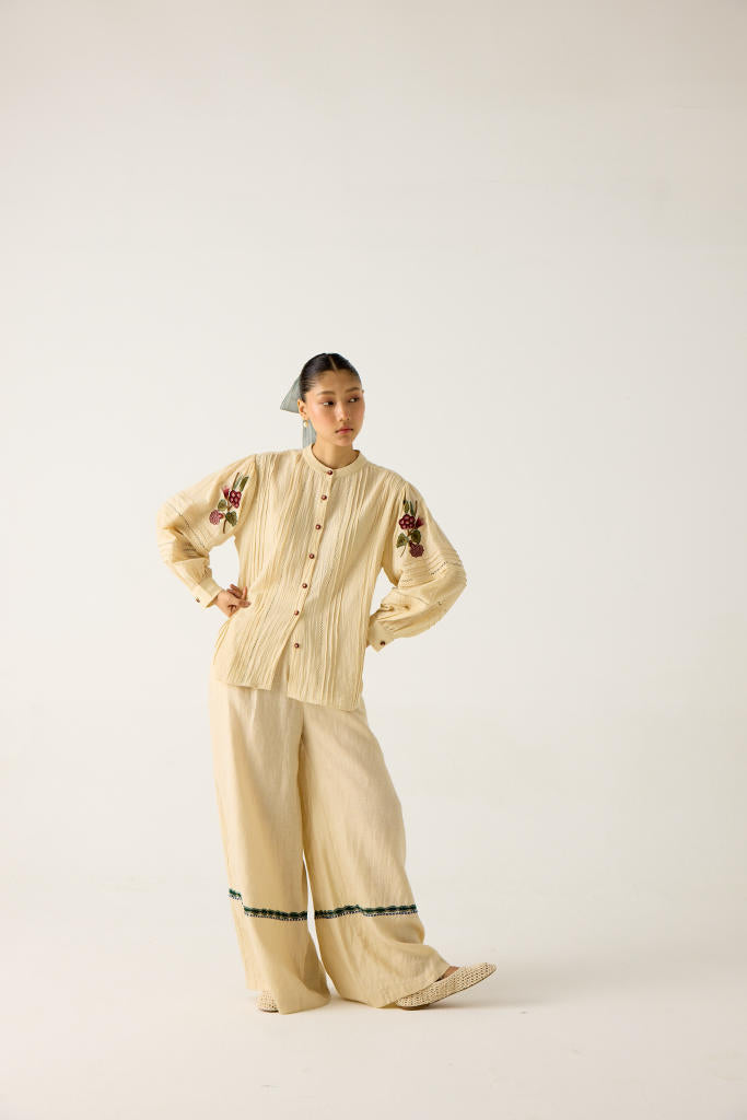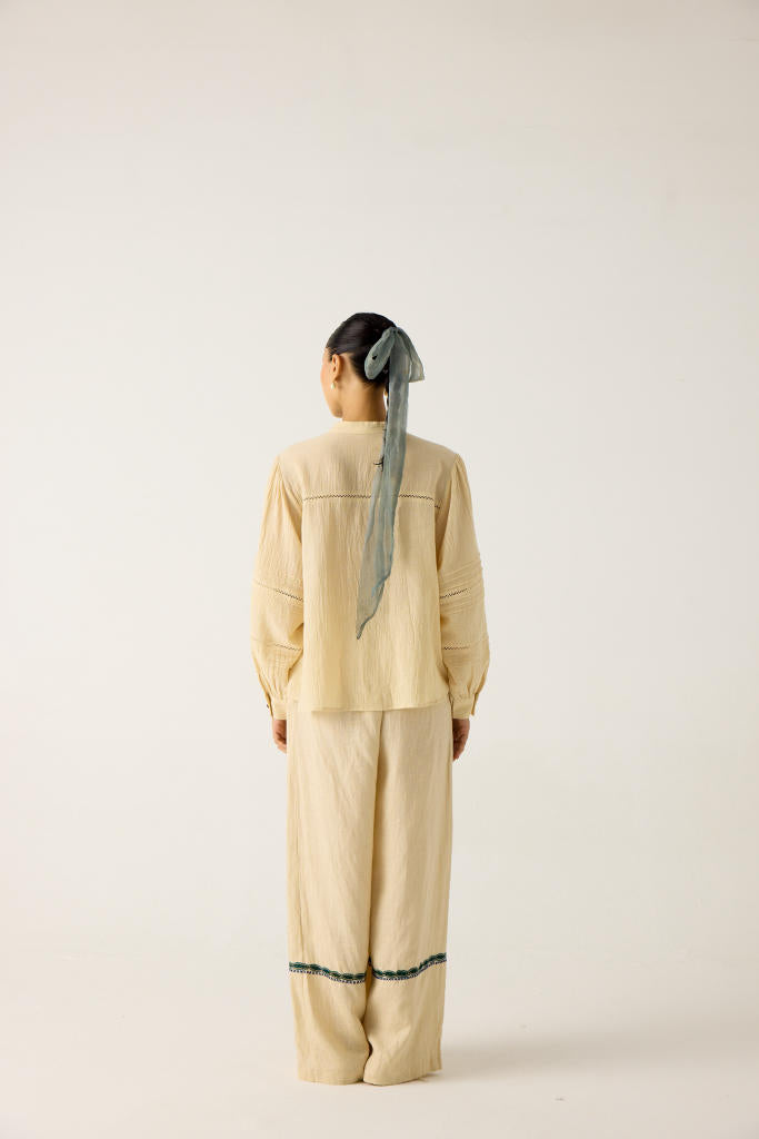 The Hazel top is made from cotton in our foliage print. It features a front button fastening, band collar, bishop full sleeves, contrast lace inserts on the yoke, and embroidered sleeves. It's the perfect staple to mix and match.