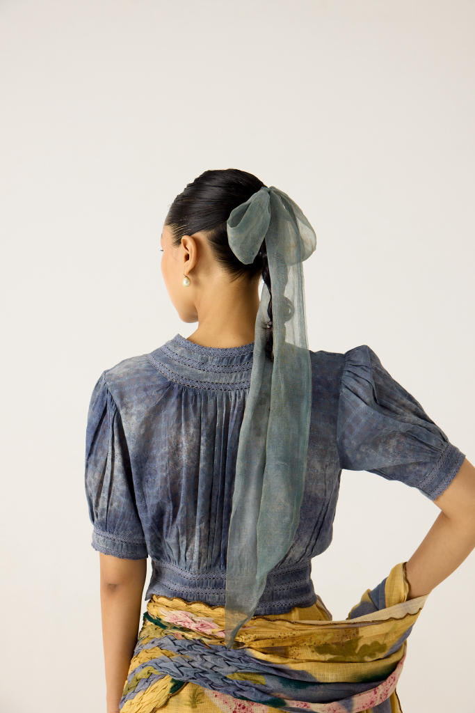 The mila top is a cotton buttoned-up mid-length top with lace inserts on the neck, sleeves and hem made in our indigo print.