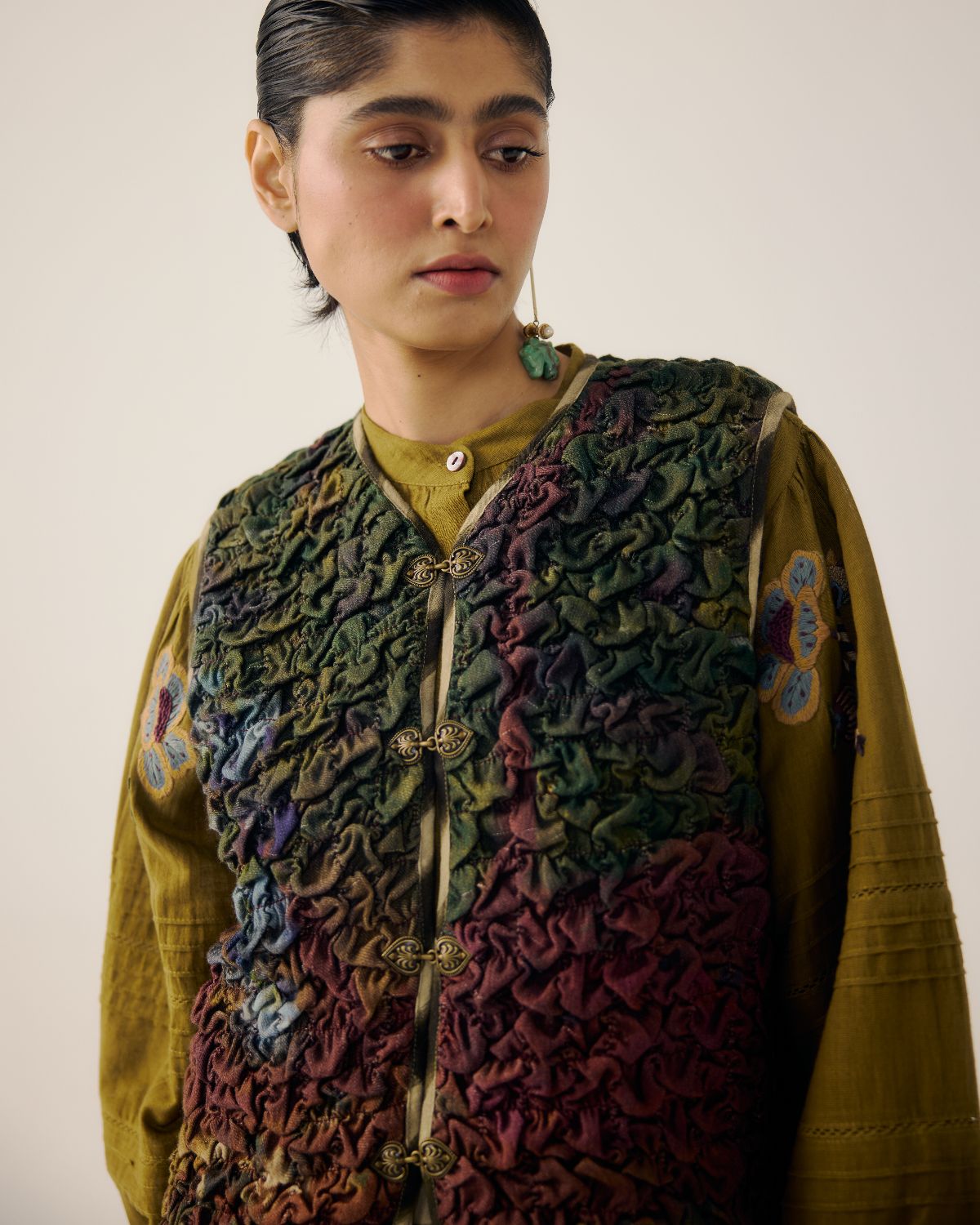 The New Vest features a round neck, contrast piping, elasticated smocking across the bodice, and front button fastening with vintage metal buttons.