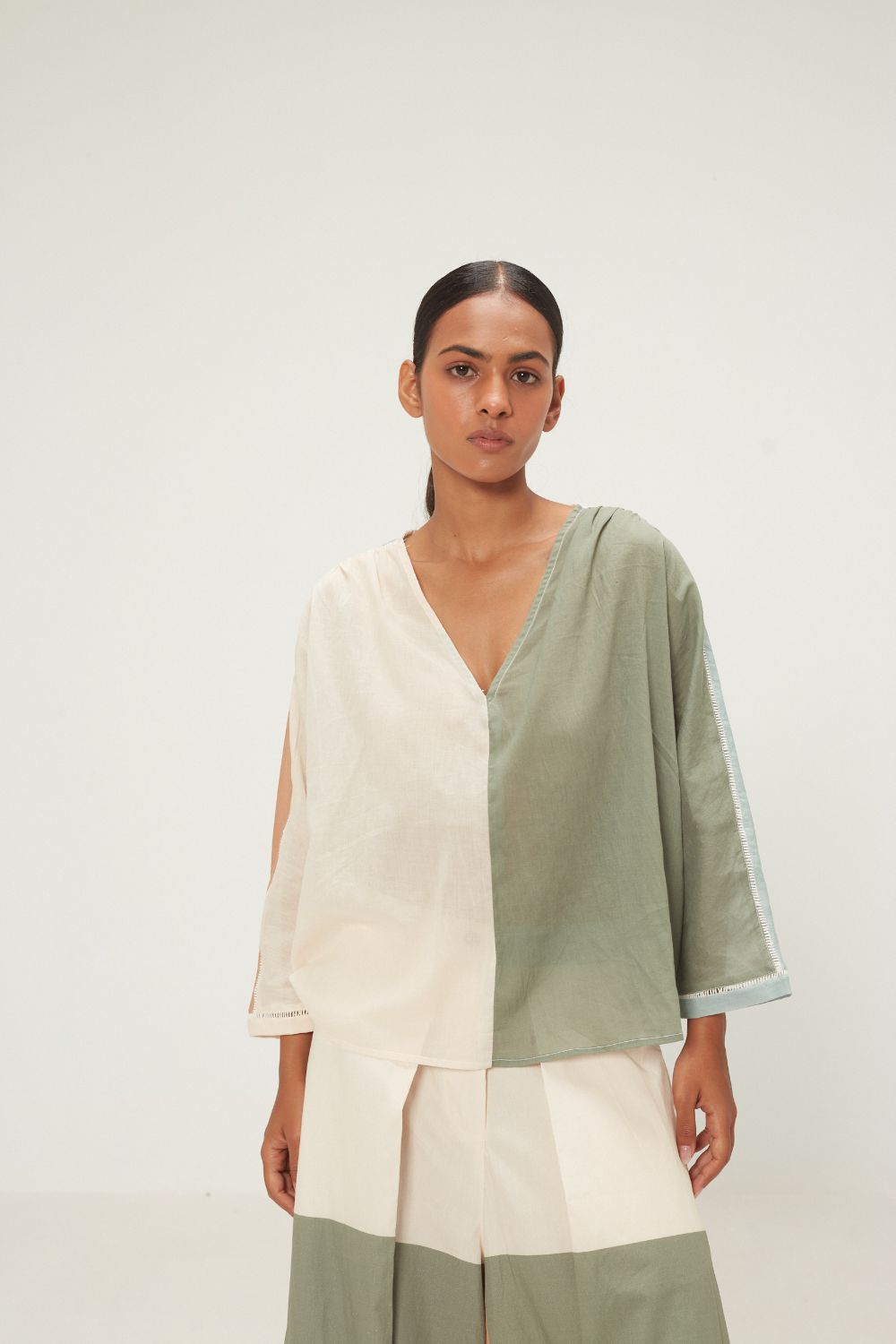 The Teal Dune Top is tailored in soft mul, An anti fit top detailed in color-block panels in soft earthy pastel tones.