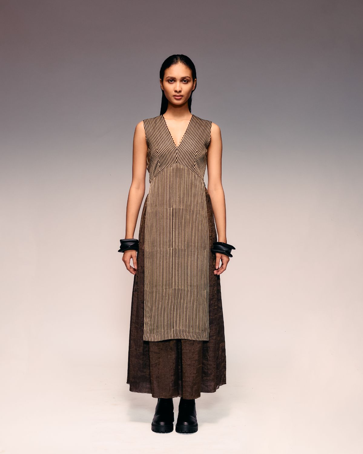 Ajrakh stripes on soft silk-cotton fabric. The side zipper ensures a clean fit, while