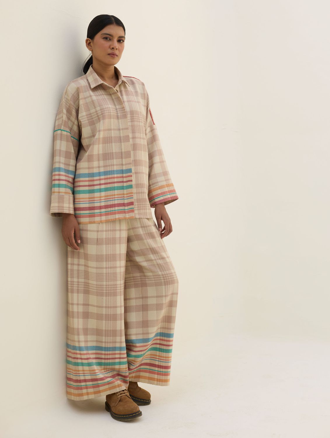 Shirt- The Ellen shirt is handcrafted in our yarn-dyed pure merino wool woven in two-toned checks with a fun multi-coloured striped border. Designed with relaxed dolman sleeves and a clean, concealed placket, Ellen offers a soft structured silhouette that is easy-to-wear and versatile. Woven multi-coloured vibrant stripes are placed thoughtfully on the bodice which is detailed hand-knotted pop-coloured stitch detailing. Ellen is one of our perennial favourites to layer over your favourite turtleneck sweater or pair over denims or our woven merino wool trousers.