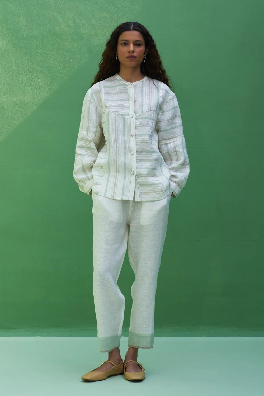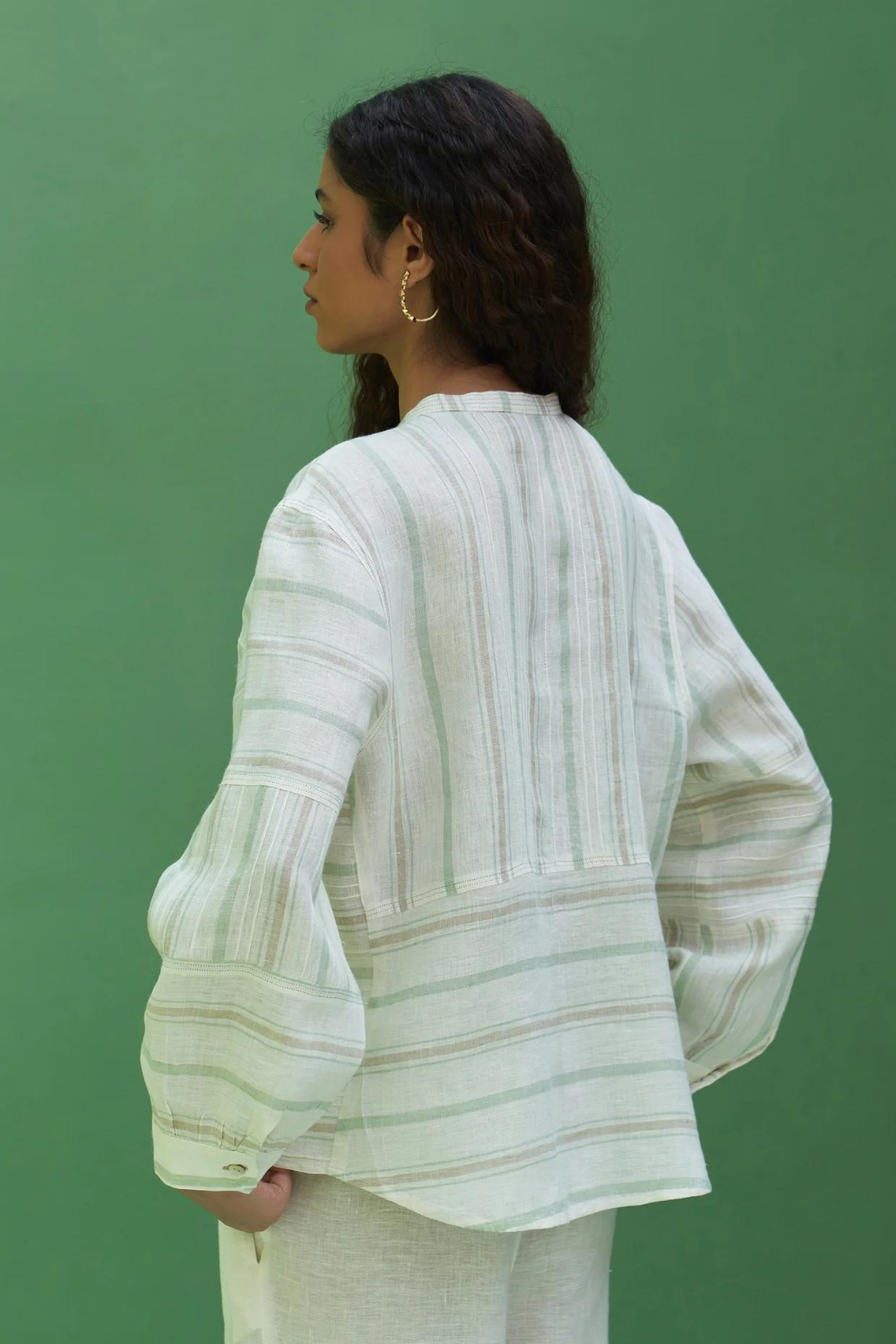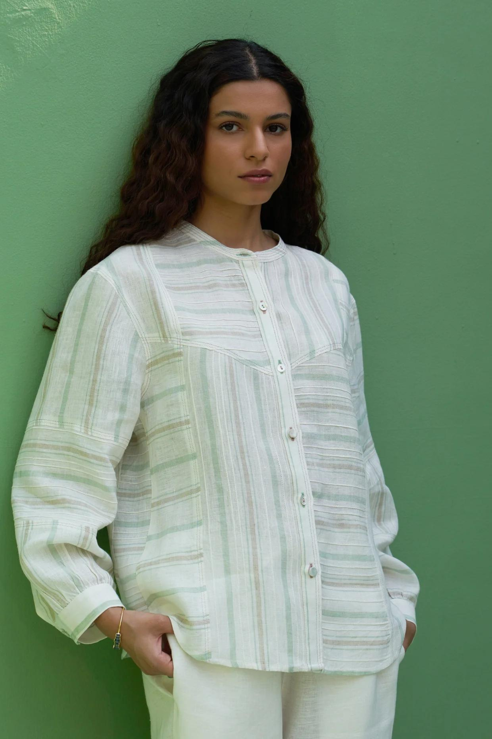 A patchwork mandarin collared shirt in our handloom striped ivory mint linen, detailed with finely placed pintucks, 3/4th sleeves with a slight puff, finished with differently styled buttons and a two coloured topstitch detail.