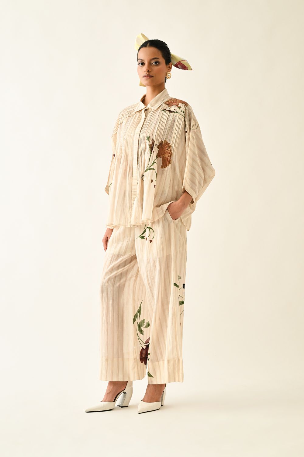 Top: Anti fit, short sleeved top, relaxed fit, vertical pin tucks on front, hand-painted abstract expressionist digitally transferred print, crafted from lightweight textiles. this piece offers both comfort and understated elegance. Print may vary- Single piece.