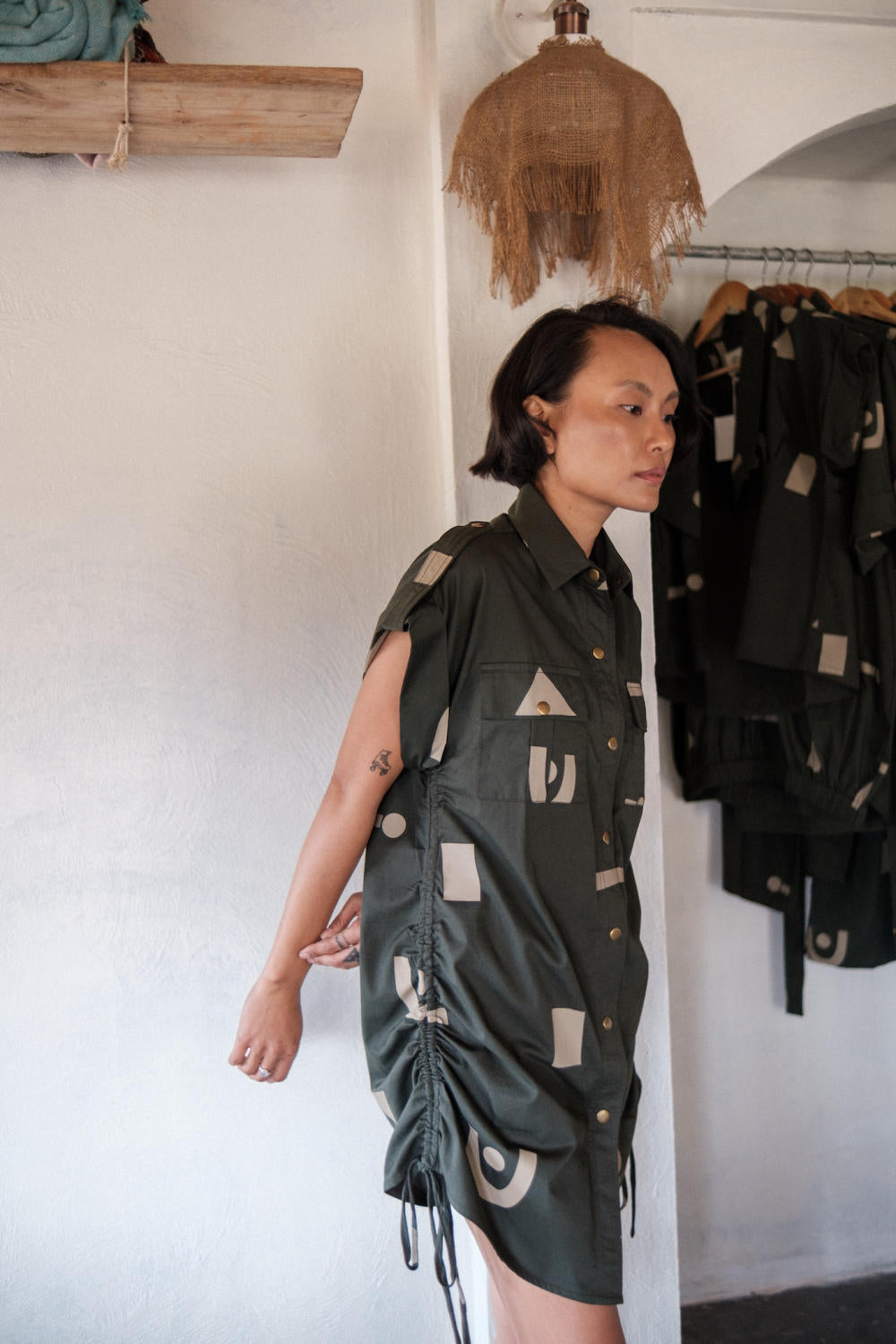 This versatile shirt can be worn as a shirt and as a dress. The side gathers lends an air of sophistication, while the inclusion of patch pockets infuses a street-inspired essence, achieving a harmonious balance of style and comfort.