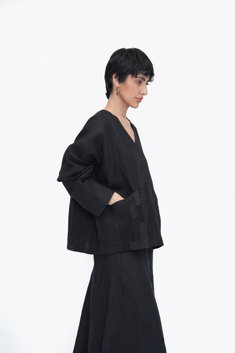 A relaxed-fit women’s top crafted from patchwork fabric made of leftover scraps. Features a V-neckline, full sleeves, front cut pockets, and panelled construction for a unique look. Made with 100% linen and a blend of natural fabrics for breathable comfort.
