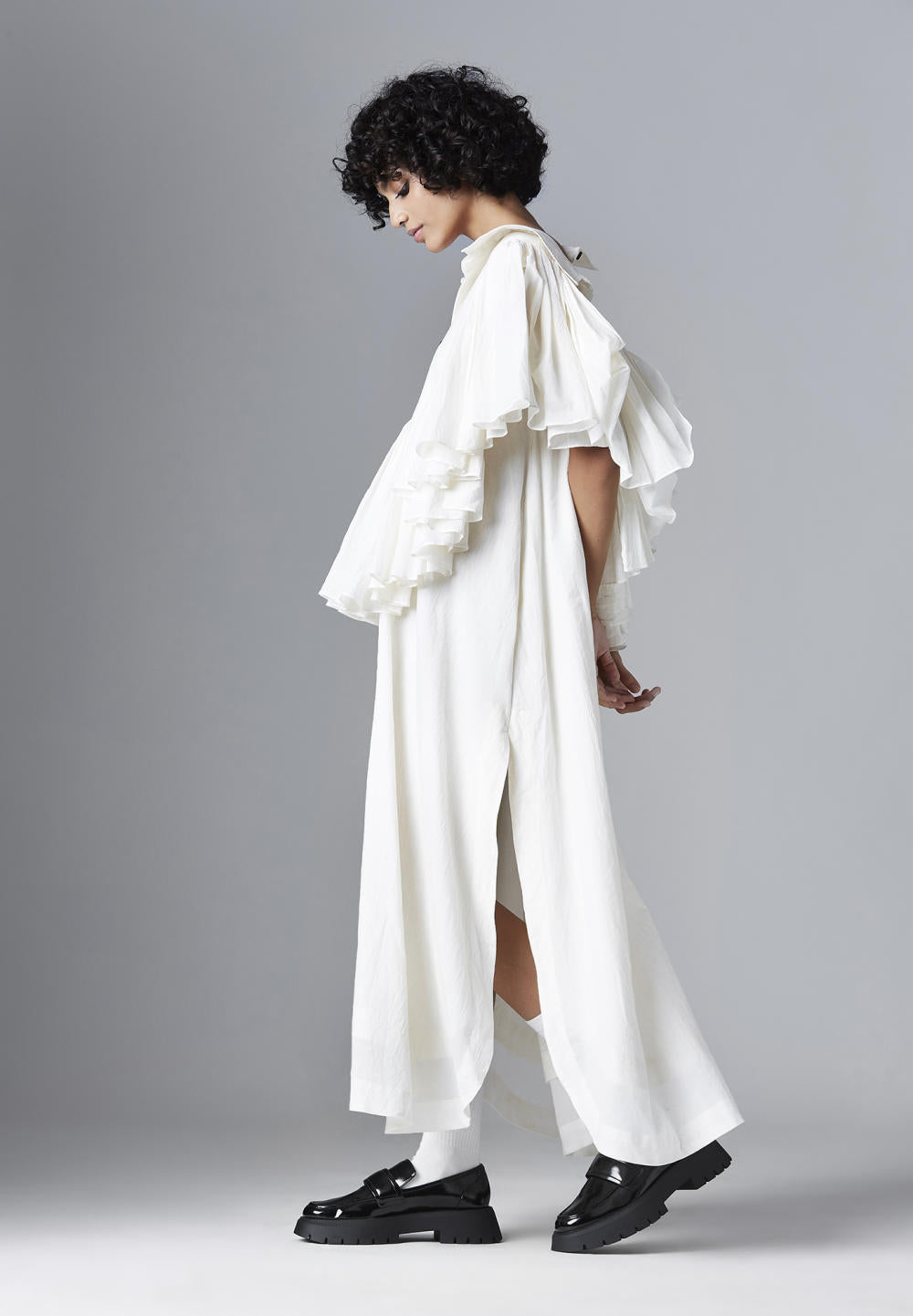 U SHAPED YOKE FRILL DRESS WITH 2 PIECE STAND COLLAR, FRONT AND BACK OPENING WITH U SHAPED HEM