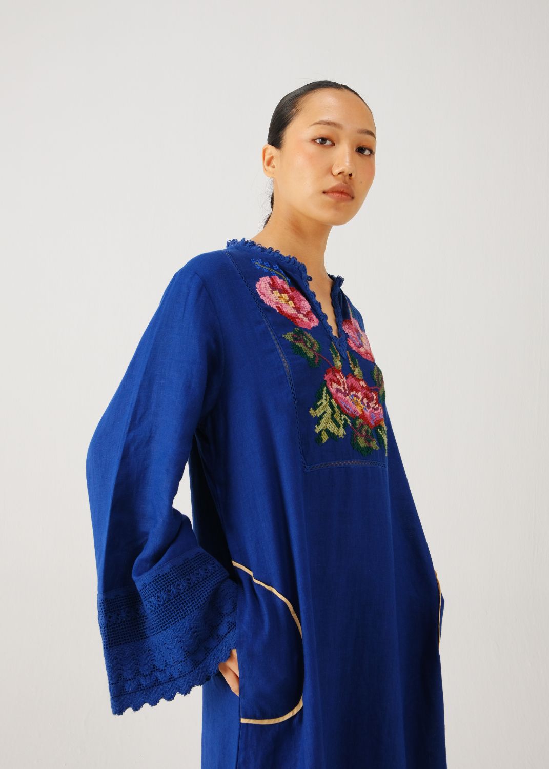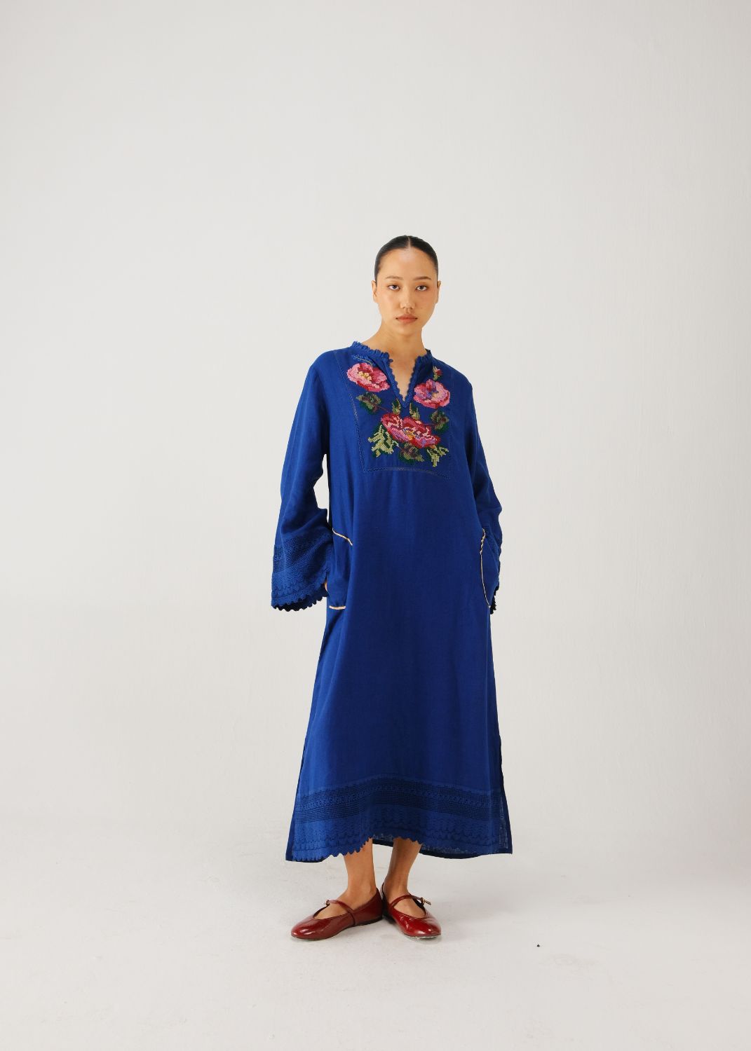 The Jolene Dress is an elegant ankle-length linen dress with a slight A-line structure and dramatic bell sleeves. It features an intensive hand-embroidered cross-stitch on the yoke. Delicate lace adorns the cuffs, hem, and neckline, adding a touch of romance.