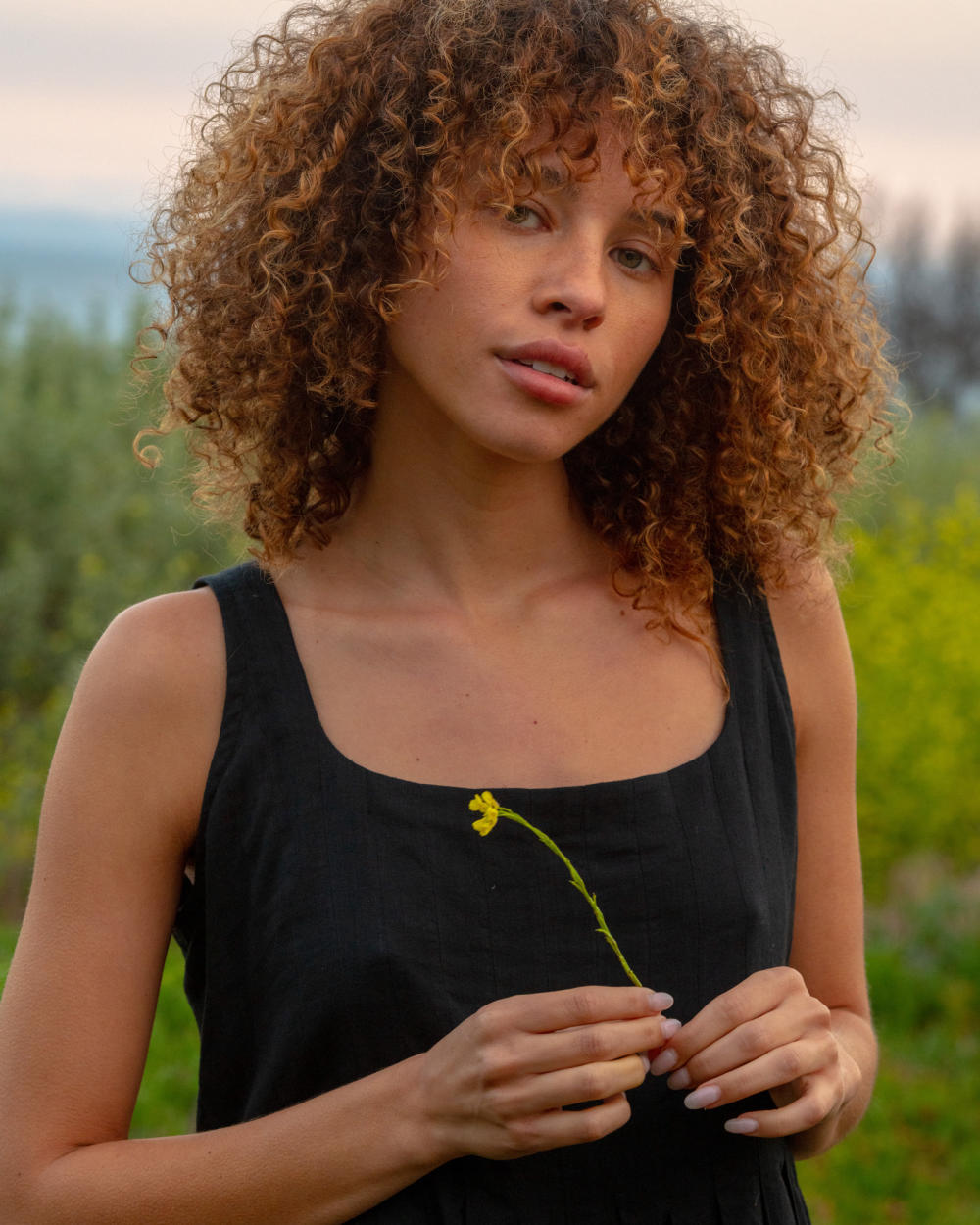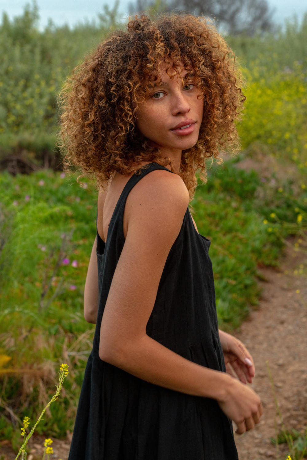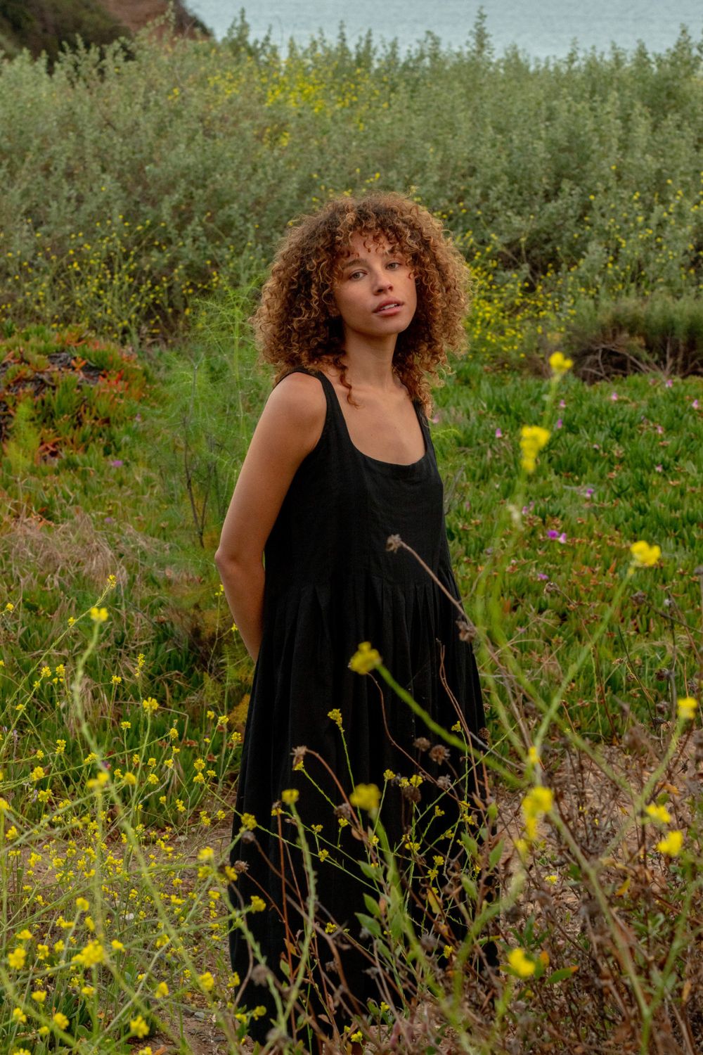 This modern black dress embodies our design ethos with contemporary details. Featuring shoulder straps and a curved square neckline, while pleats around the bust area gracefully cascade down to the hem. Crafted from lightweight and fluid hand-woven cotton fabric, this dress is the perfect choice this summer, offering versatility to dress it up or down as desired.