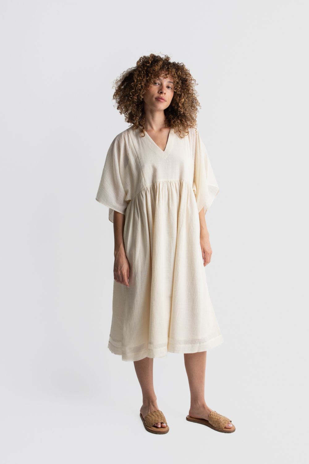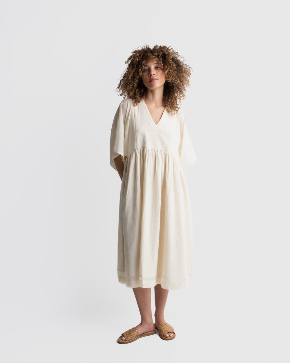 Featuring wide sleeves and a V-neck, this midi dress is made using super soft handwoven cotton. It has soft gathers at the waistline, creating a flattering flowy silhouette. Additionally, our garments are designed with convenient side pockets, adding functionality to your everyday style. Pair it with your favourite sandals to elevate the look.
