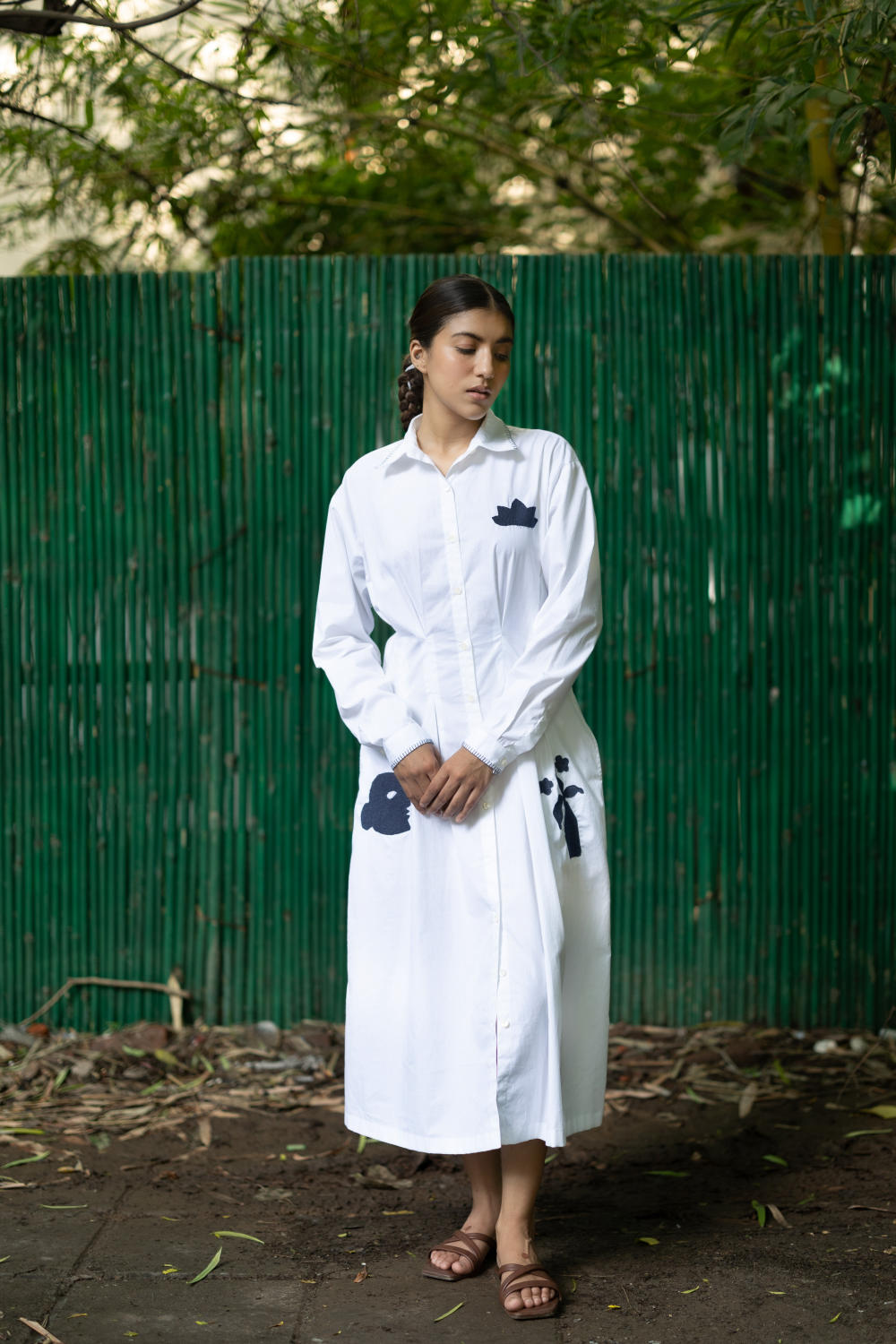 The dress comes with side pockets and applique embroidery to upcycle and uplift discarded fabrics