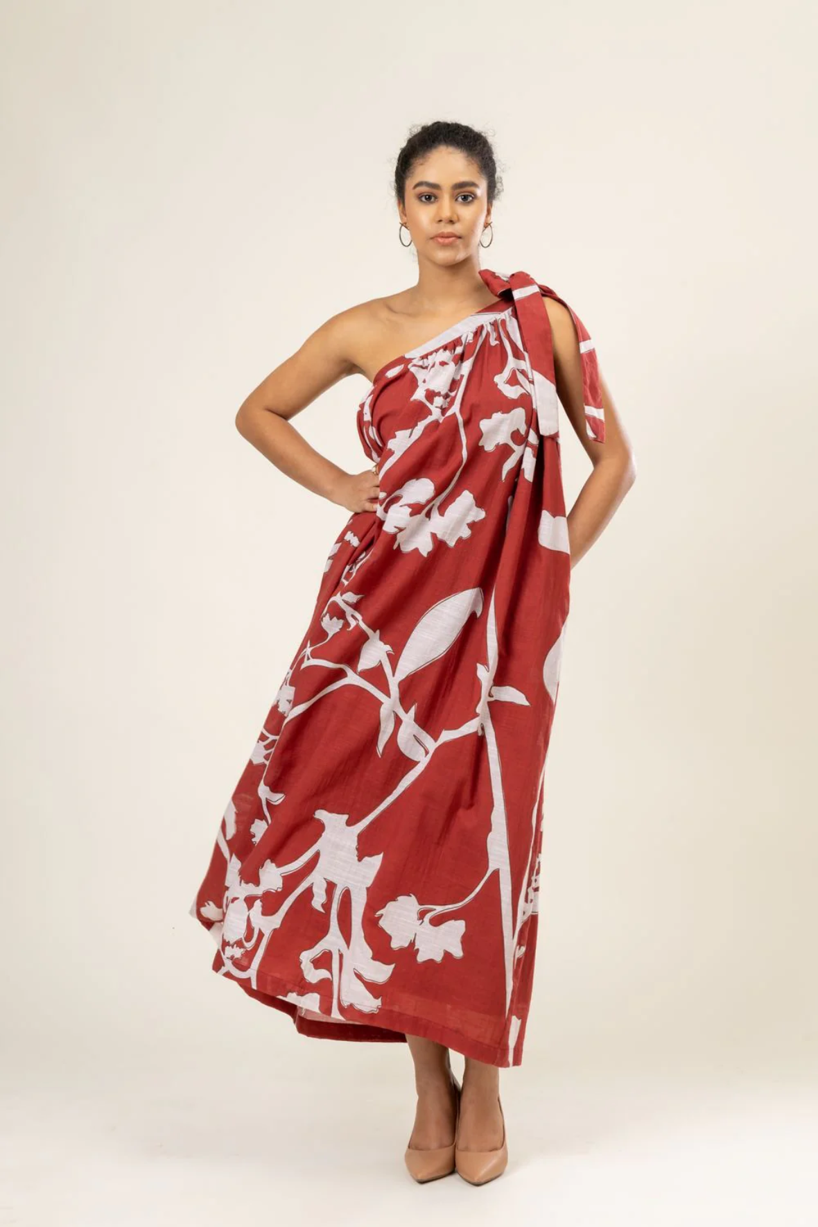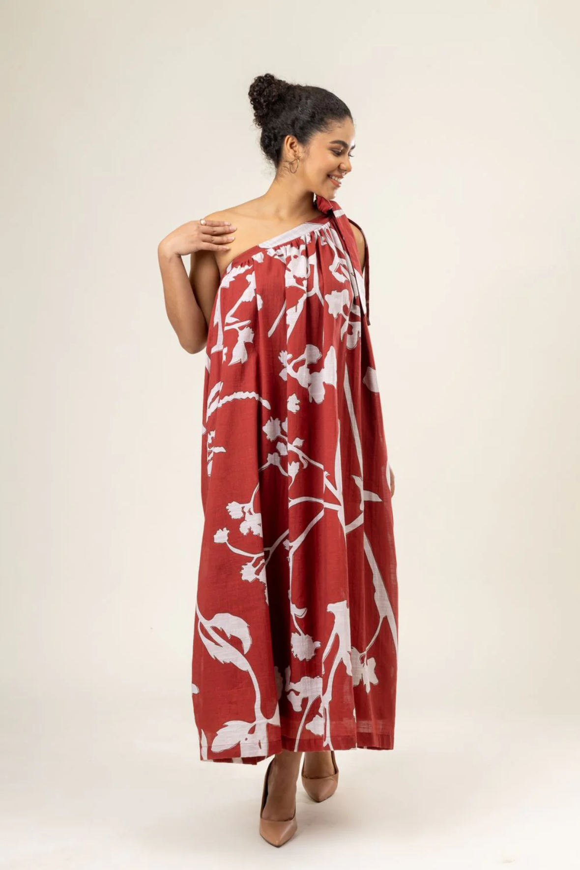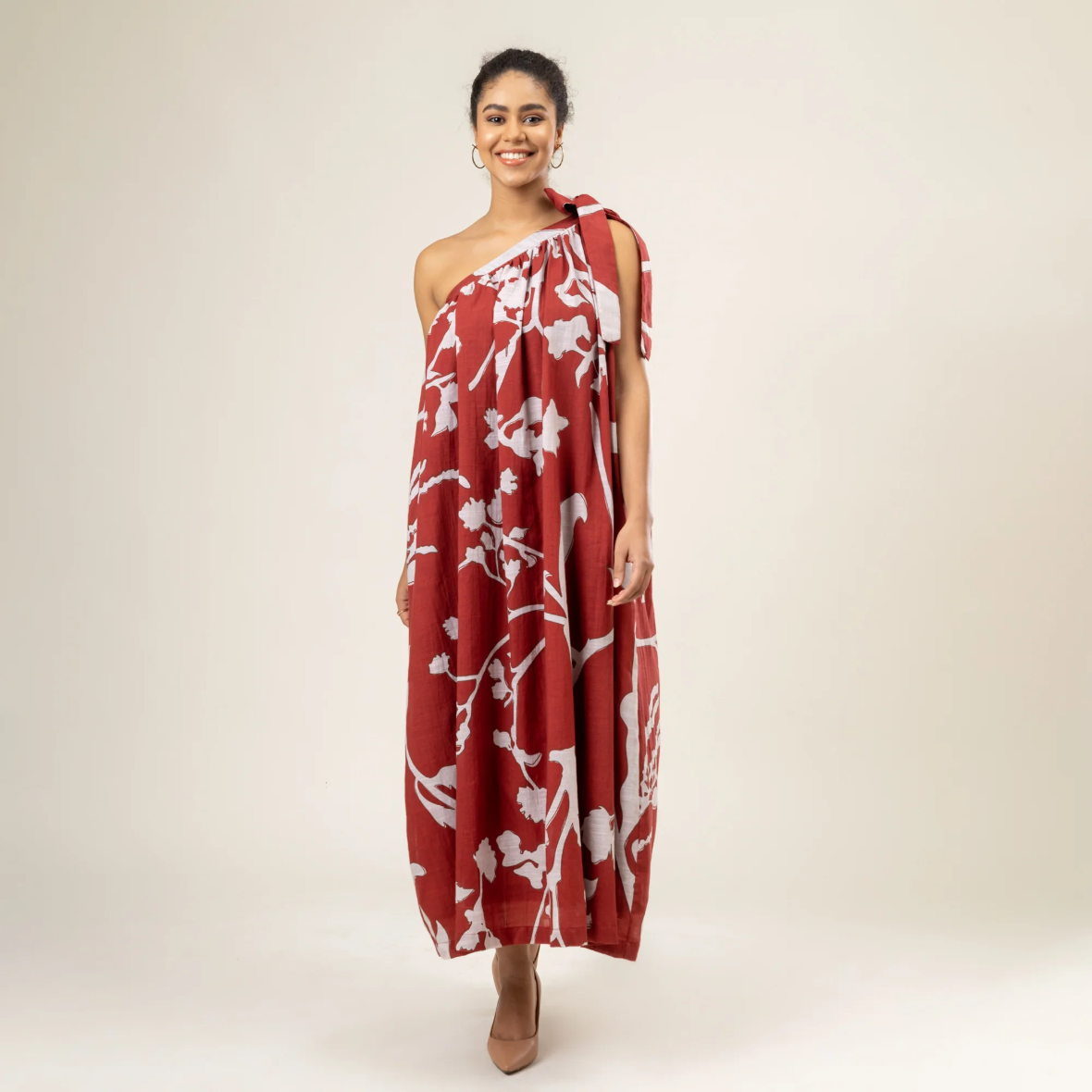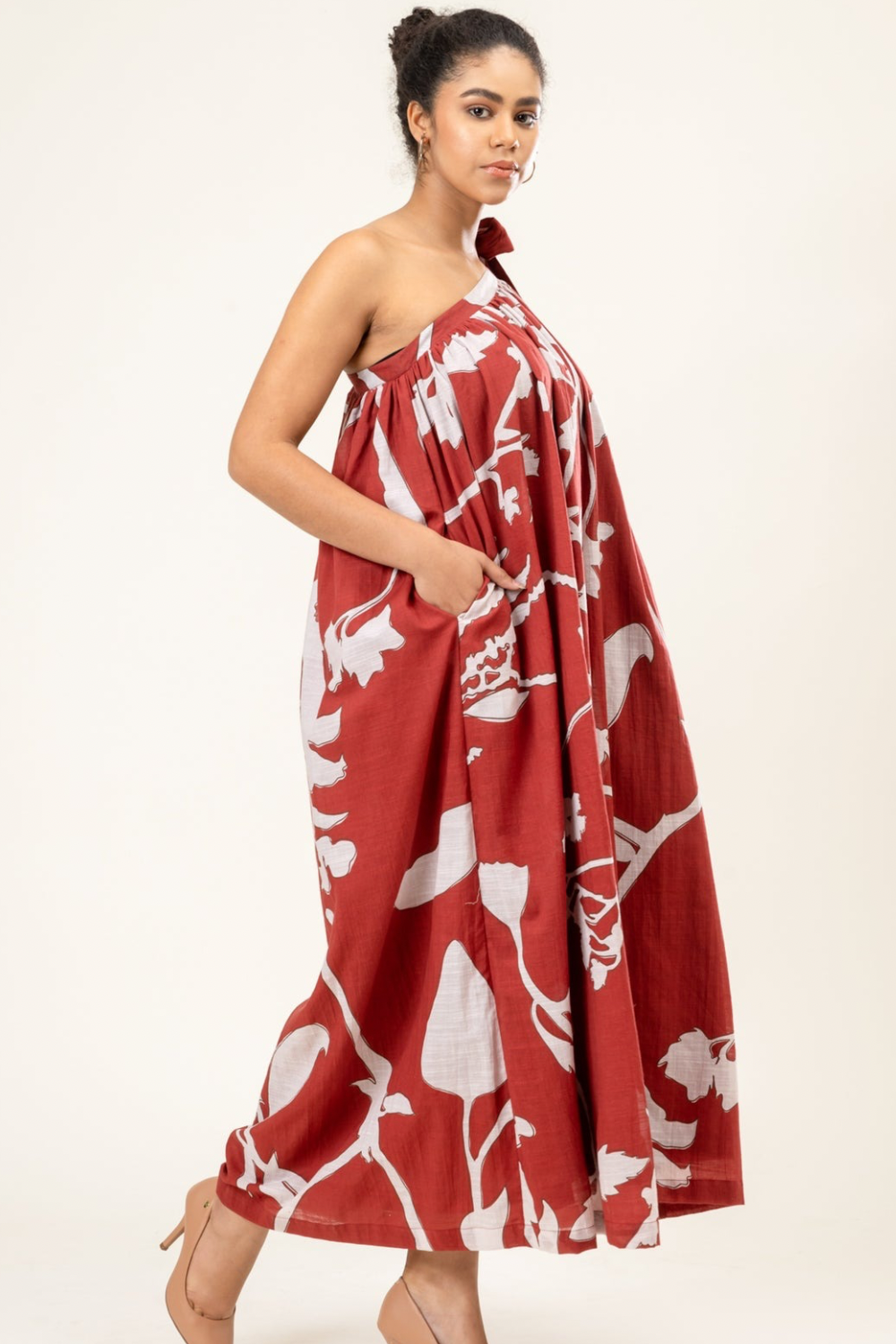 Description: One shoulder gathered dress with tie-up on one side