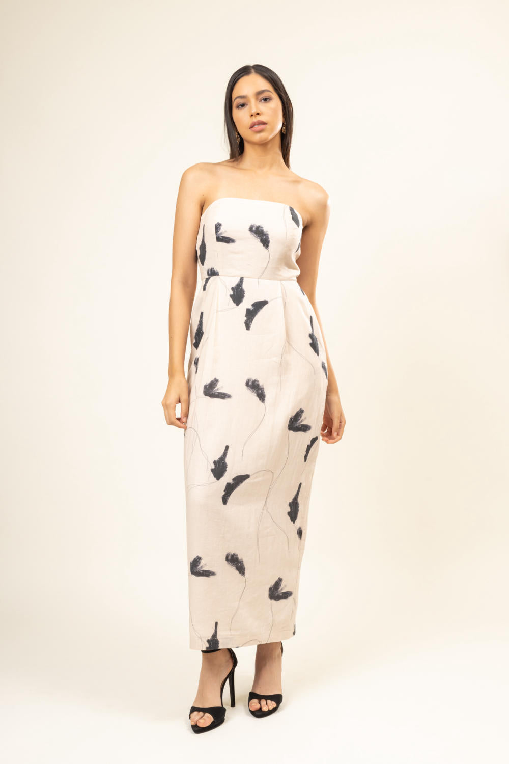 Description: Strapless Dress with back slit at bottom Opening - Elasticated Back and zipper opening Fit - Regular