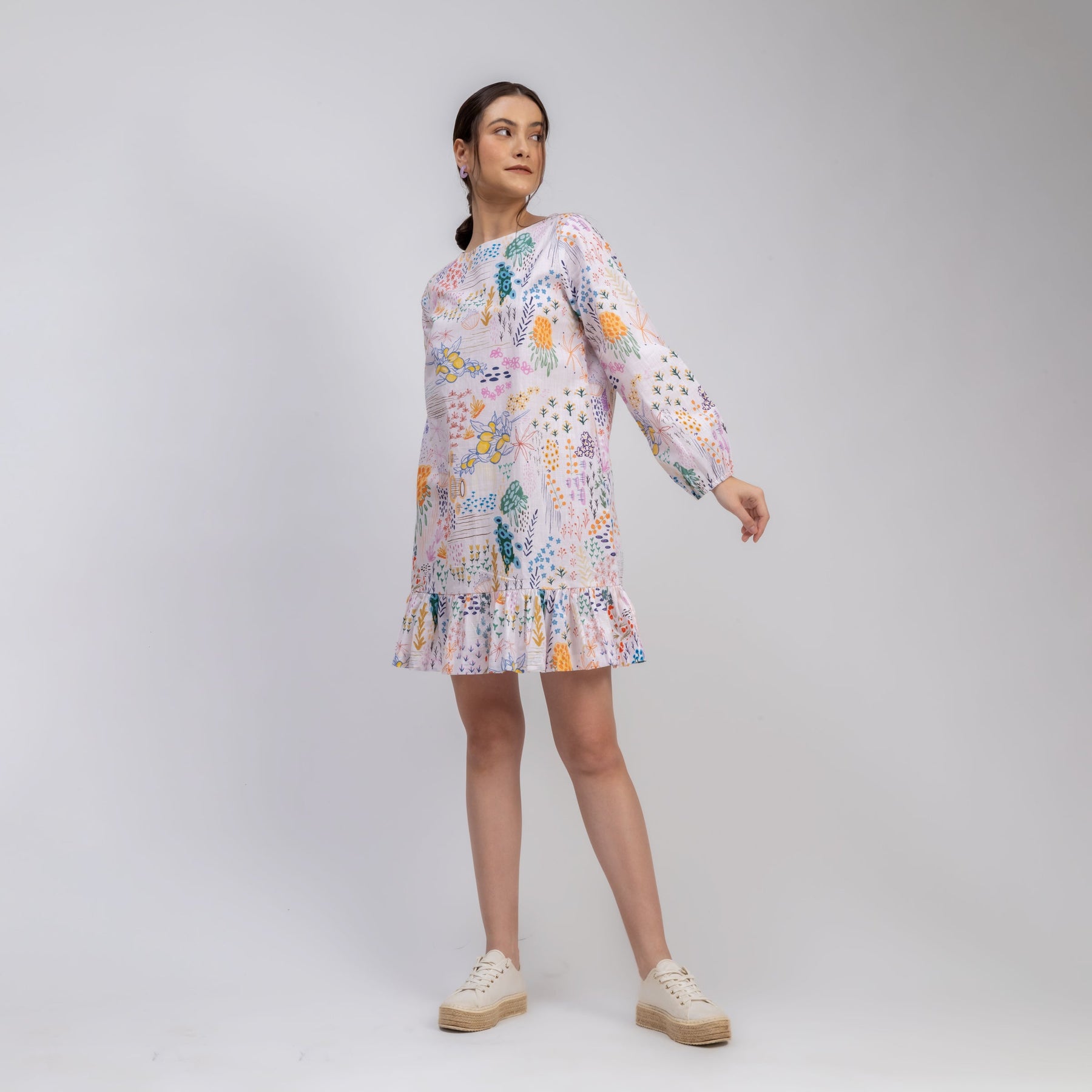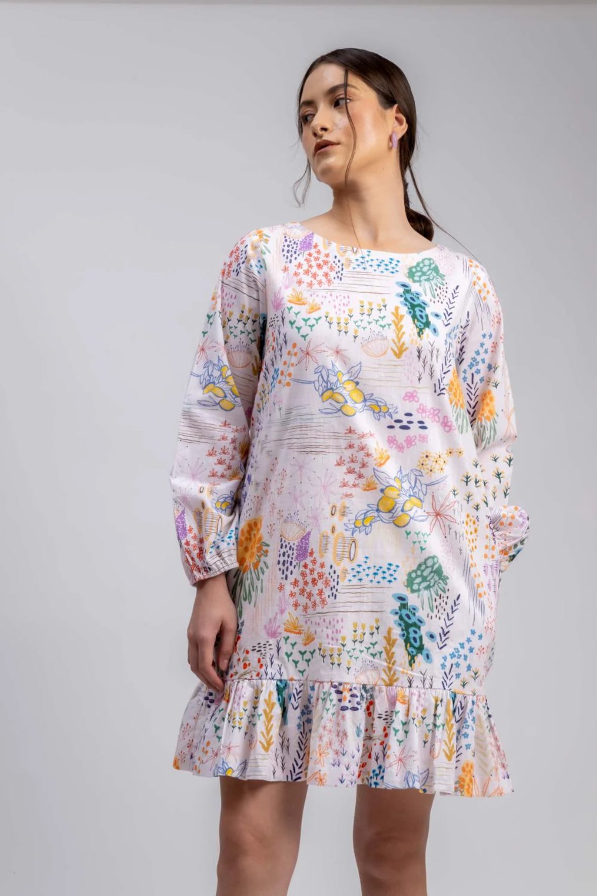 Printed comfort fit dress with pockets and frill at the bottom.