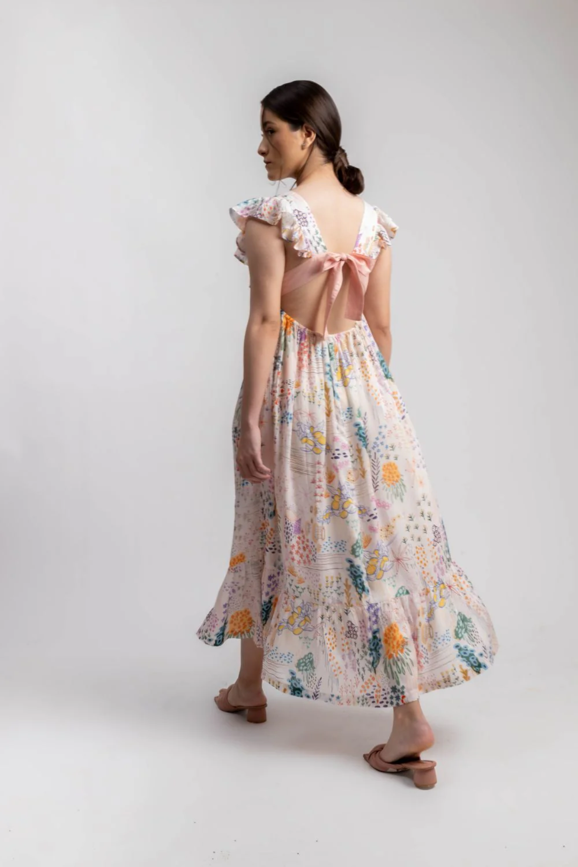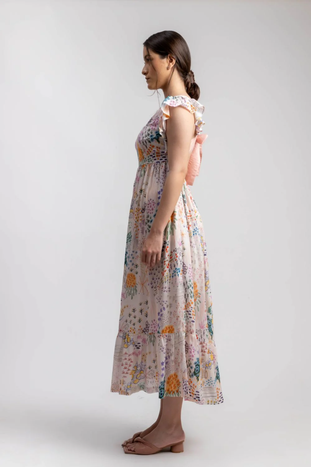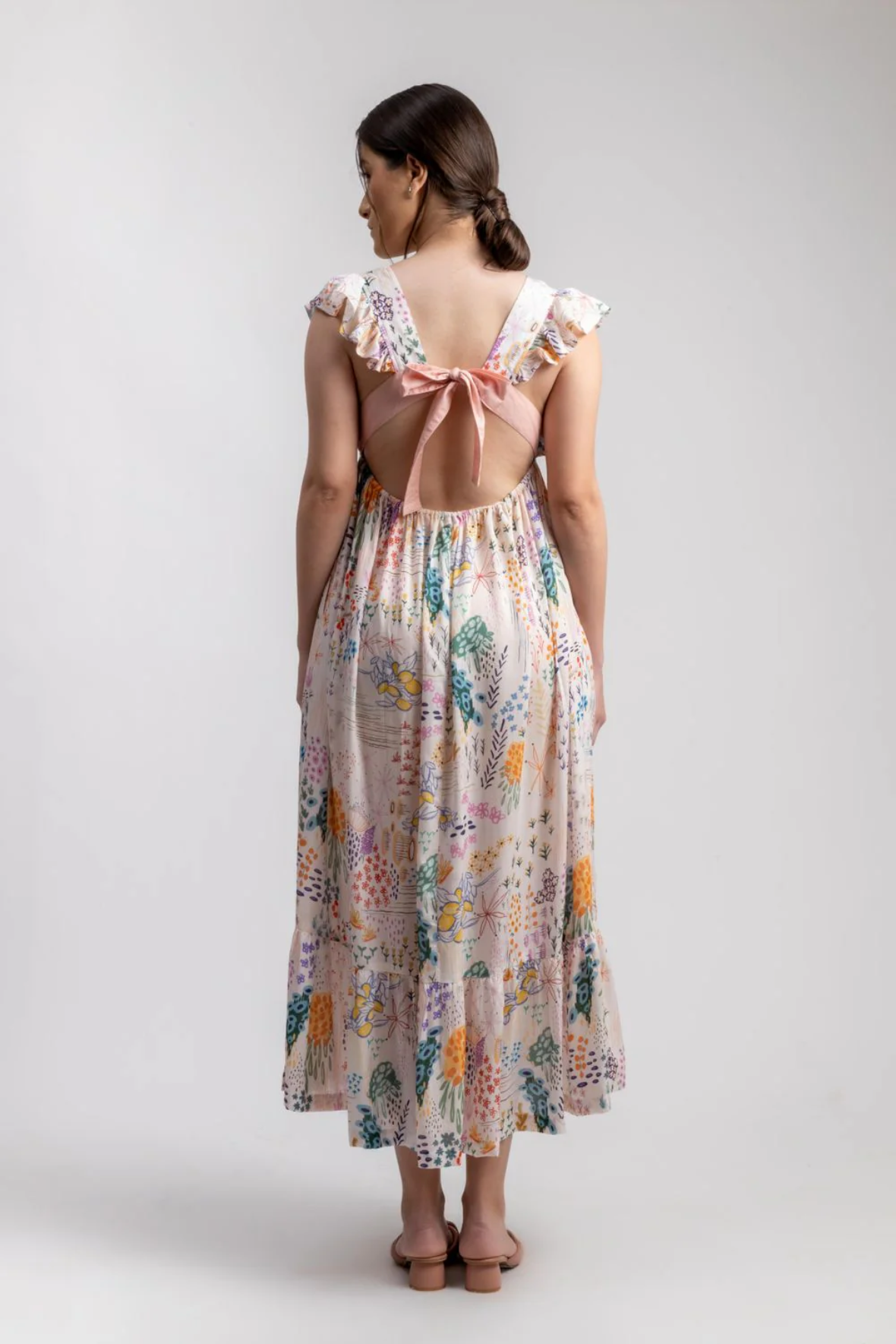 Product Type: Dress Printed ruffles sleeve dress with back bow detail. The dress is gathered at waist and comes with pockets. The piece is Upcycled using factory waste. The fabric is collected, cleaned, panelled to create this style.