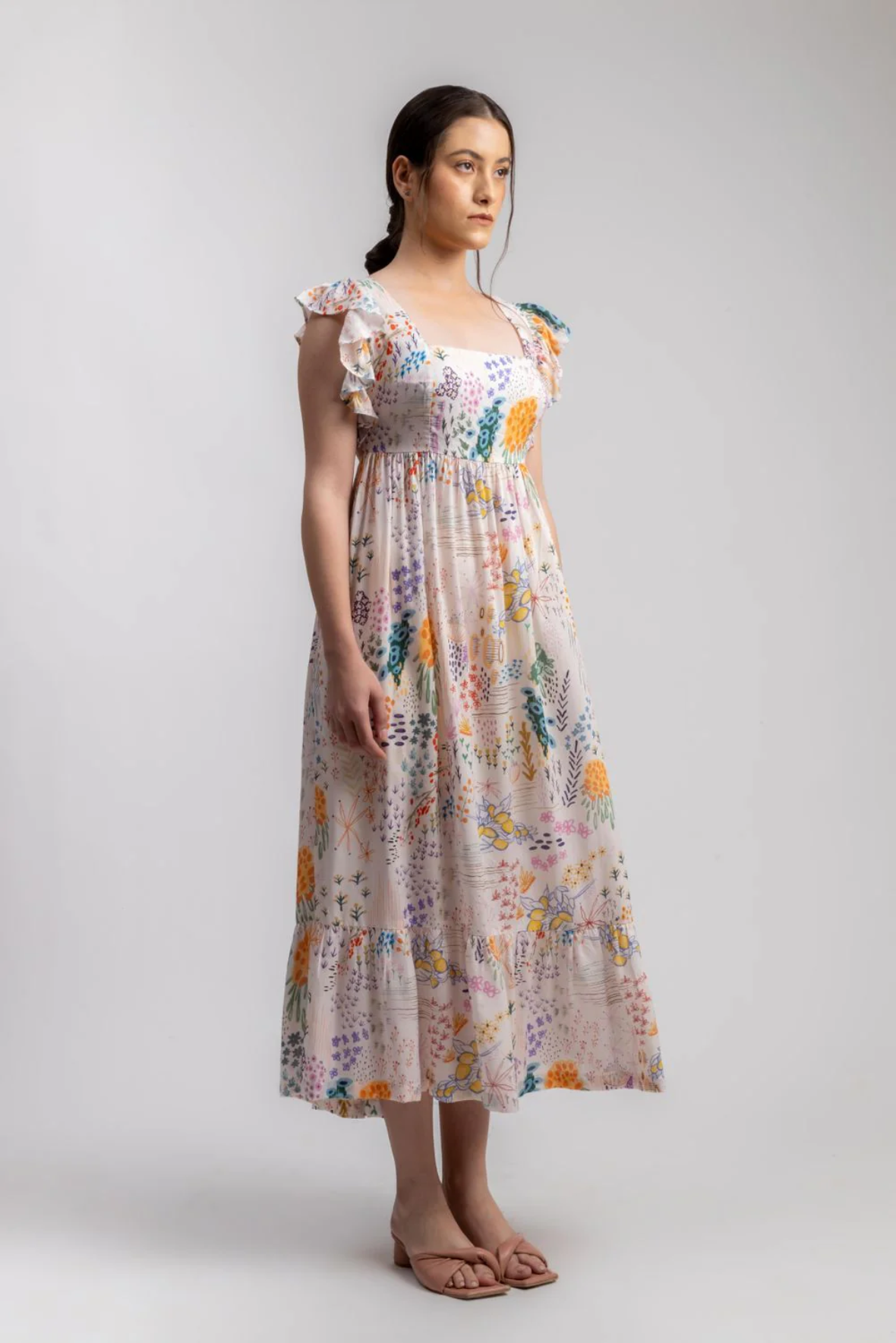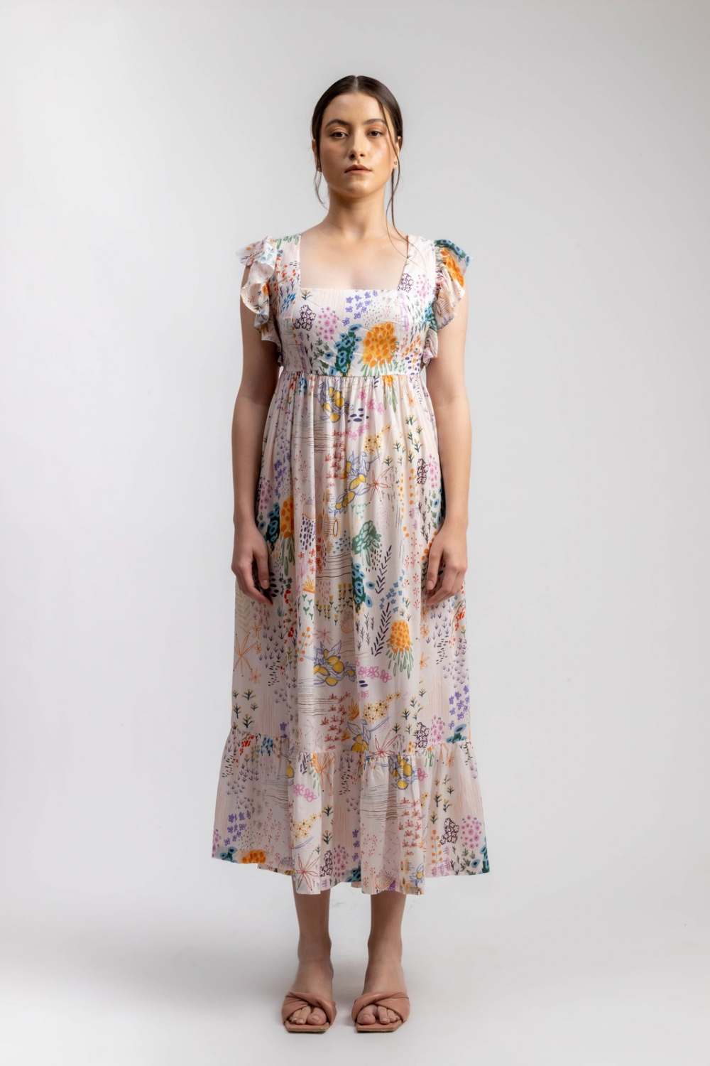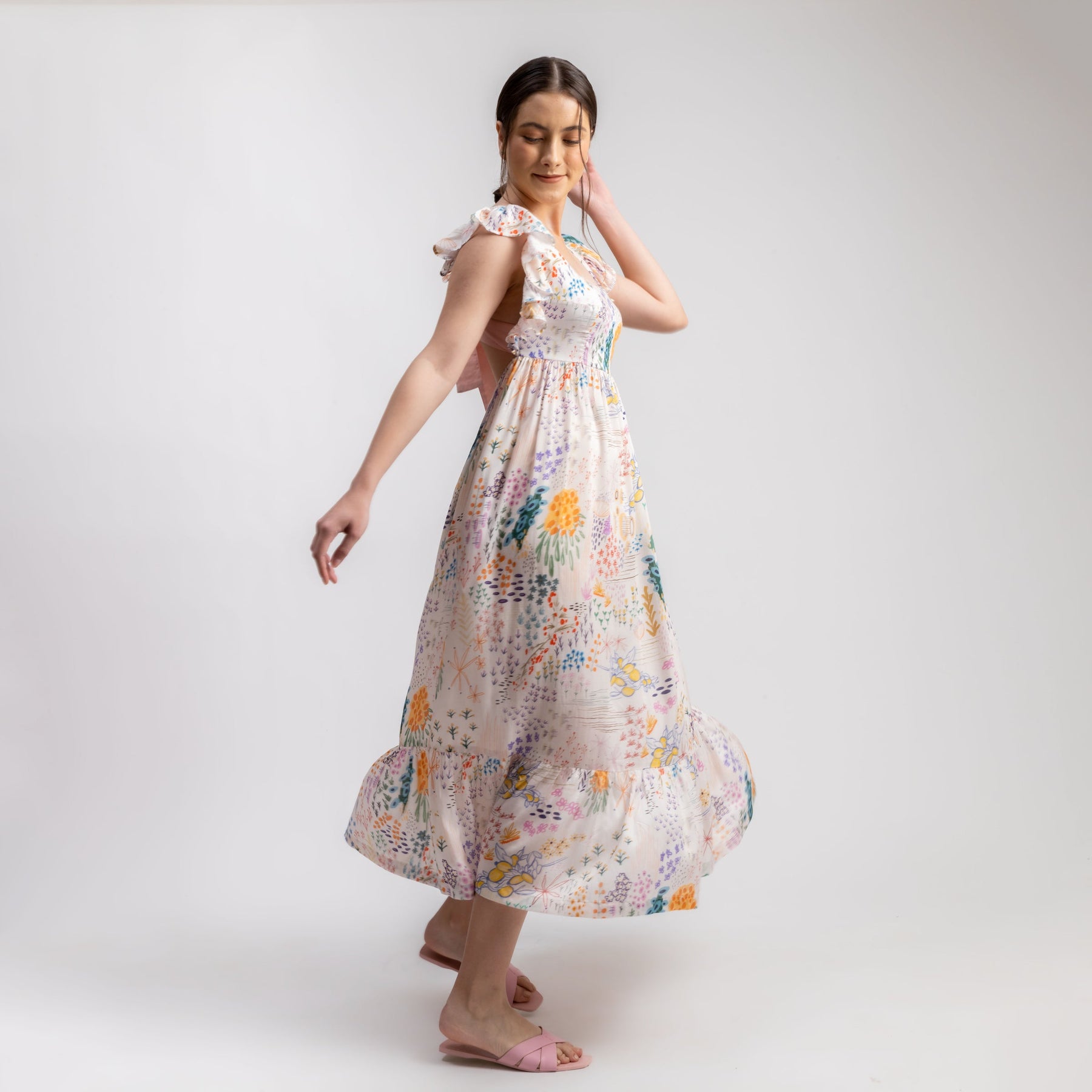 Product Type: Dress Printed ruffles sleeve dress with back bow detail. The dress is gathered at waist and comes with pockets. The piece is Upcycled using factory waste. The fabric is collected, cleaned, panelled to create this style.