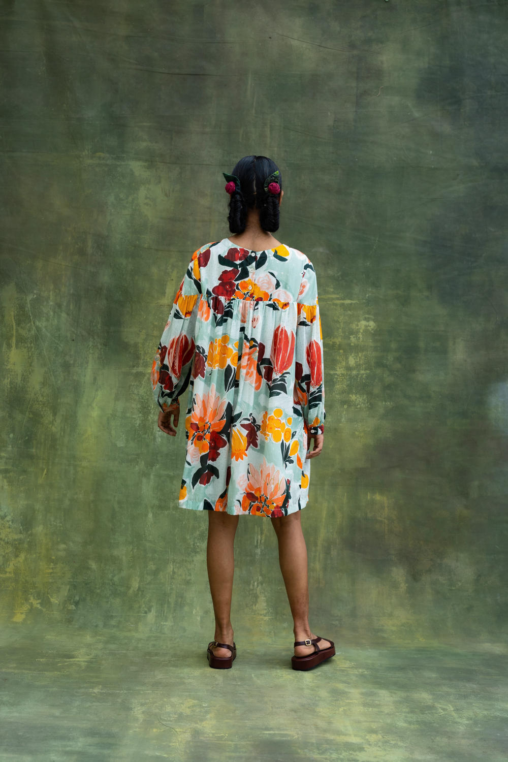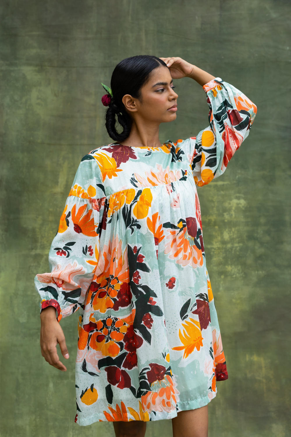 Digital printed gathered dress with puffy sleeves.