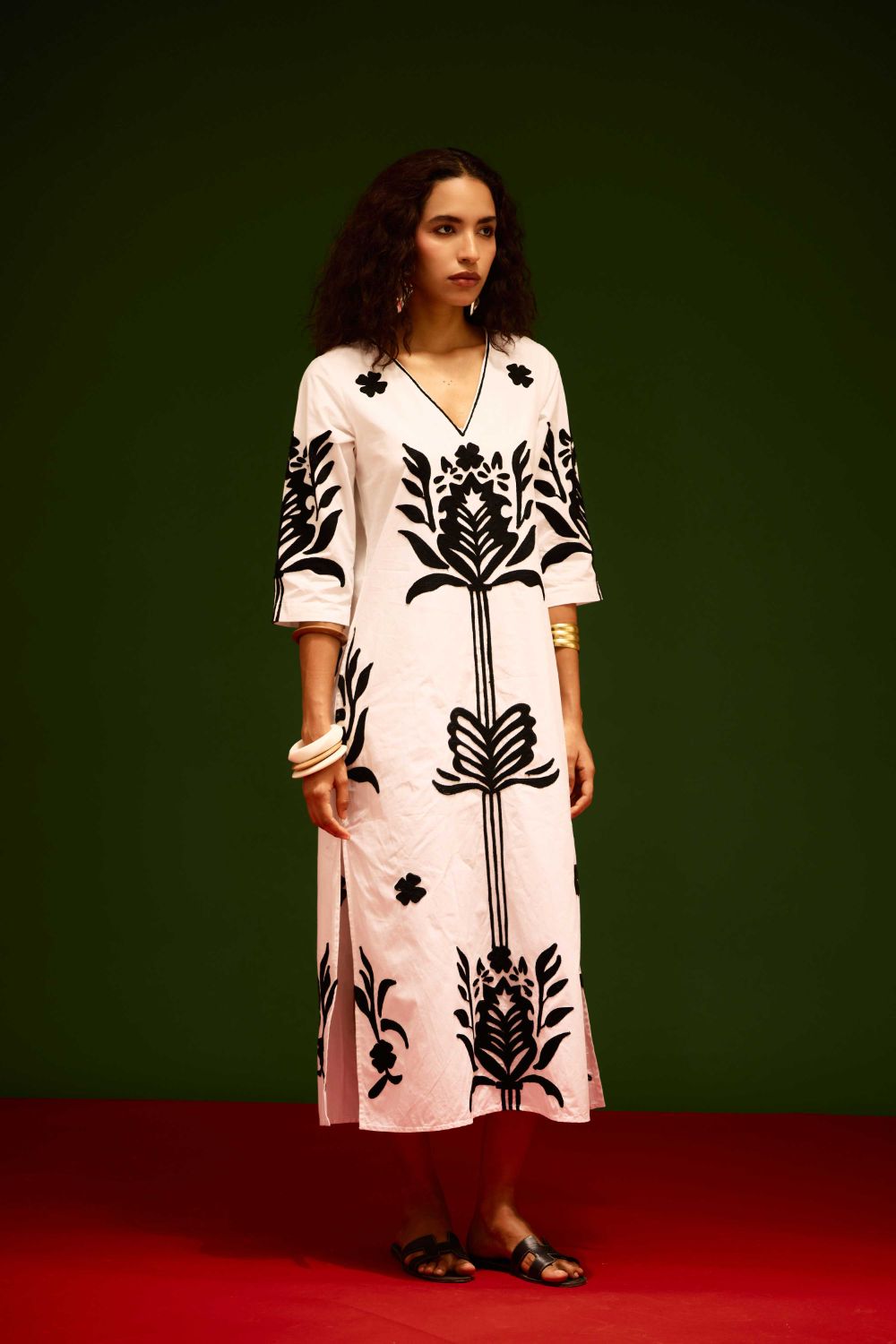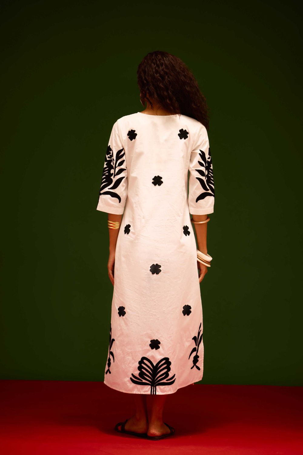 Ivory Cotton Maxi Dress with Black Tulip Thread Embroidery