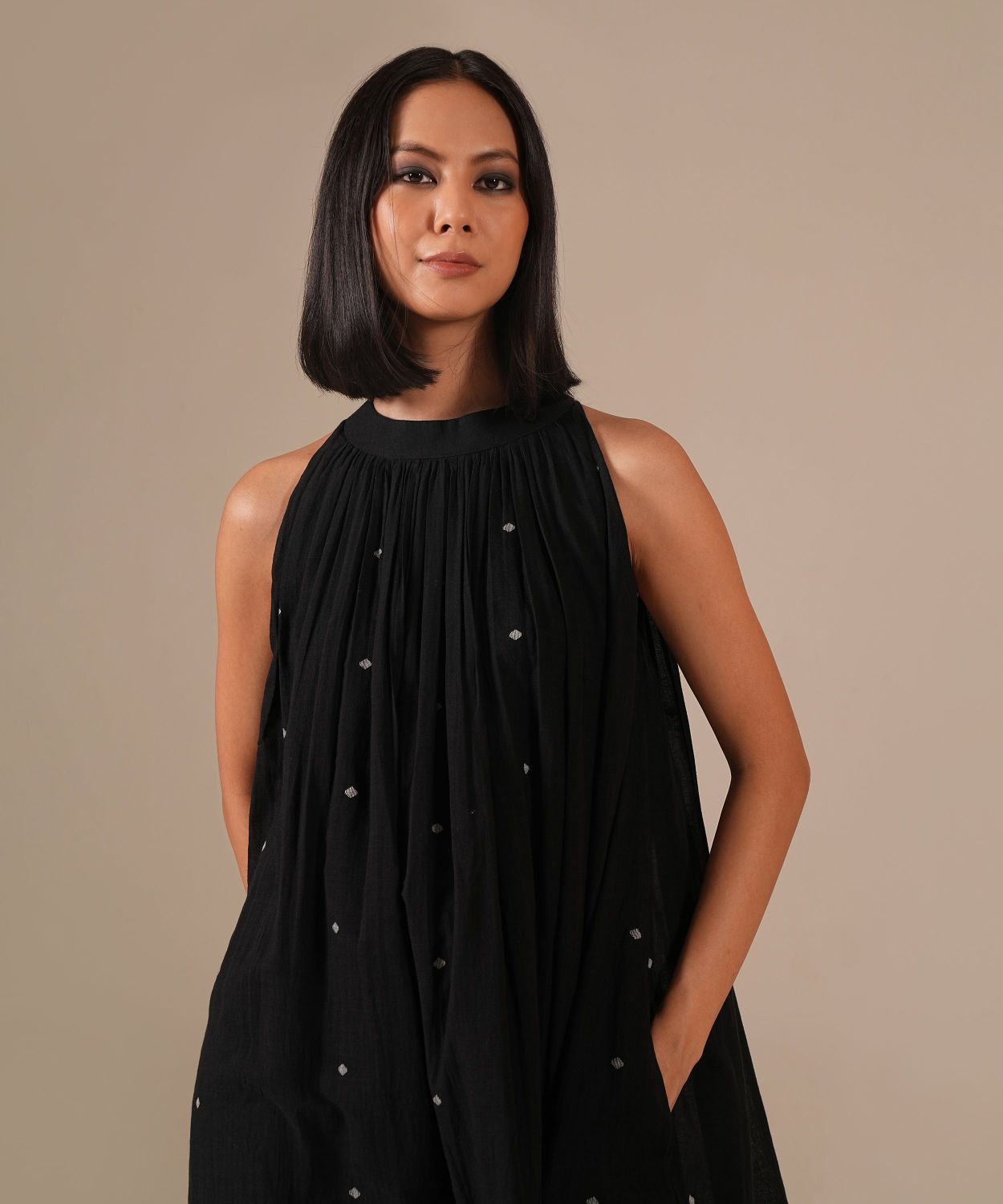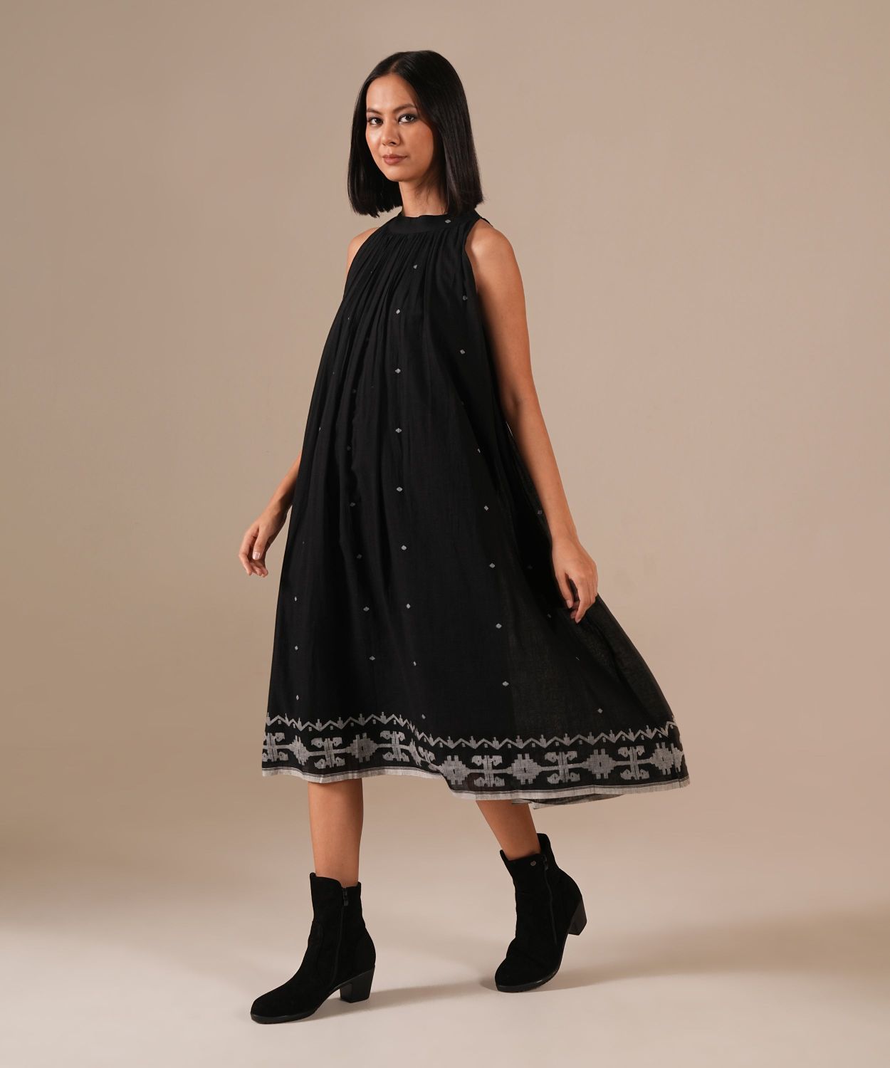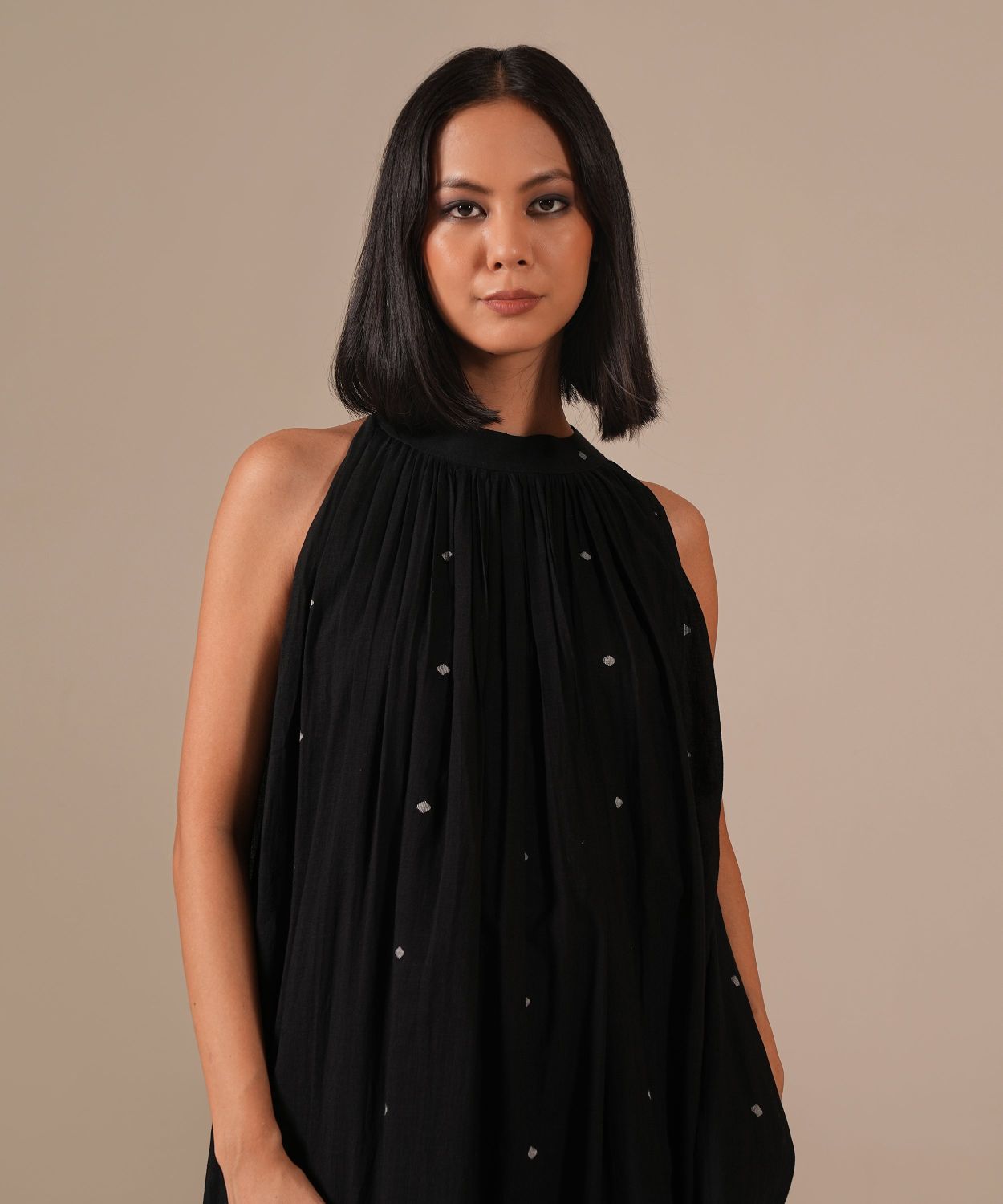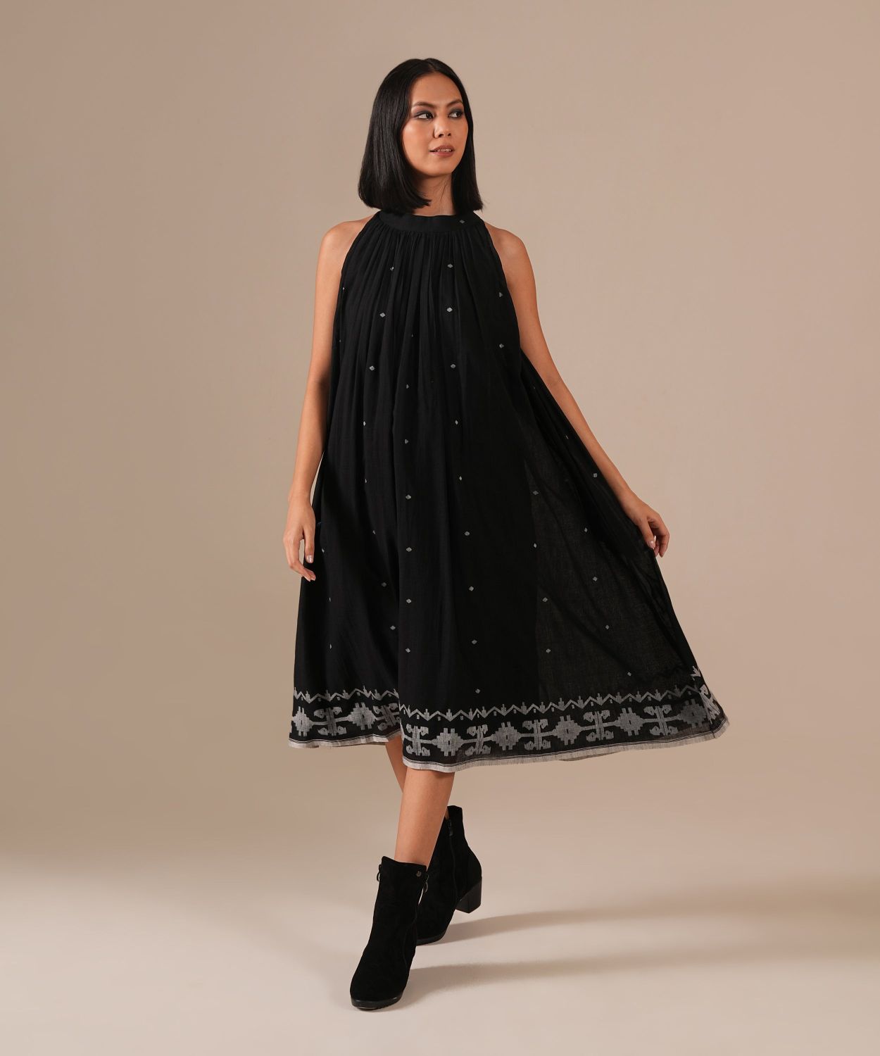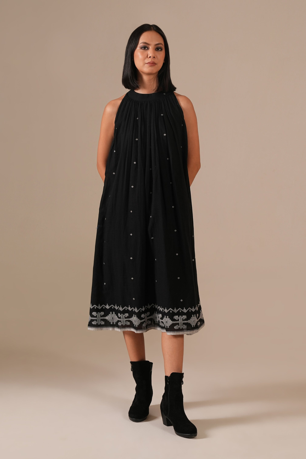 A classic Ikat gathered dress with halter neck, gentle gathers and back zipper — perfect for summer. Handwoven by Indian artisans with attached lining and side pockets.