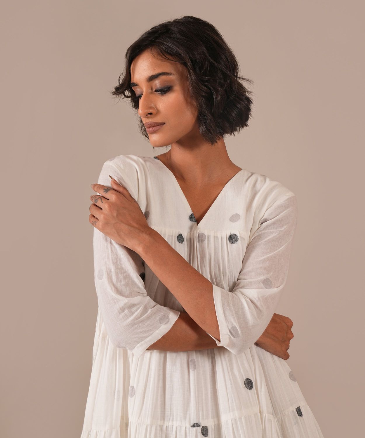 An elegant Jamdani swing dress designed to dazzle, featuring a V-neck, and 3/4th sleeves. With a romantic, voluminous silhouette crafted from 9 to 10 meters of gentle gathers, this dress flows beautifully, making every twirl and photograph a statement. Perfect for capturing the full drama and movement of your favorite moments.