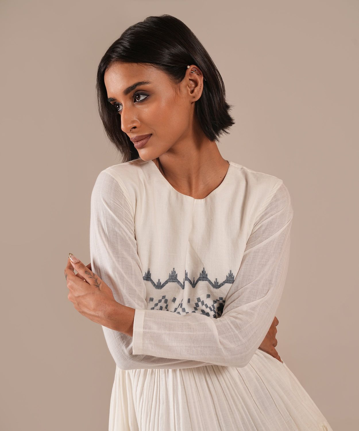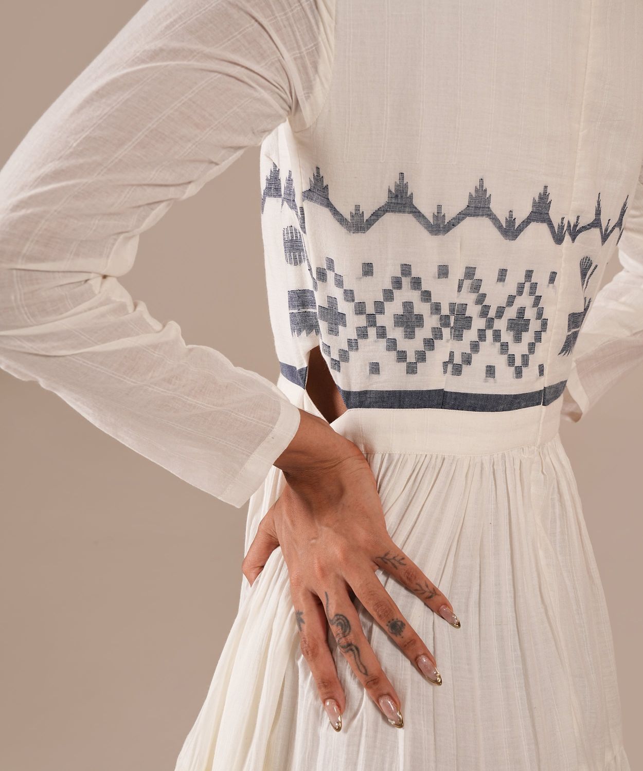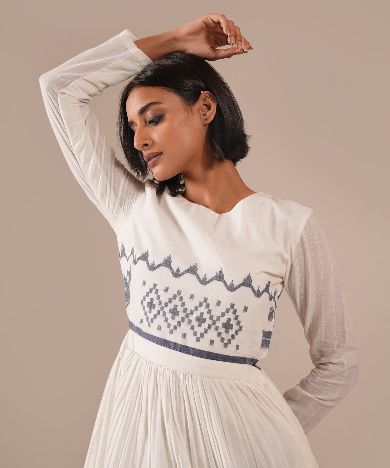 An attire that stands for its glamour and effortlessness features a fitted bodice, round neck, full sleeves, back zipper fastening, and skin-barring cut out at the waist that comes with a voluminous tiered silhouette. Handwoven by Indian artisans, the dress comes with side pockets.