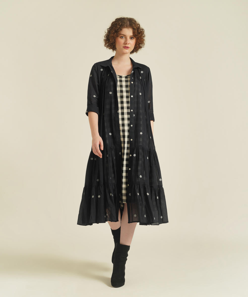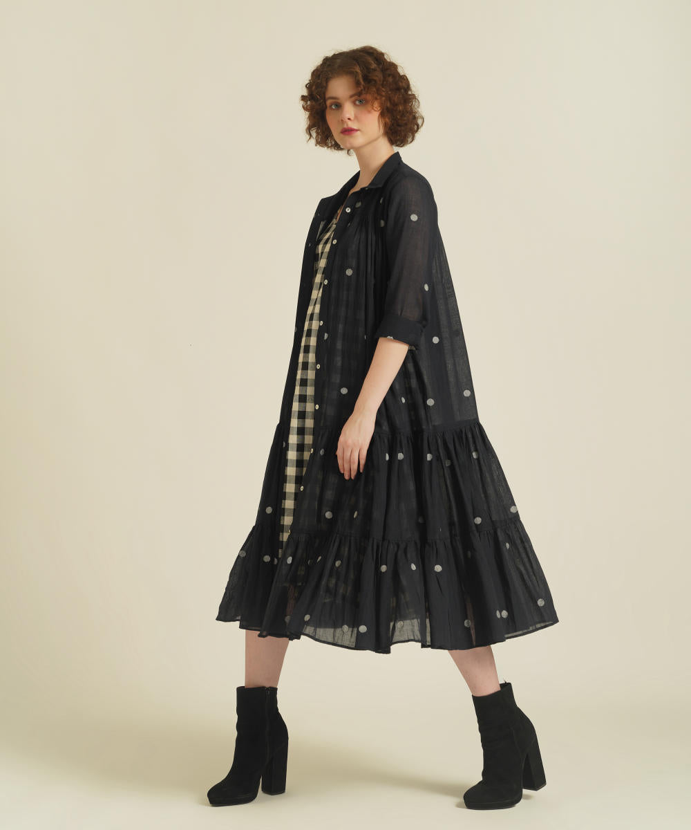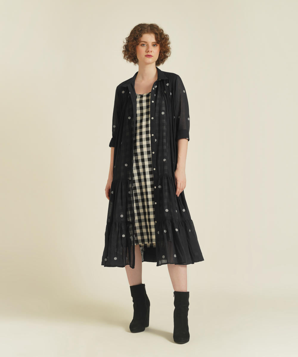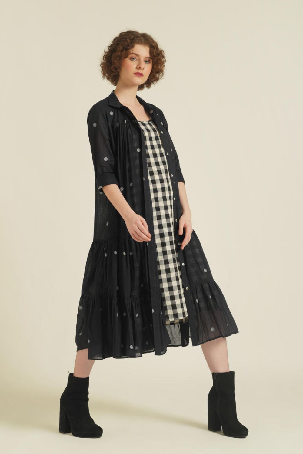 A minimalistic tiered shirt dress featuring high collar neck, front button fastening, full sleeves that comes with gentle pleats at the front and back. This dress also comes with two separate slips (cotton plain and gingham) that is designed to be styled in multiple ways.