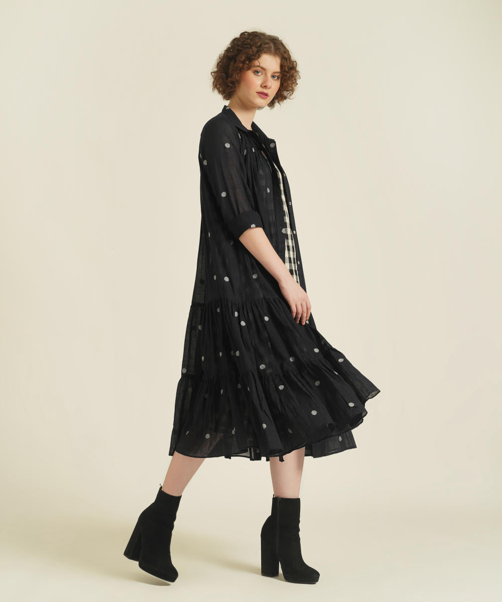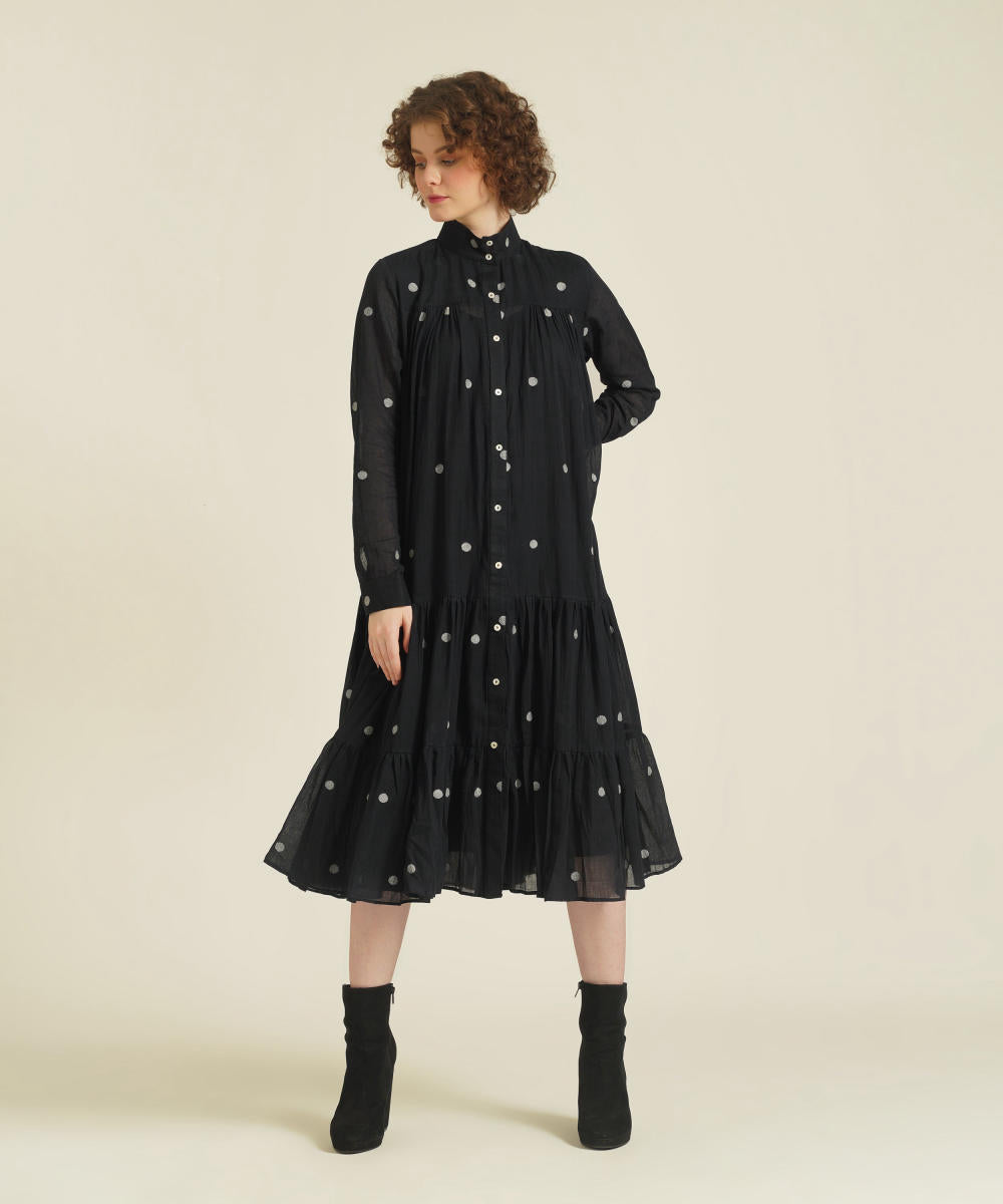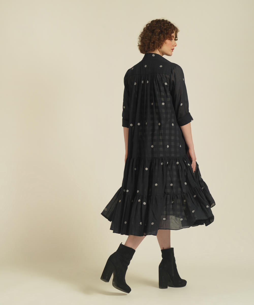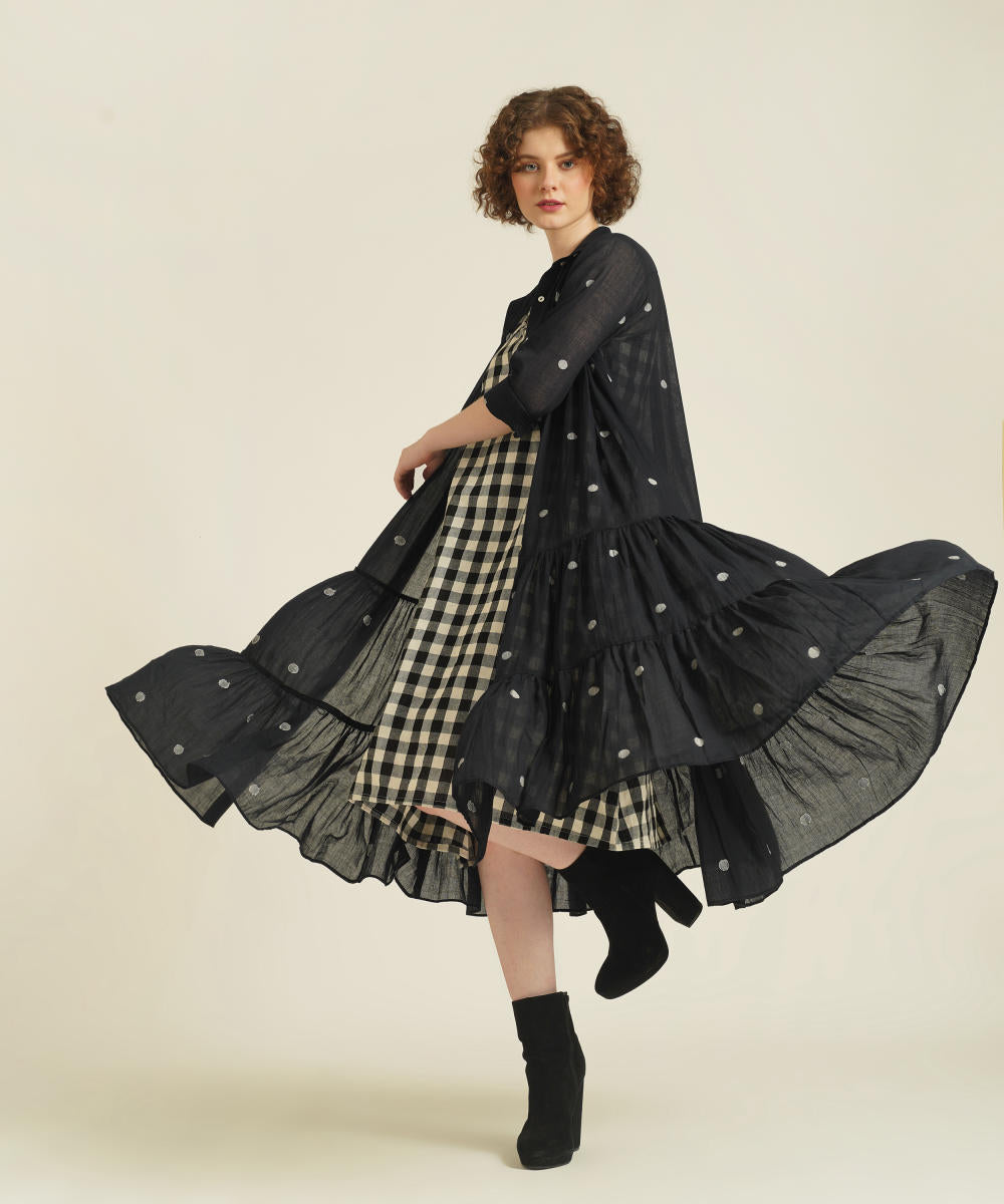 A minimalistic tiered shirt dress featuring high collar neck, front button fastening, full sleeves that comes with gentle pleats at the front and back. This dress also comes with two separate slips (cotton plain and gingham) that is designed to be styled in multiple ways.