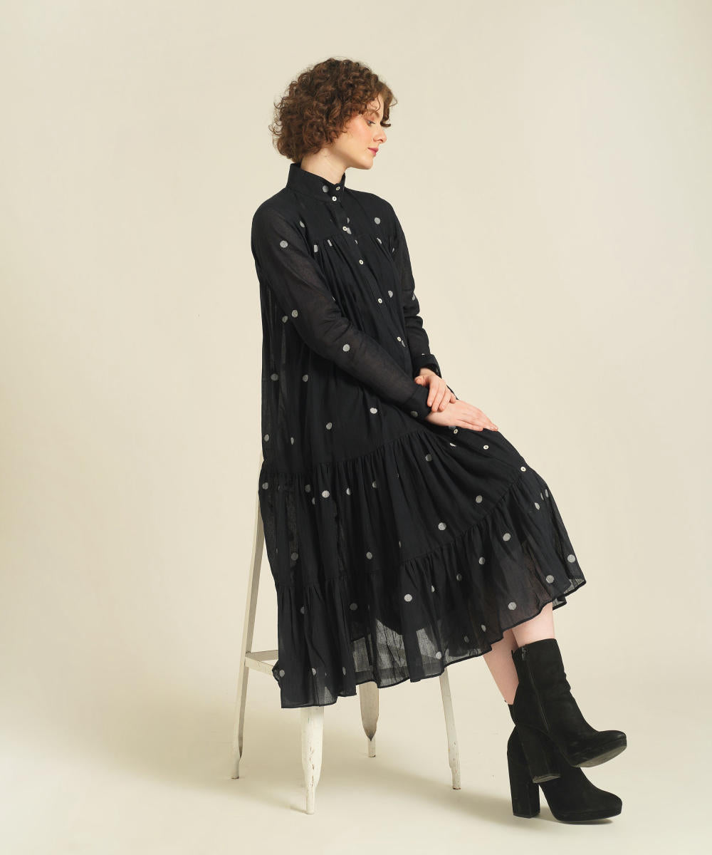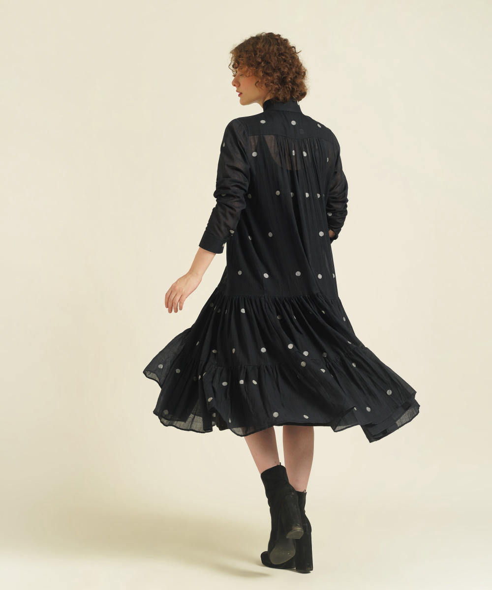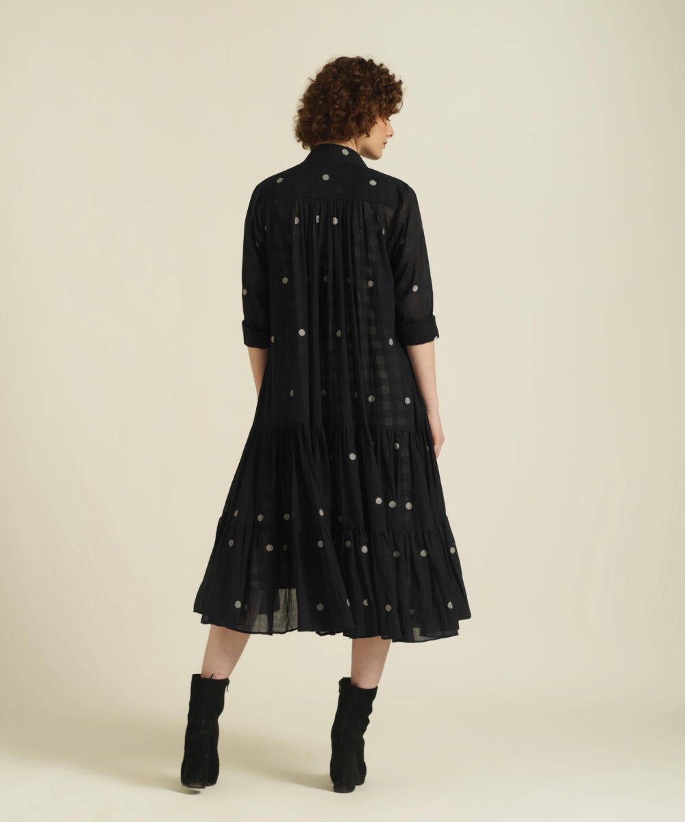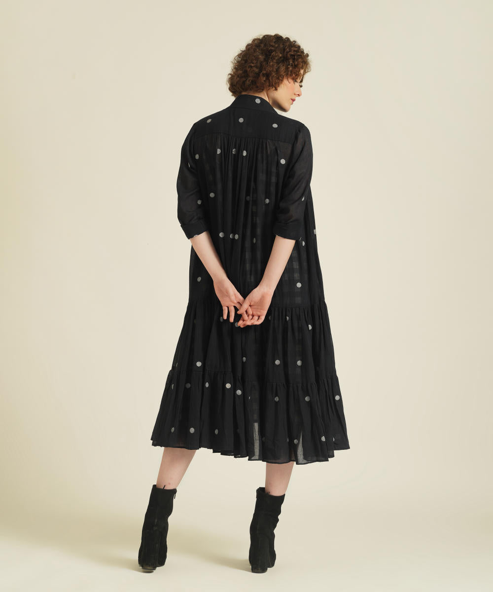 A minimalistic tiered shirt dress featuring high collar neck, front button fastening, full sleeves that comes with gentle pleats at the front and back. This dress also comes with two separate slips (cotton plain and gingham) that is designed to be styled in multiple ways.