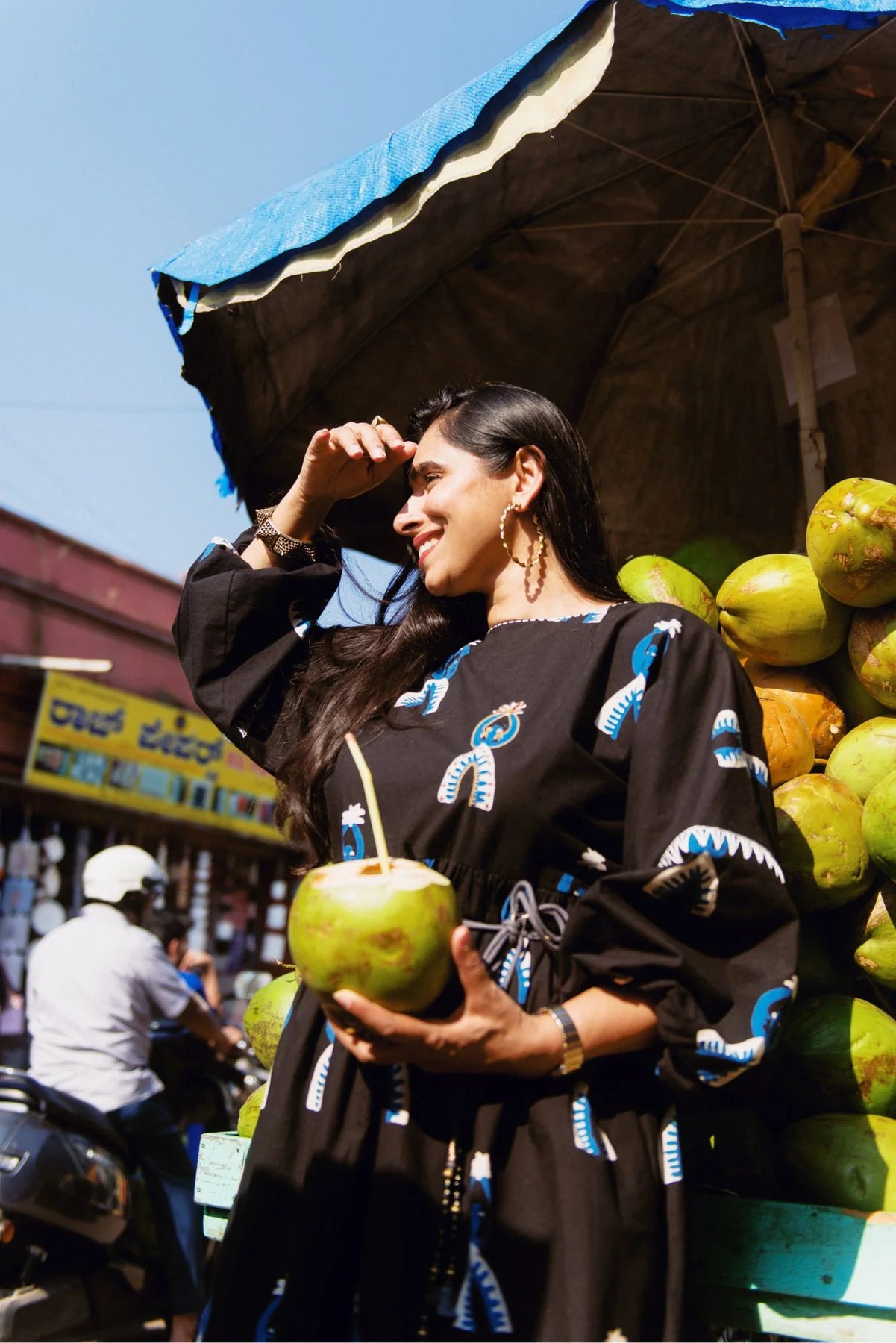 Hand-screen printed in bold tribal doll motif, this easy-fit short dress is crafted in soft cotton. The relaxed balloon sleeves, subtle gathers, and charming tribal motifs in blue and white make it your go-to for all things playful and chill.