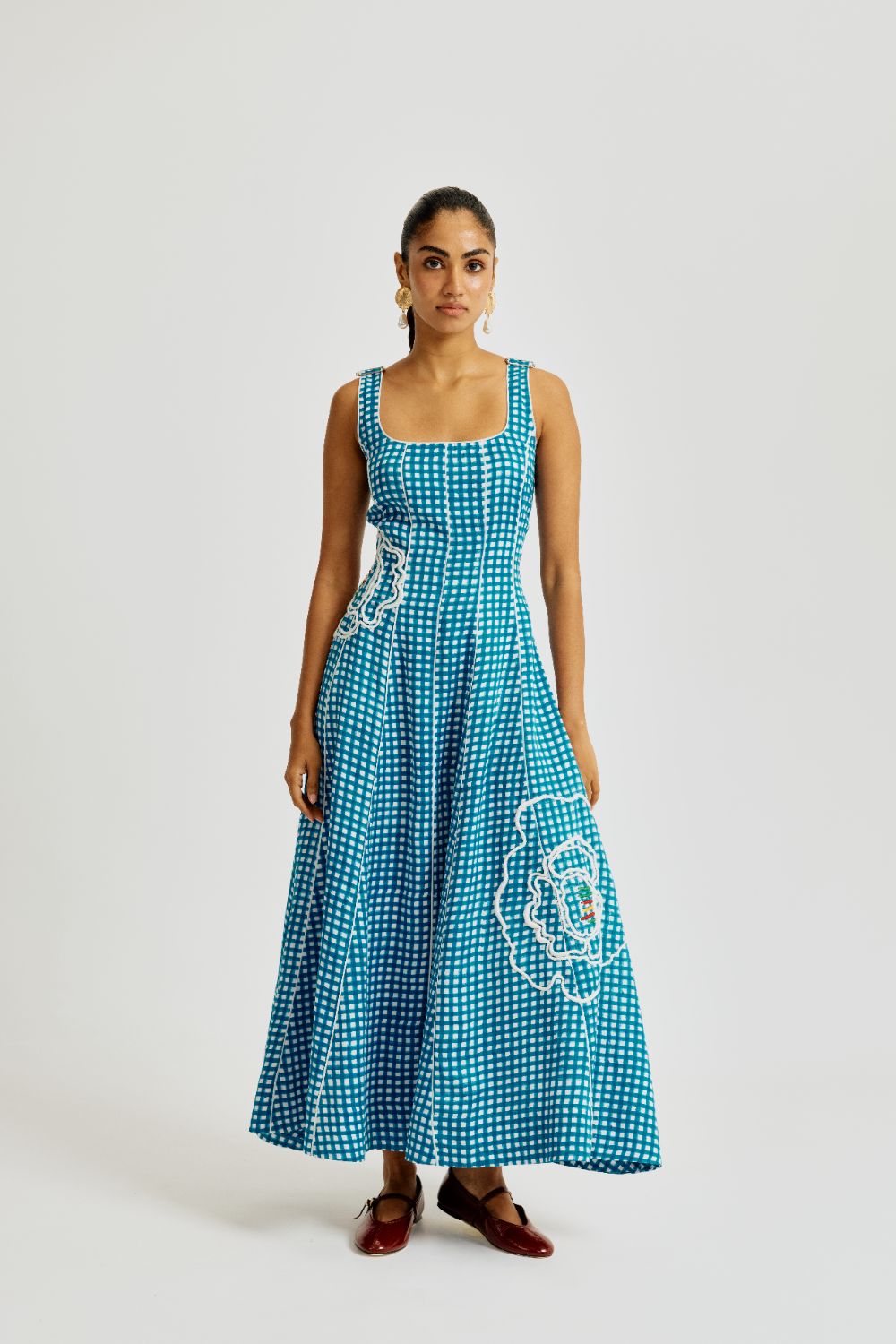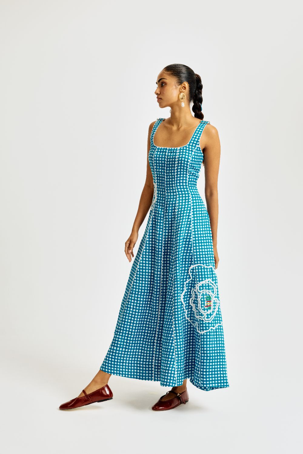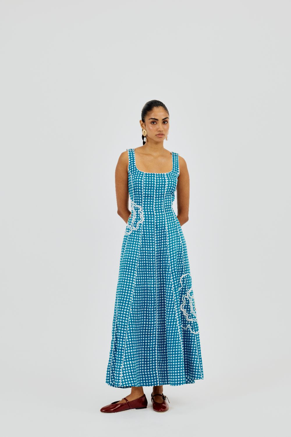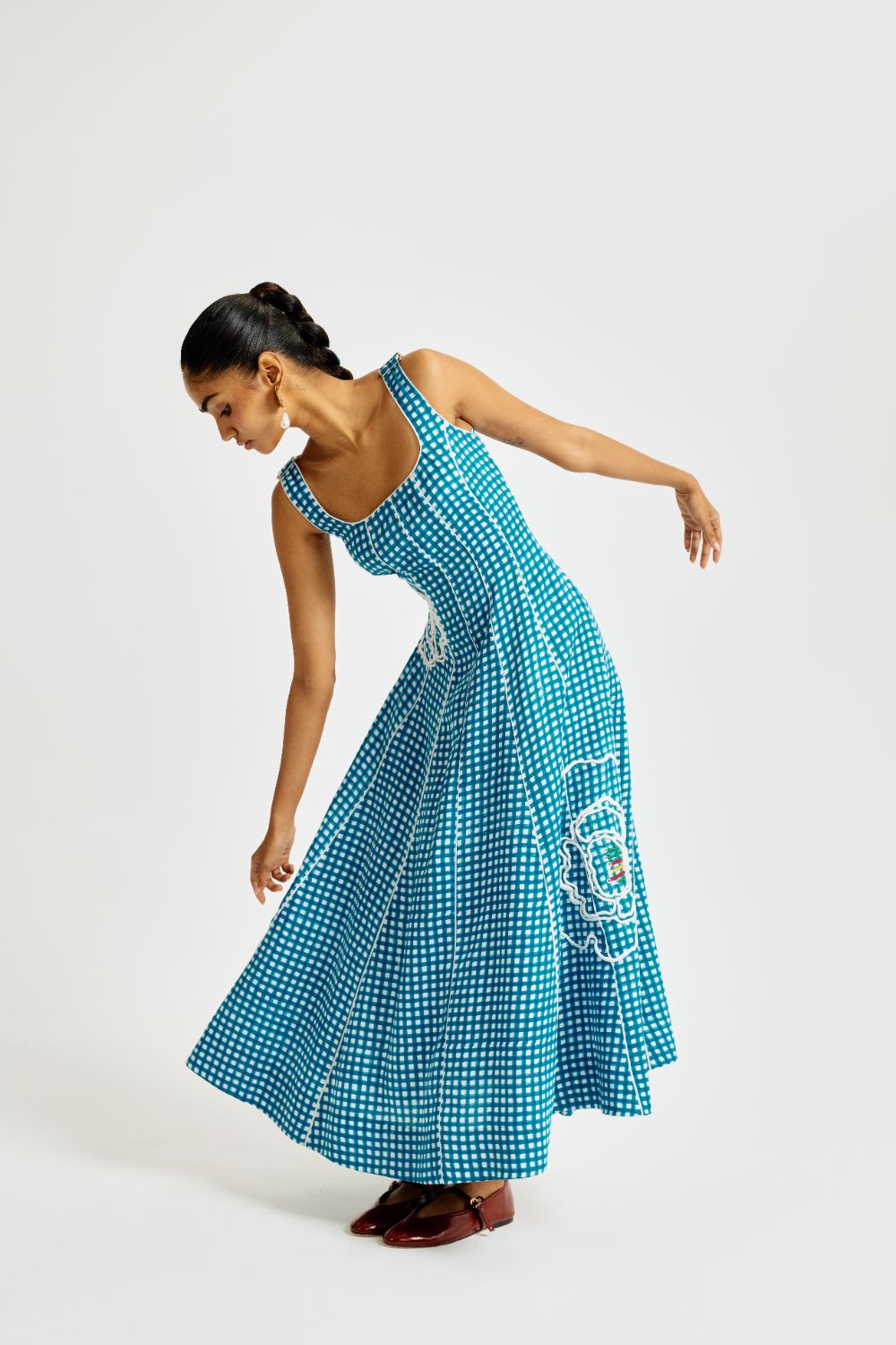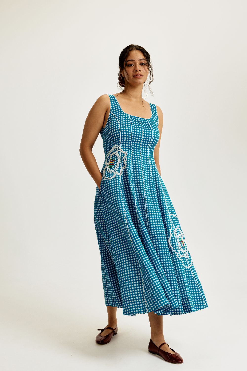 We’re back with another version of our forever favourite Kokum dress! The Soro check Dress is adorned with oversized hand-embroidered florals on a breezy blue check base, it celebrates Jodi’s signature clash of print and play. Our product is hand-block printed in Jaipur, India, using techniques of traditional handblock printing. Subtle variations in patterns are natural to this process. We believe this makes each creation unique and charming. Some call it je ne sais quoi. We call it JODI. If you wish to have the length of the garment altered, please mention your request in the special instructions section at checkout, with your desired length, customisation charges may apply.
