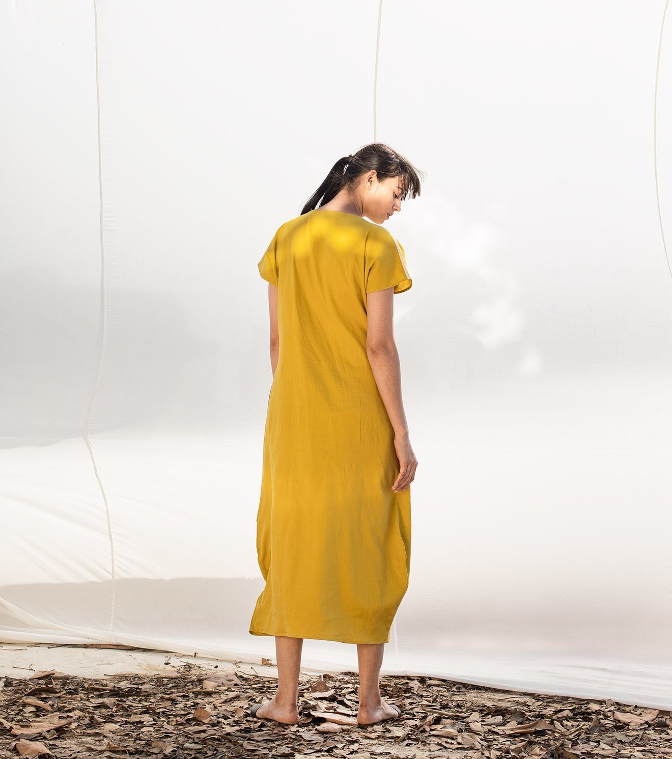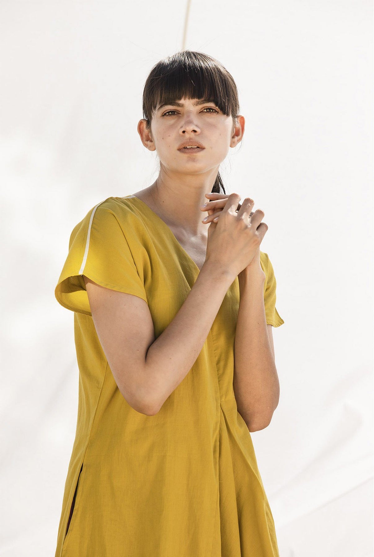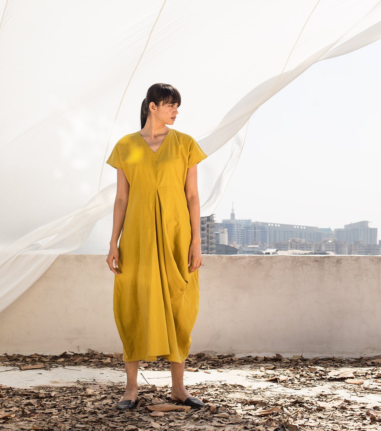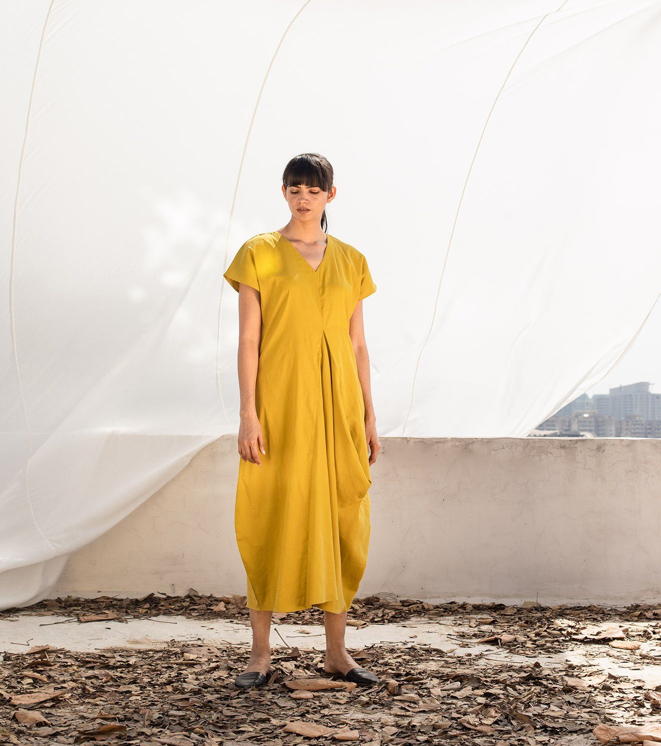 Mango yellow one-side cowl midi with a V-neckline, empire yoke and drop shoulders.