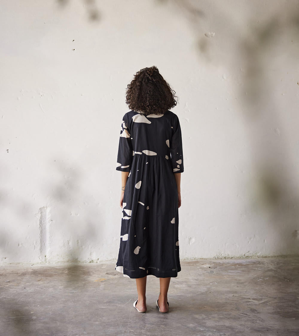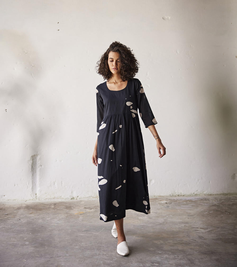 A black mul terracota print cotton dress with gathers at the waistline and a round neckline. -