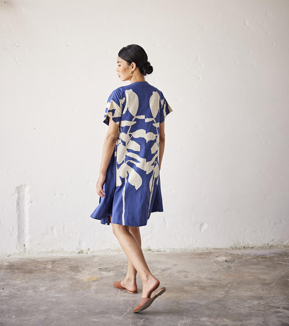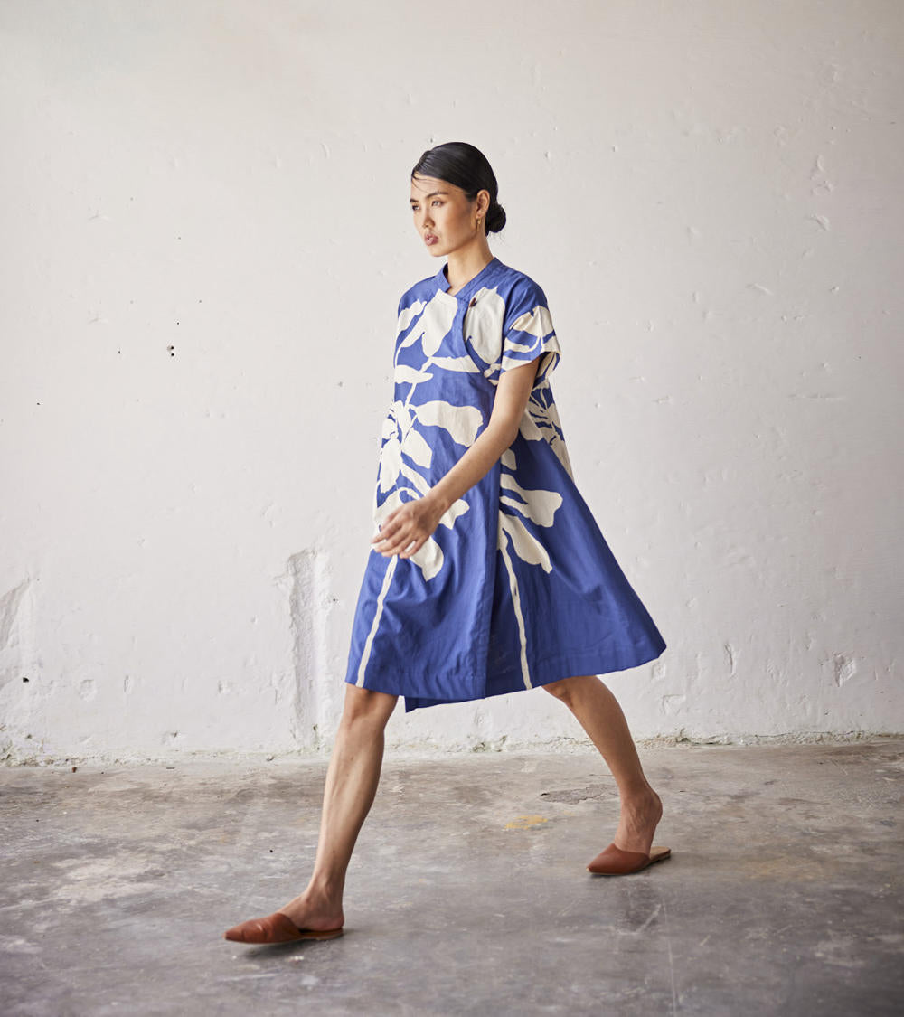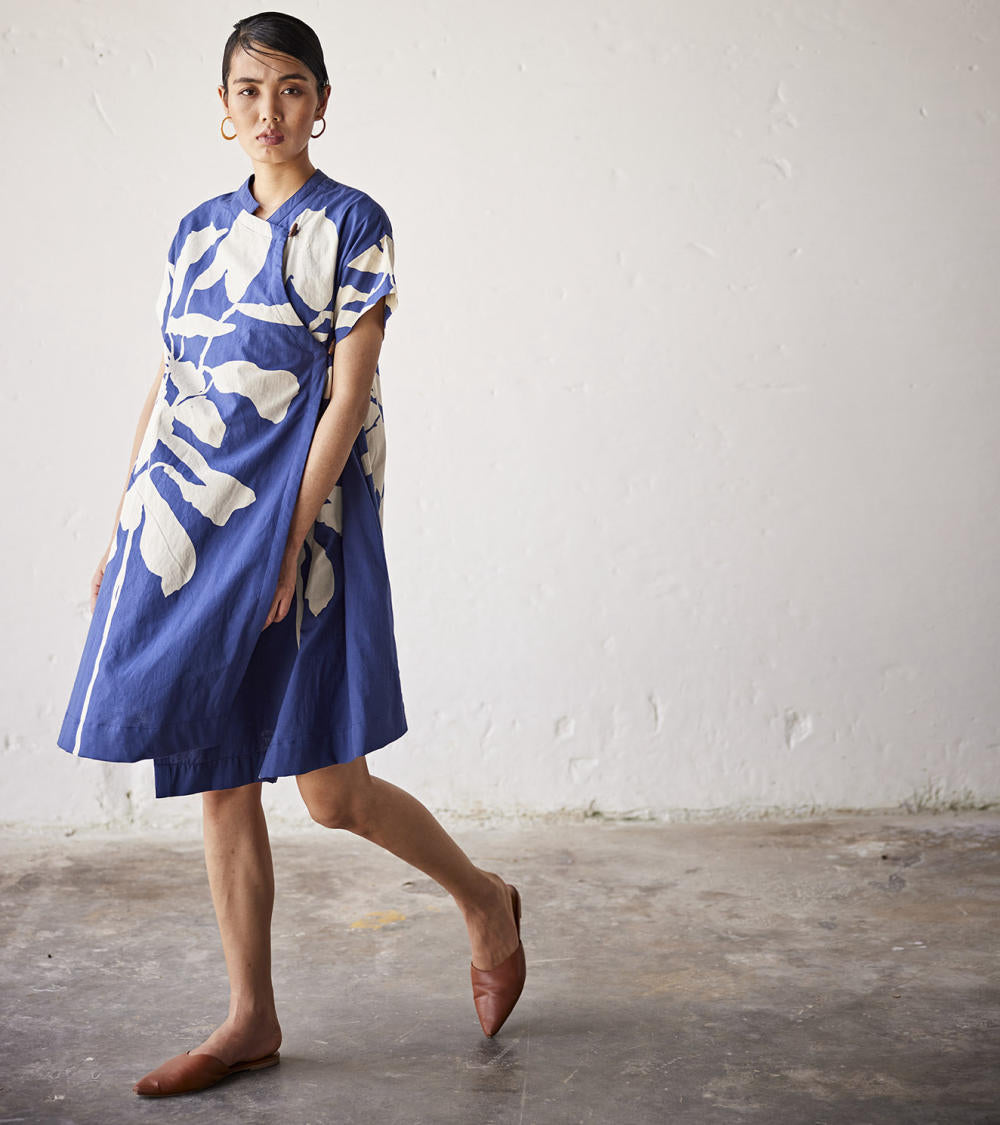 A navy blue lino print mul dress with an overlap front panel and wooden button opening.