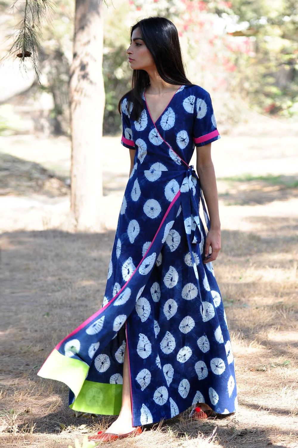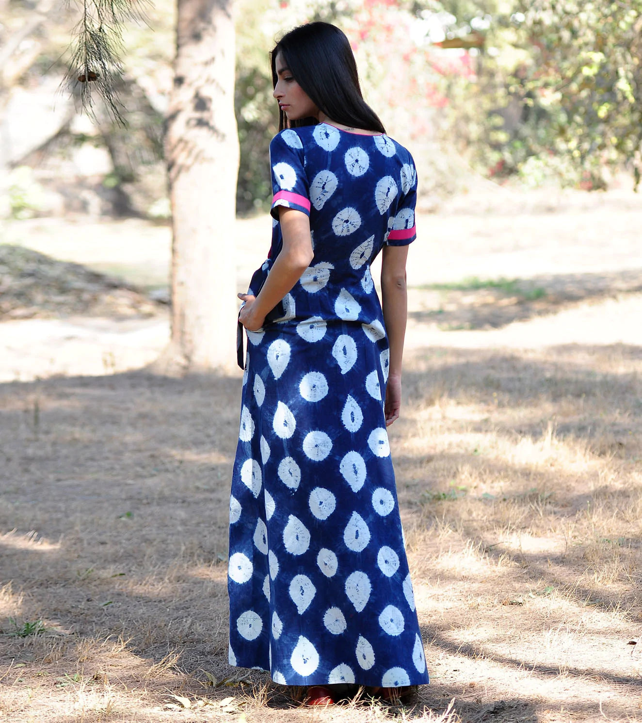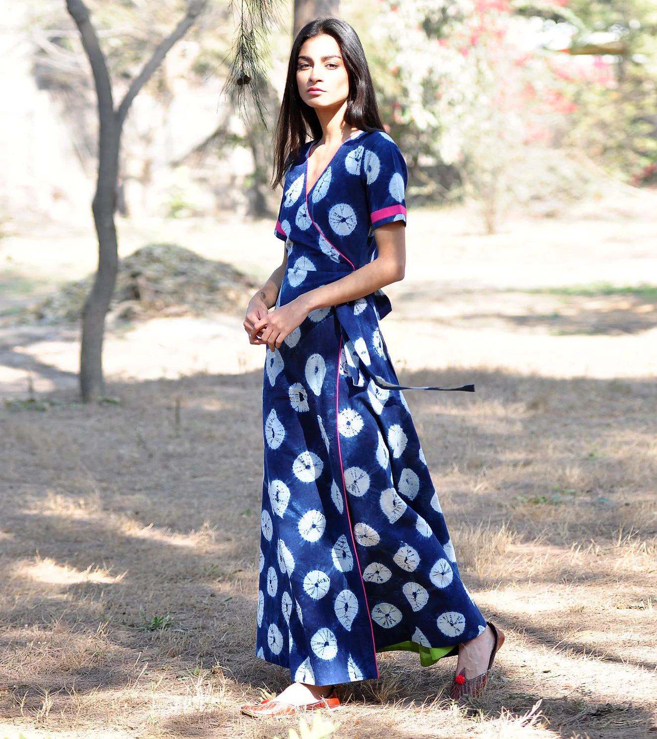 Make an entrance in this ethereally draped shibori print, cotton gown. The design features short sleeves, side pockets and a beautiful flare that is fastened around the waist with a tie up. This piece is delicately finished with rani pink and lime green detailing all across the hemline, pockets and sleeves.