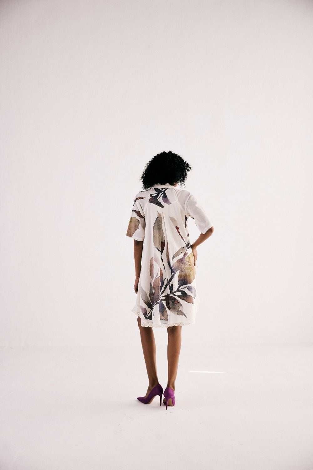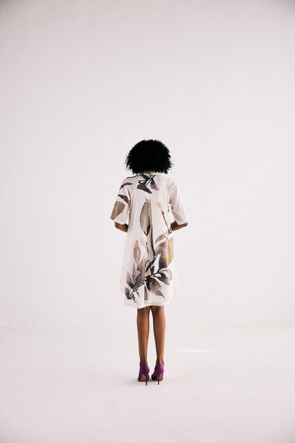 An off-white floral art print mul dress with lapel collars, front button opening, raglan sleeve and back pleat detailing. Comes with polka dot mul lining with lace detailing .