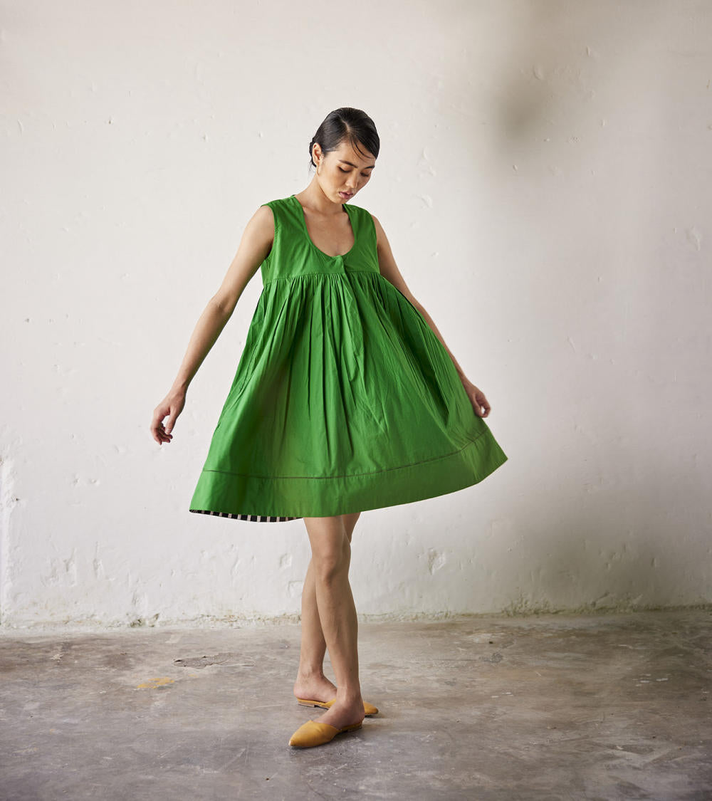 A forest green poplin fit and flare dress with black and white striped fusing at the inner hemline. Comes with a round neckline, concealed button opening and stitch embroidery detailing at the hemline.