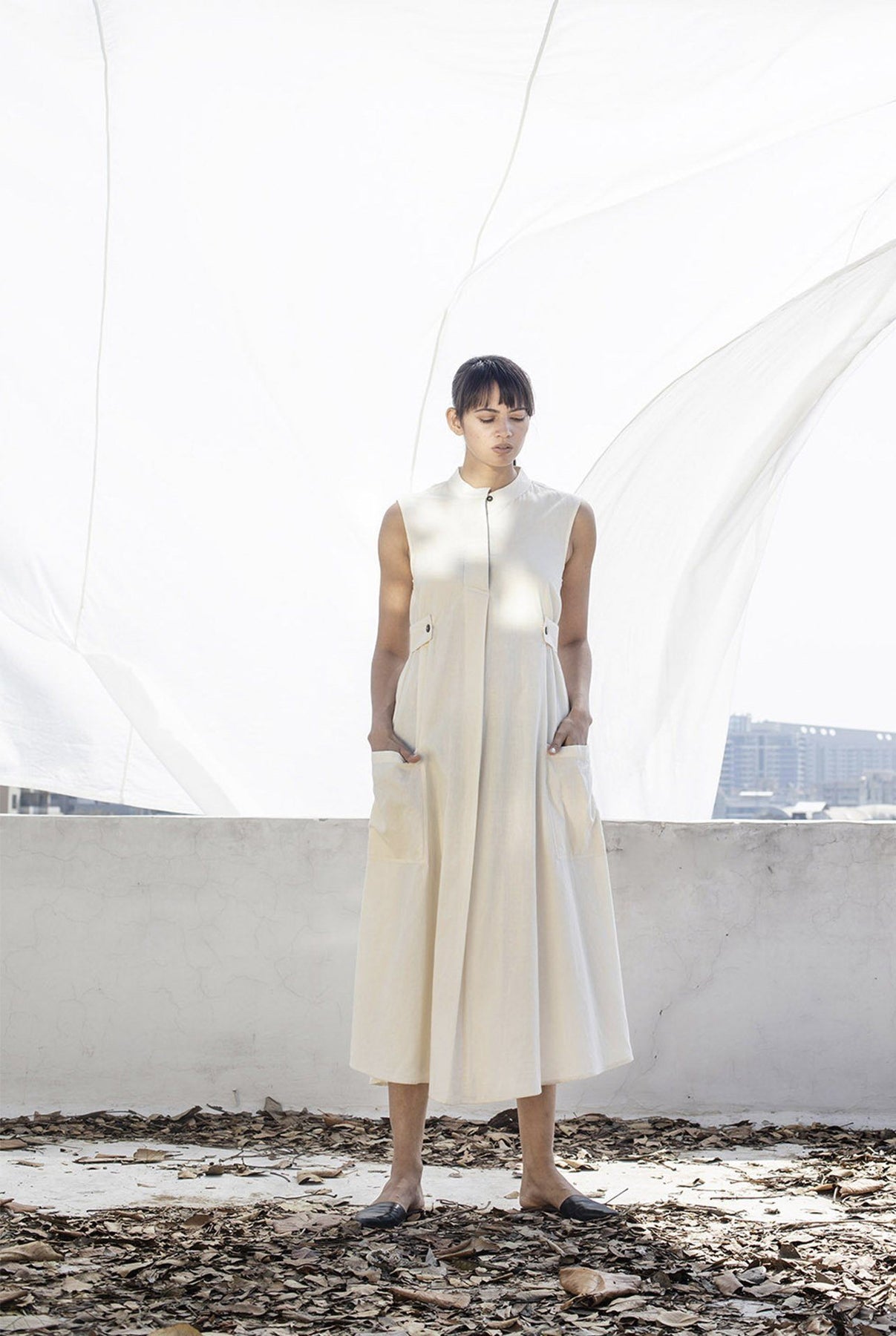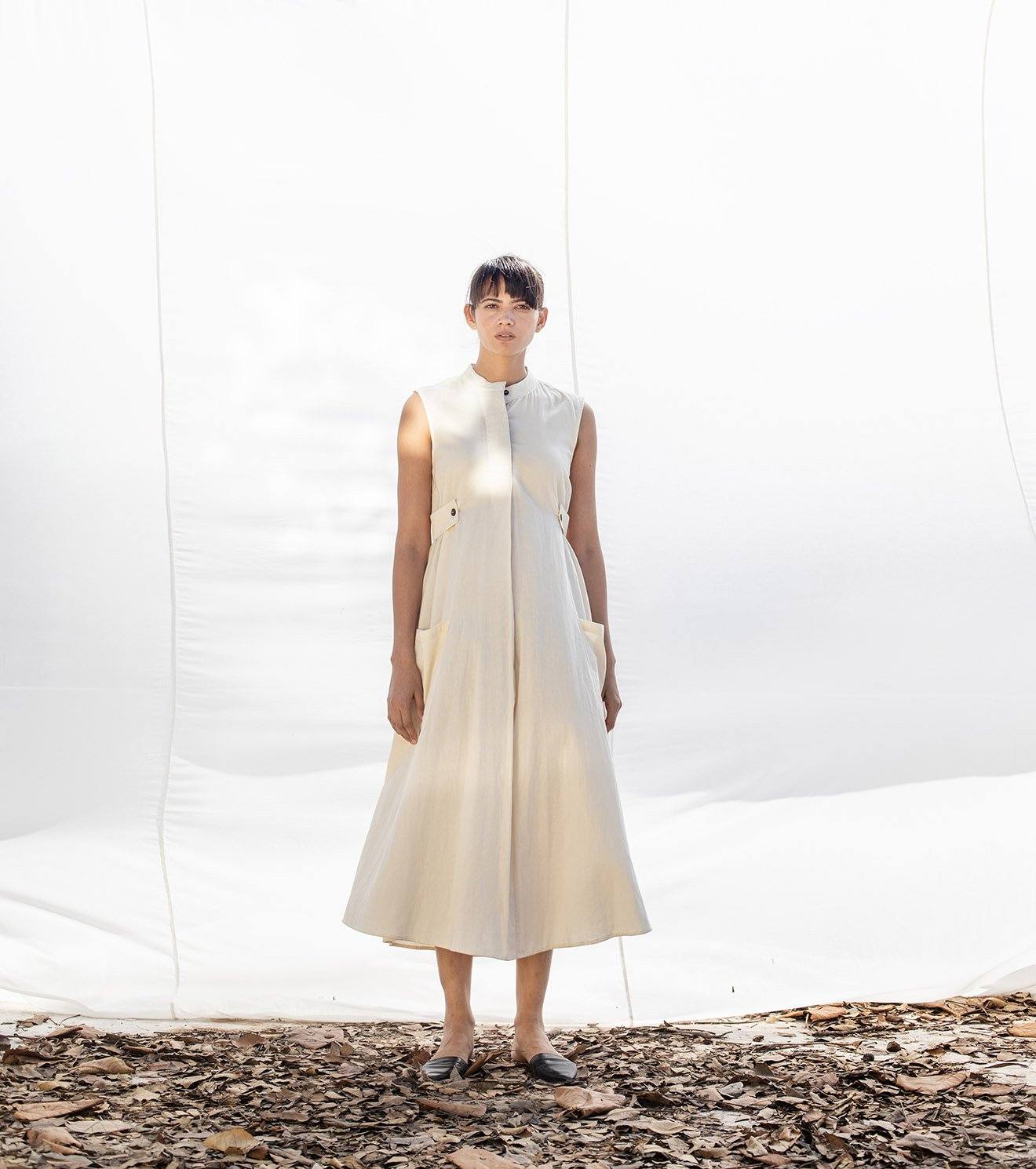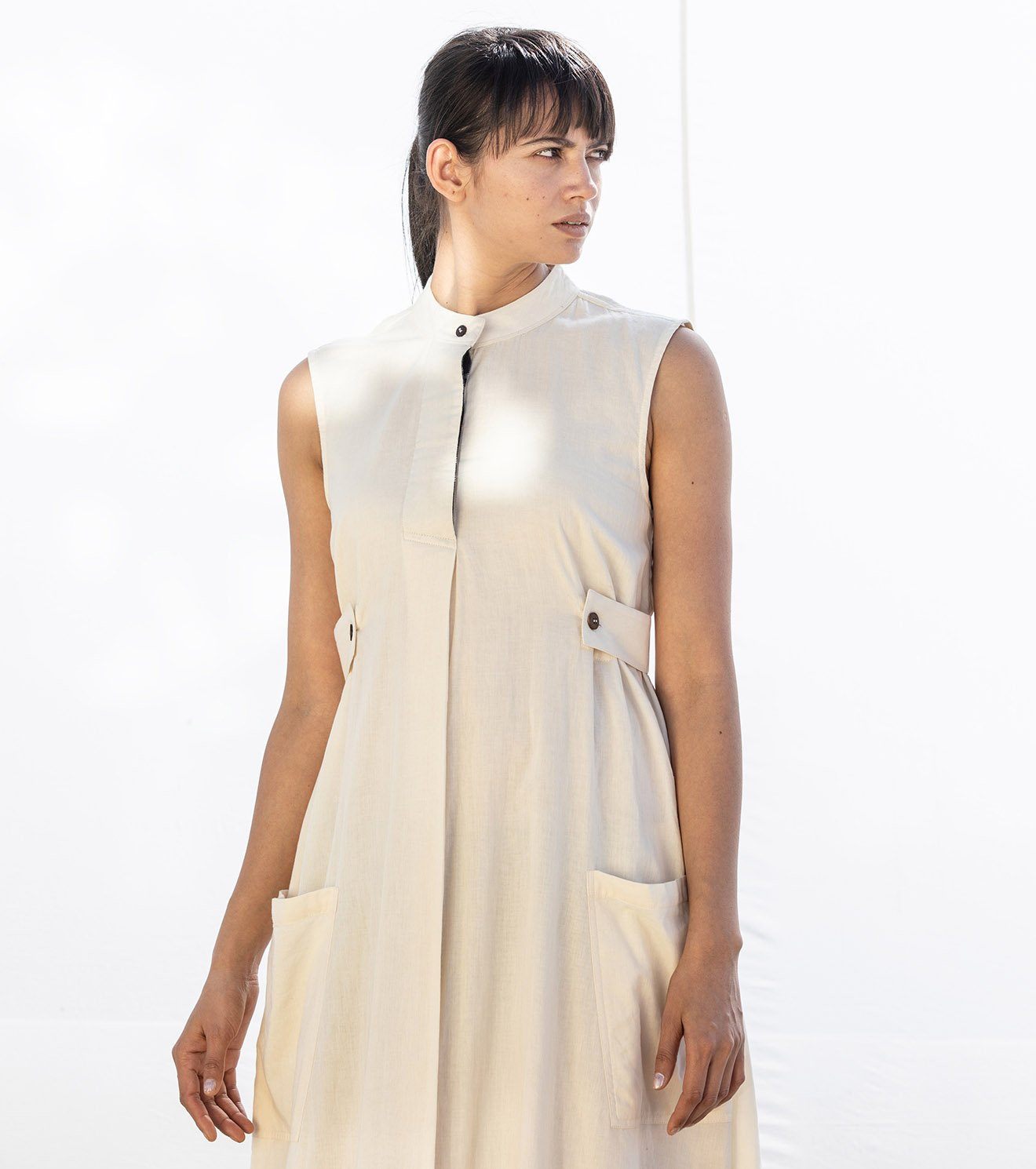 Off-white sleeveless cotton midi with a mandarin collar, regular placket, gathered side seam and kangaroo pouch pockets.