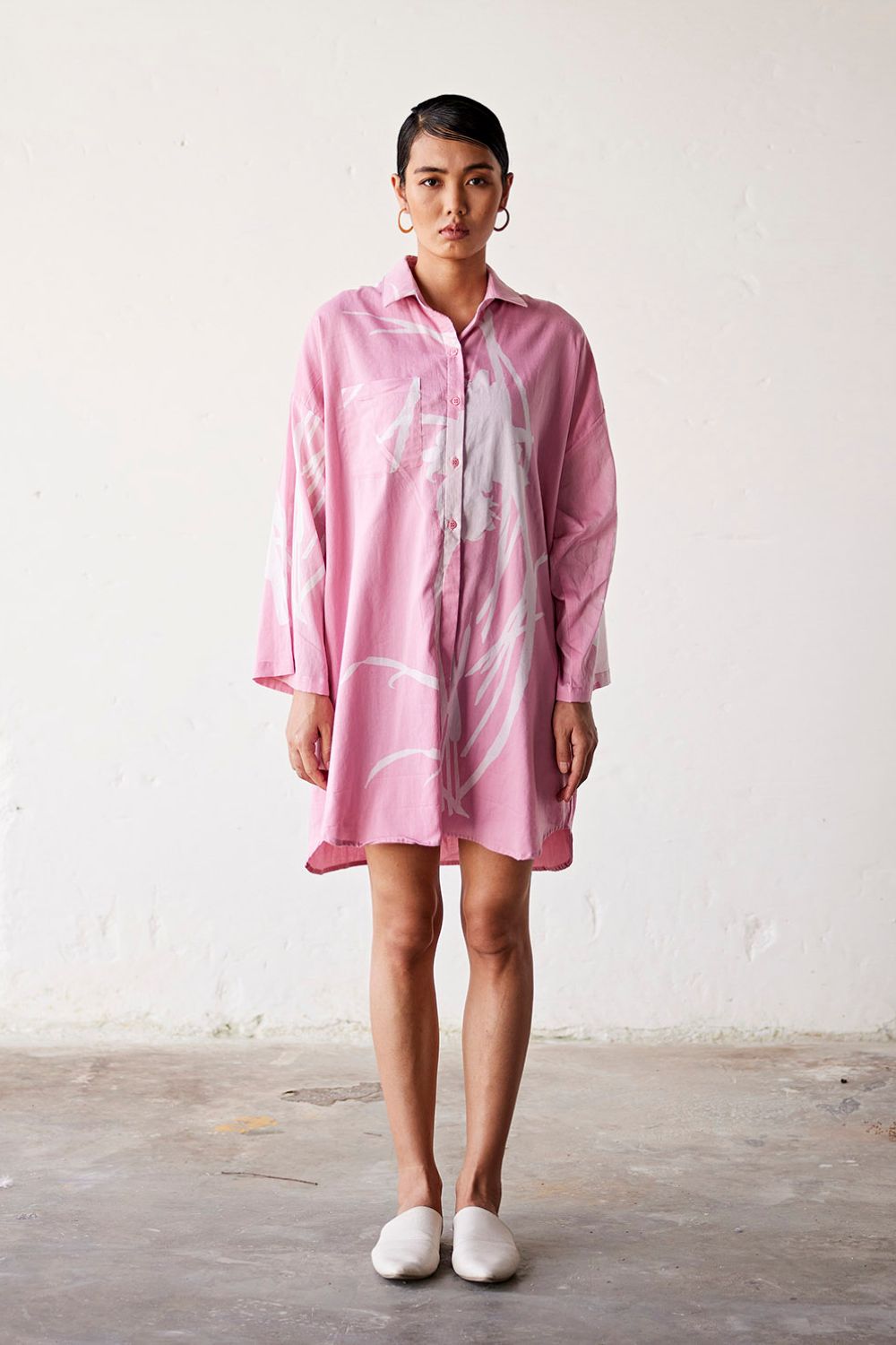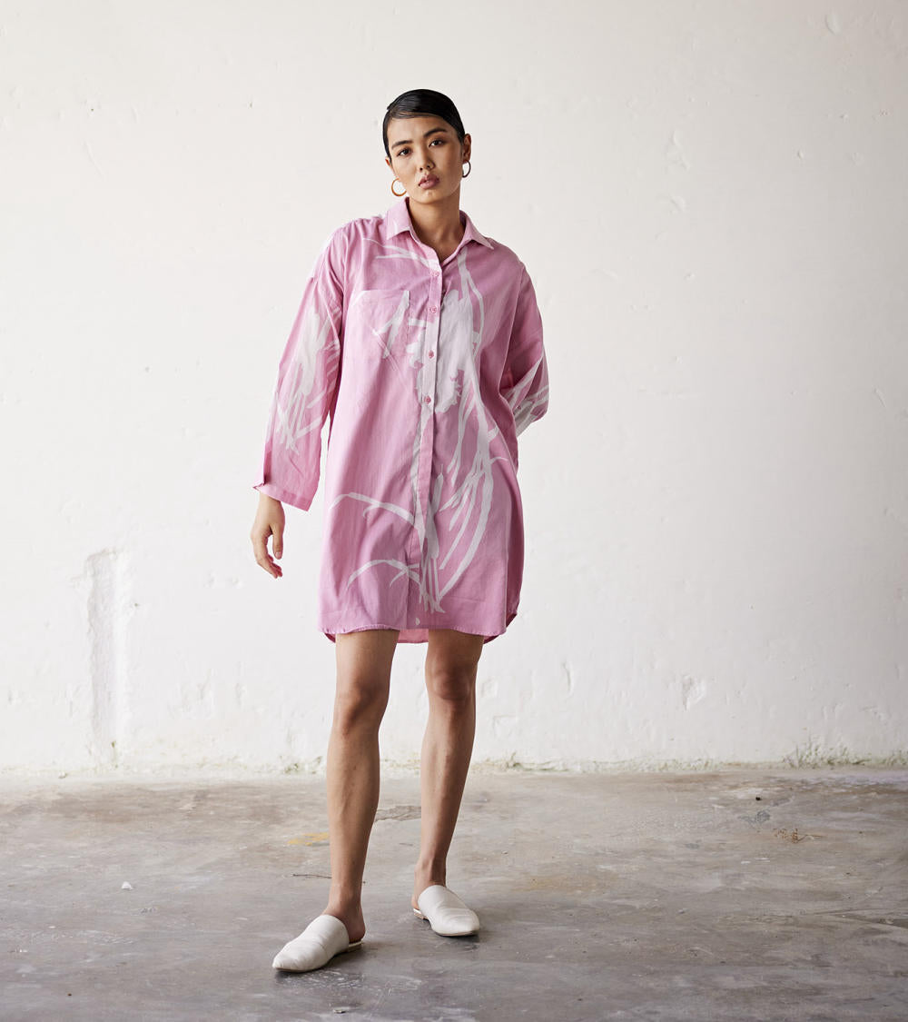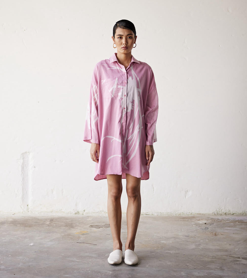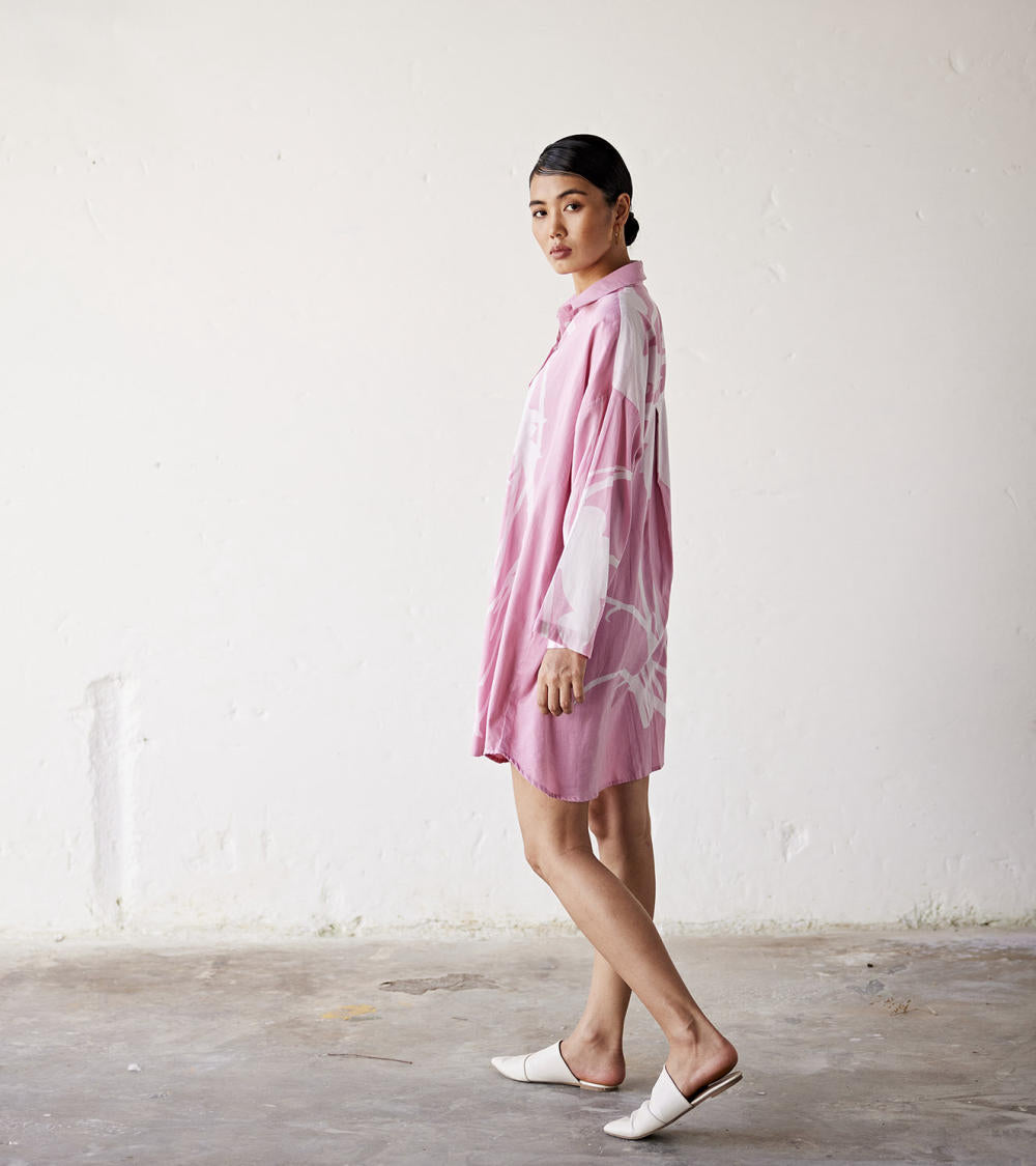 A pale pink floral lino print mul shirt dress with front button opening and a folded sleeve hem.