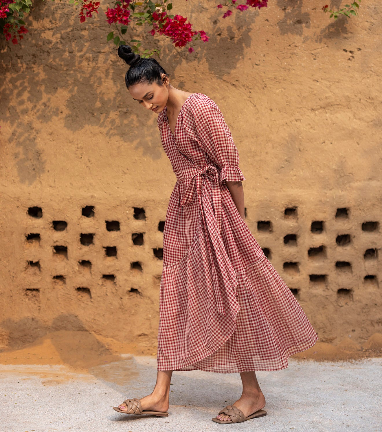 New possibilities and unknown paths. Explore a new side of yourself in liberating silhouettes that let you be. This fluid checked knot wrap dress comes with side pockets.
