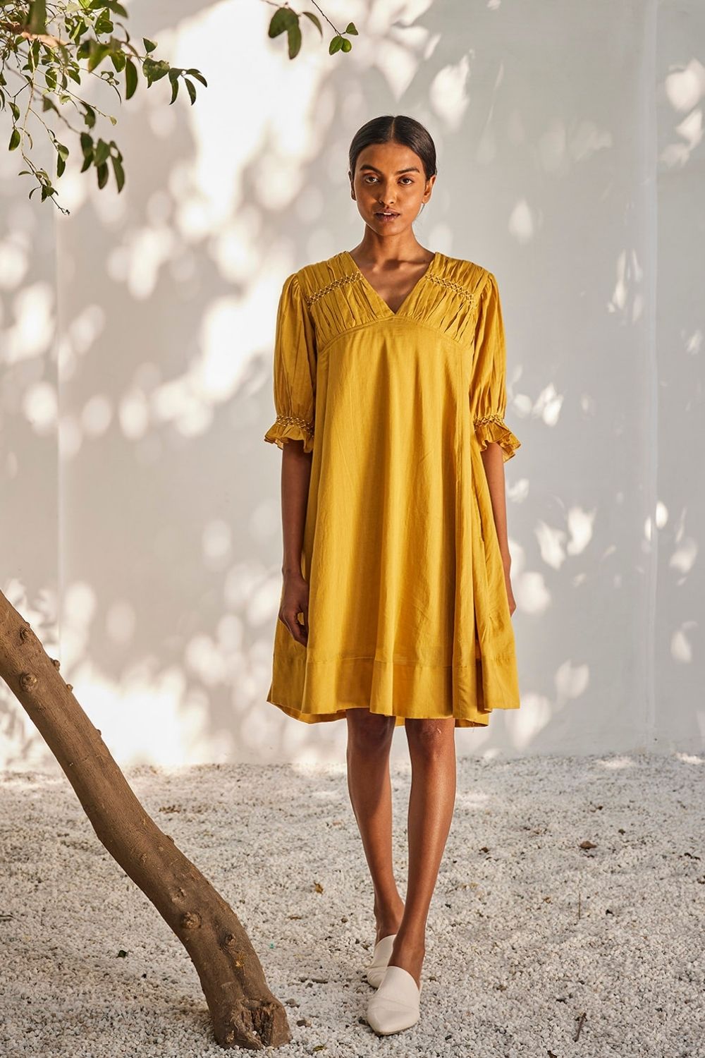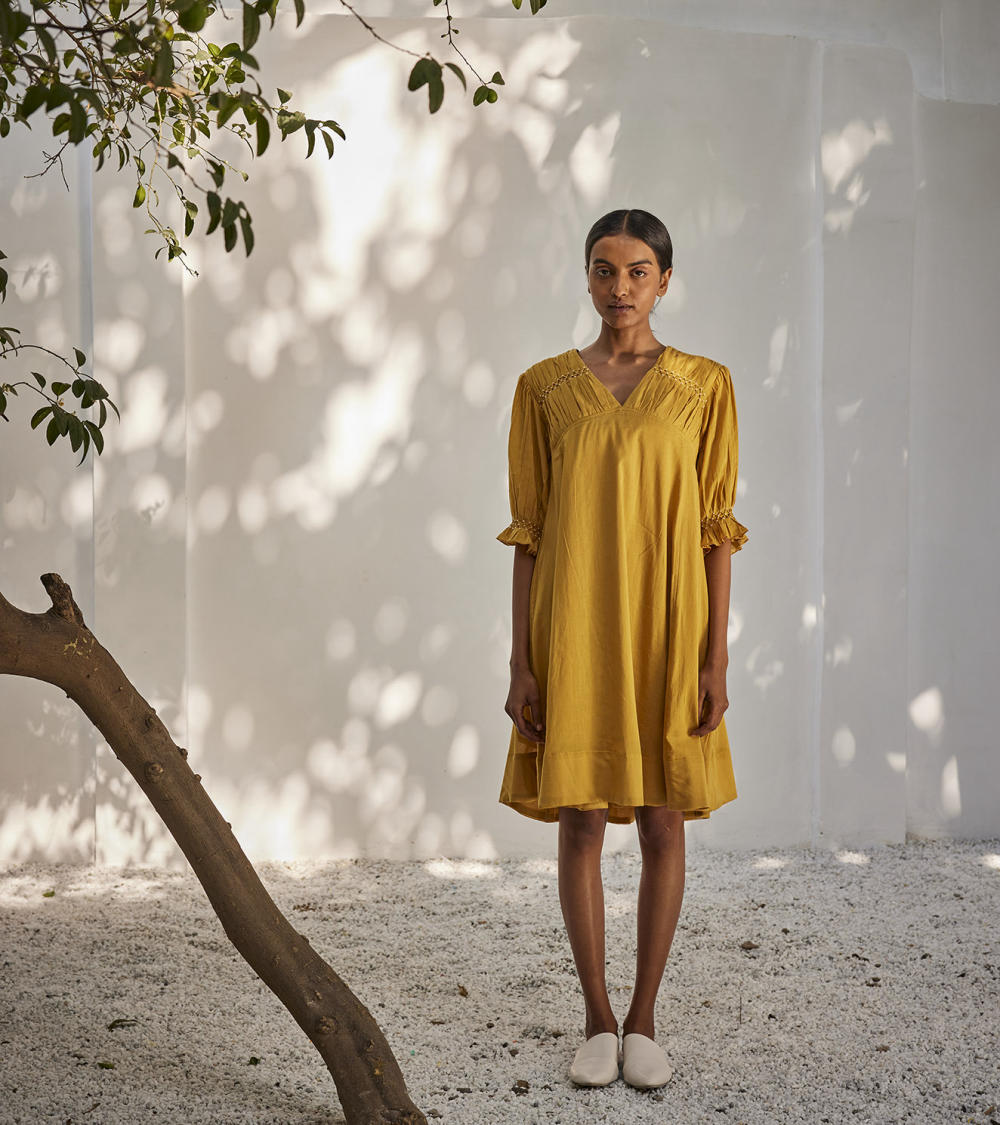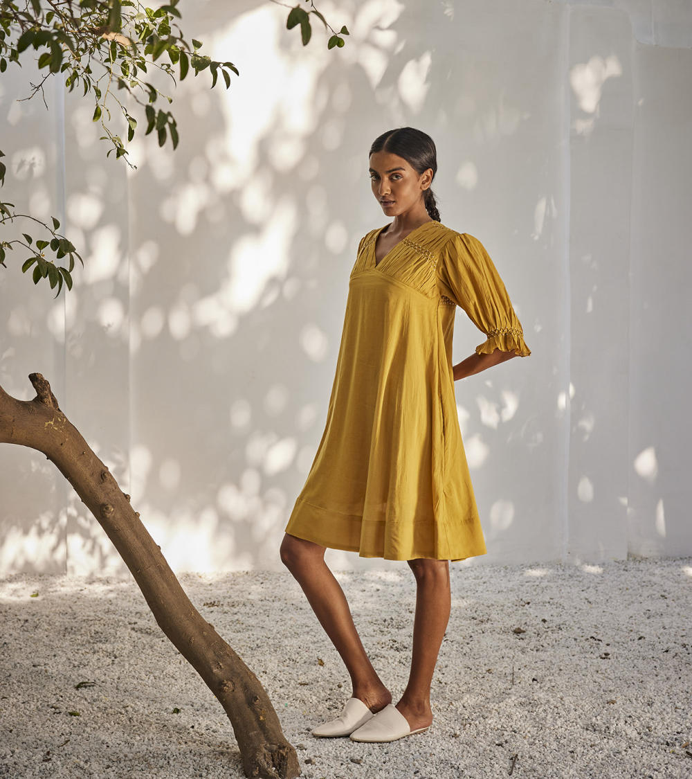A mustard yellow mulmul cotton dress with smocking at the front and the back yoke. The dress comes with puffy sleeves with smocking at the hem.