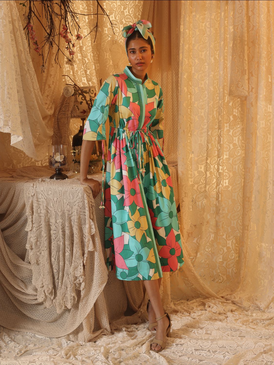 Make a vibrant entrance in this statement dress featuring oversized multicolor florals on soft cotton. With a front button placket and drawstring waist, it offers both adjustability and flair. This piece balances boldness with ease, making it your go-to for tropical escapes or festive summer brunches.