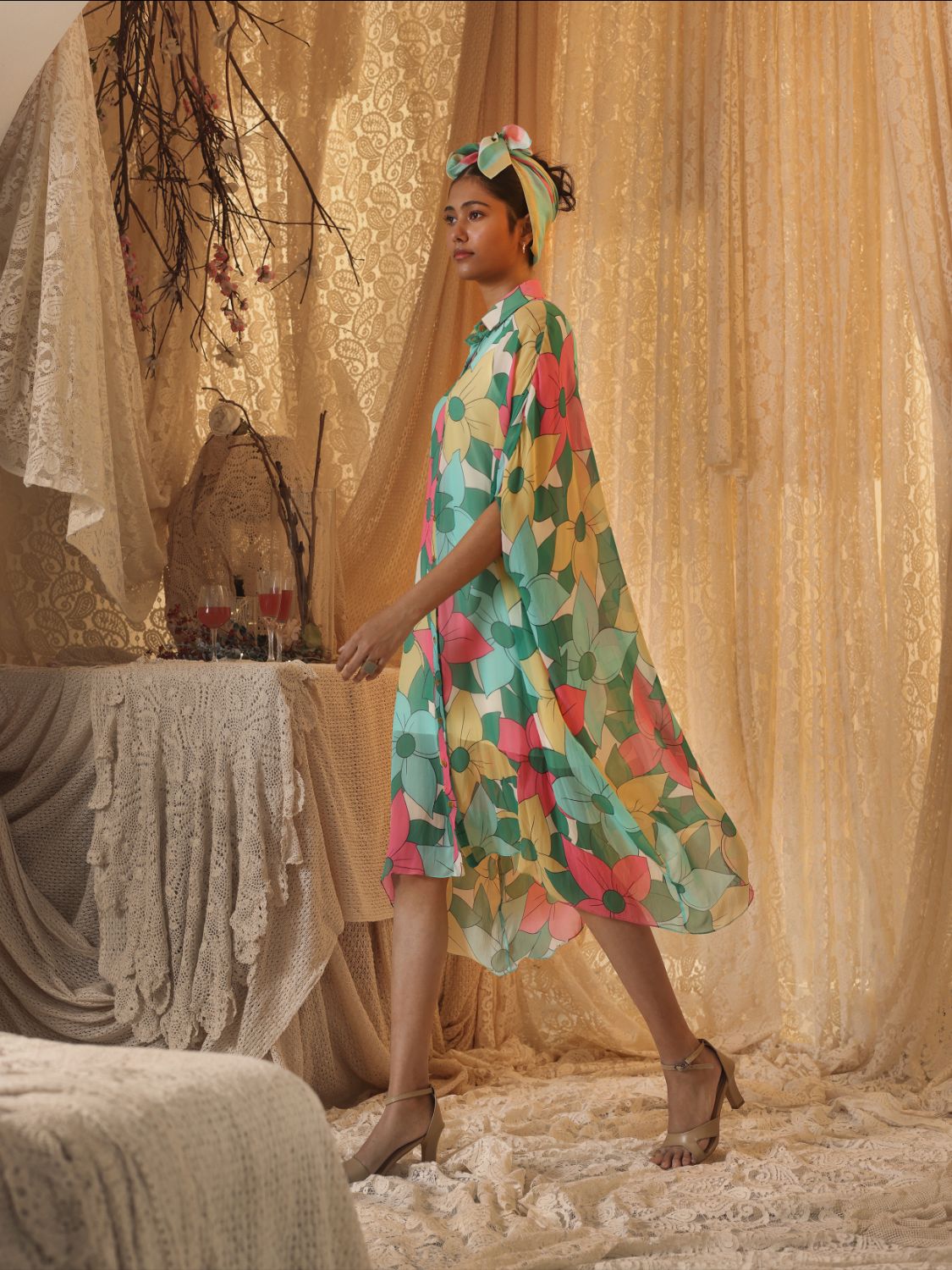 Bold blooms meet sheer grace in this multicolor floral kaftan shirt dress. Crafted in light chiffon and designed with a shirt-style collar, this piece brings a structured twist to a free-flowing silhouette. The soft inner underneath provides coverage while maintaining breathability. Whether buttoned up for brunch or left open as a beach cover-up, this dress is a must-have for your sunny getaways and monsoon retreats alike.