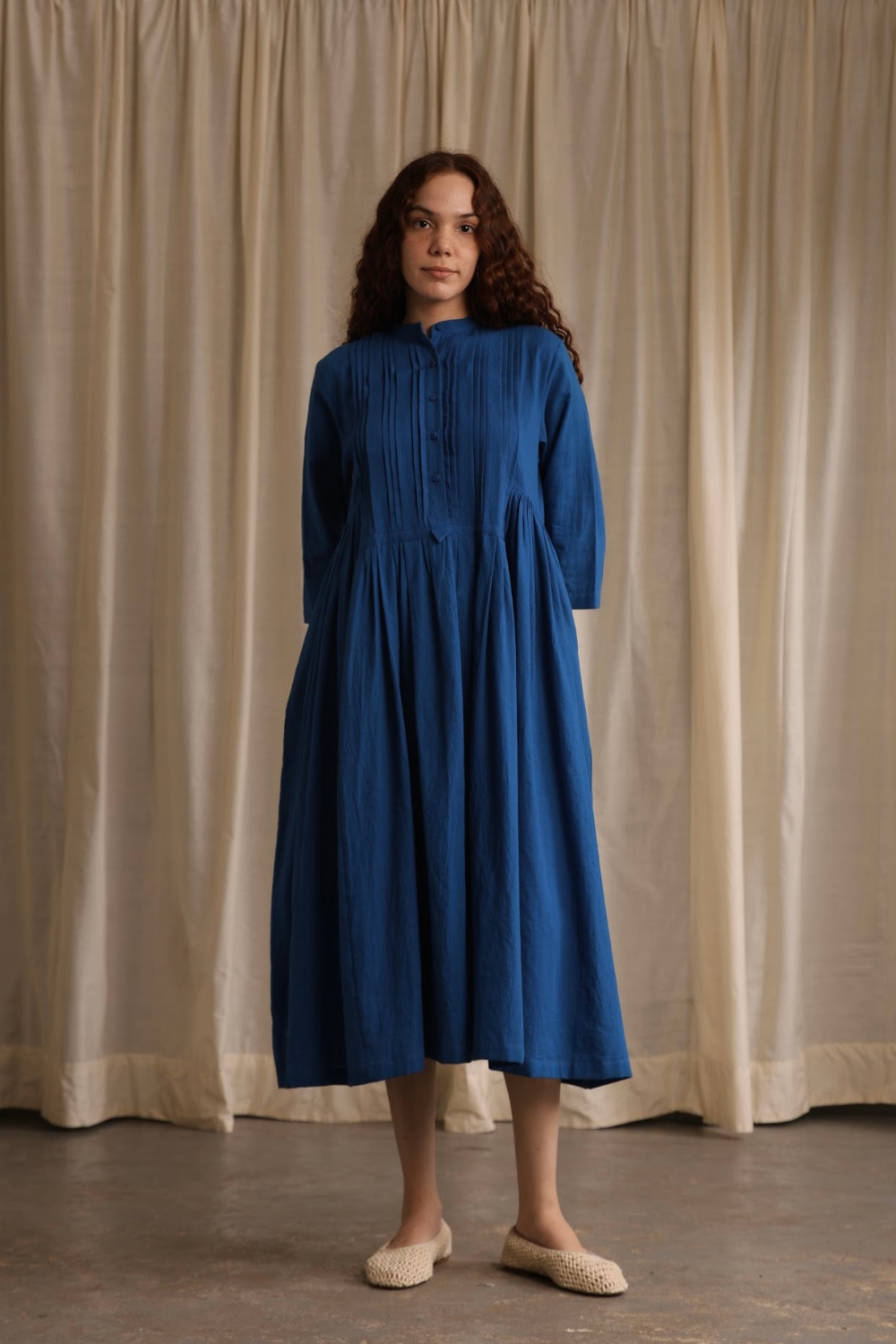 A Mason & Mill favorite, redefined in solid tarpaulin blue. With a lifted back, pleats at the bodice and back, this dress is a perfect balance of structure and effortless grace. Detailed with button and a mandarin collar.